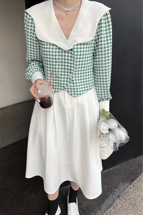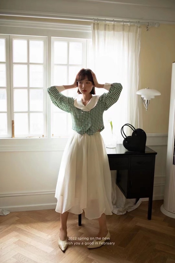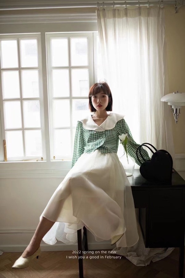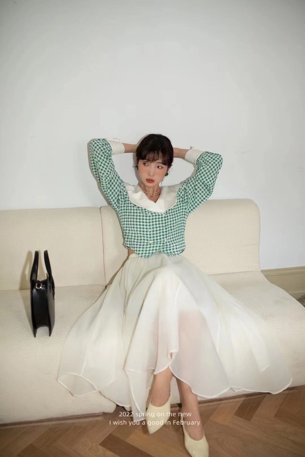 Stay2Weeks 青春撞色娃娃领绿格子上衣 15839