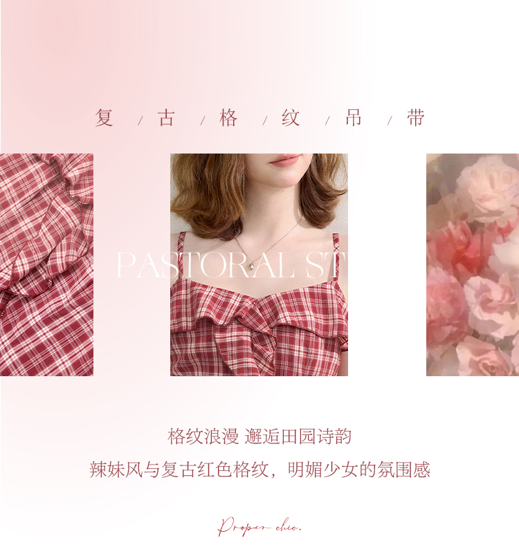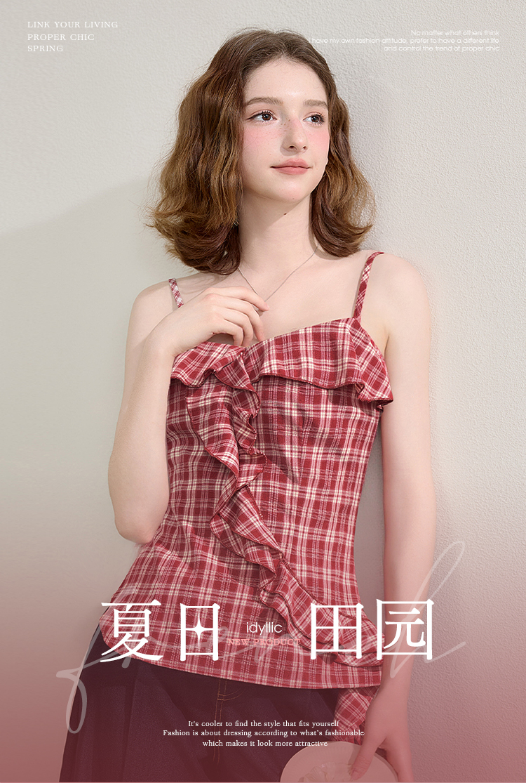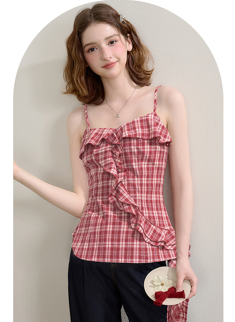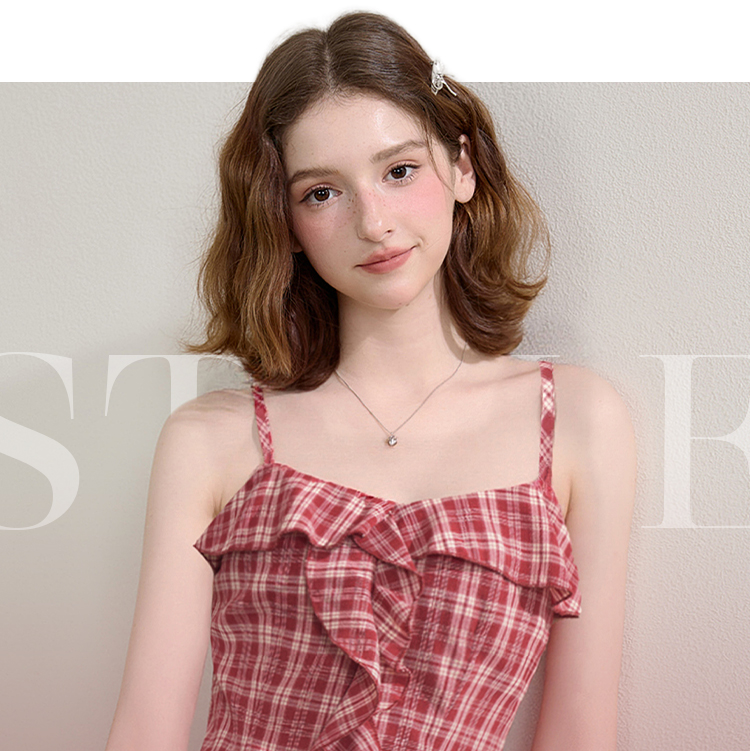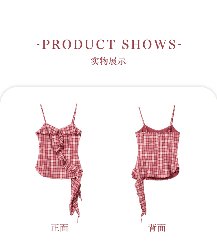 【明媚少女】辣妹复古红色格纹收腰荷叶边吊带女夏季上衣V1050593