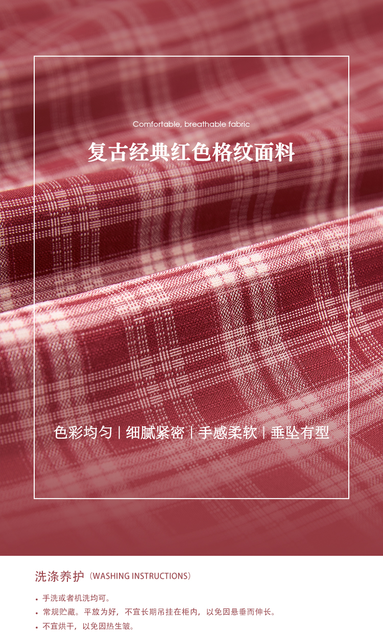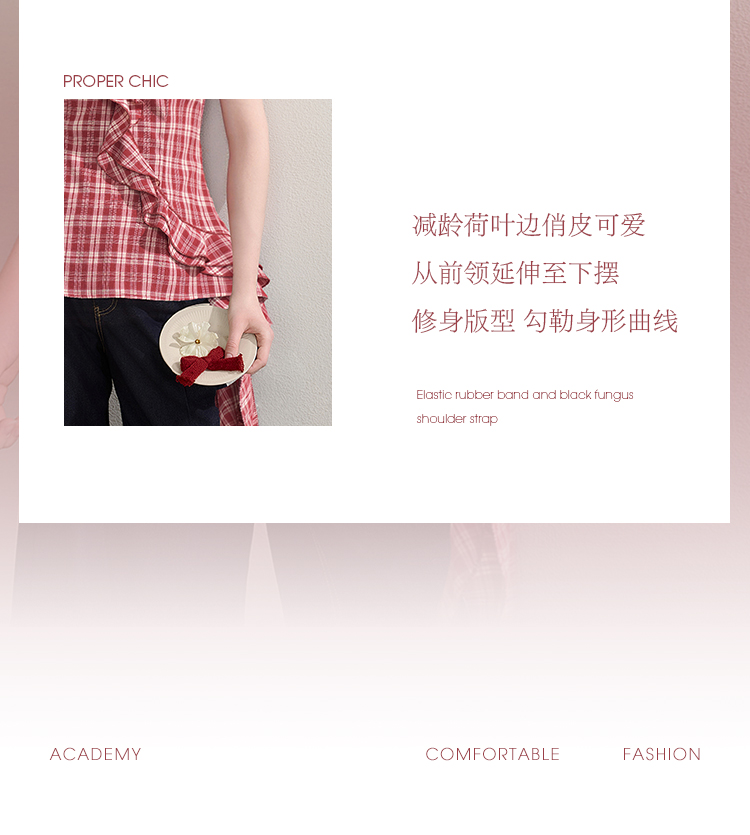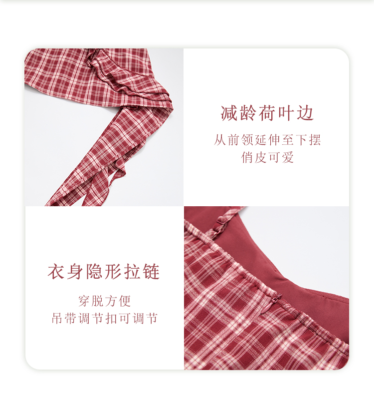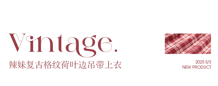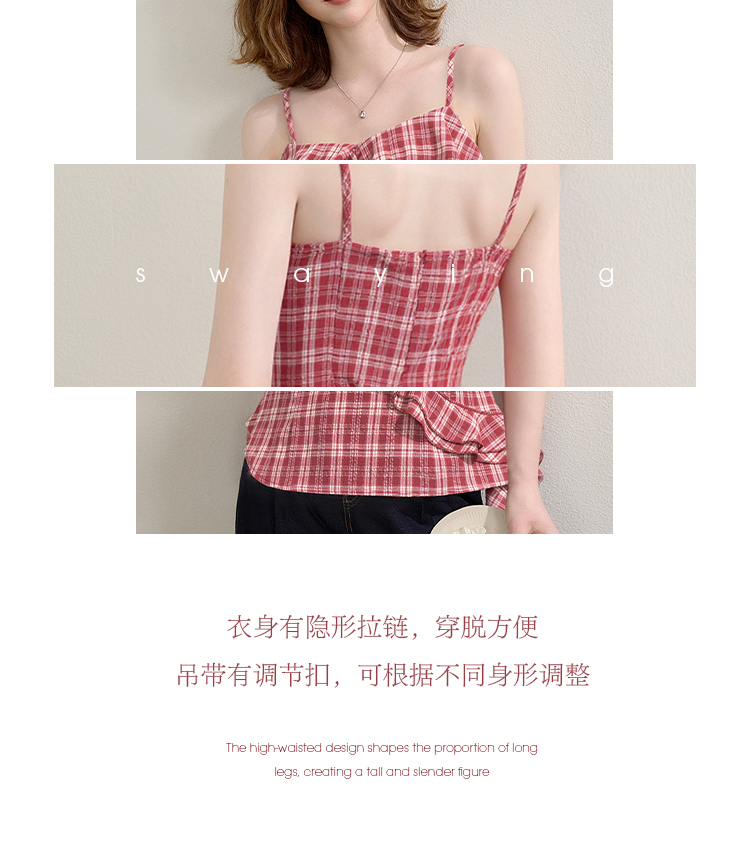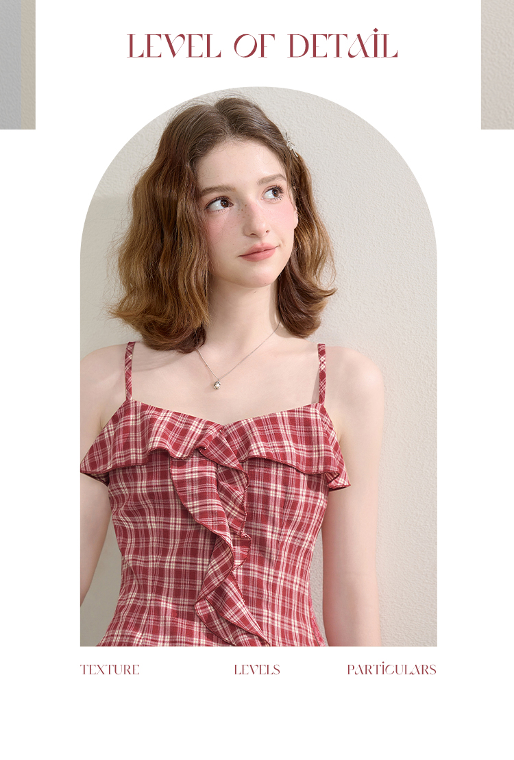 【明媚少女】辣妹复古红色格纹收腰荷叶边吊带女夏季上衣V1050593