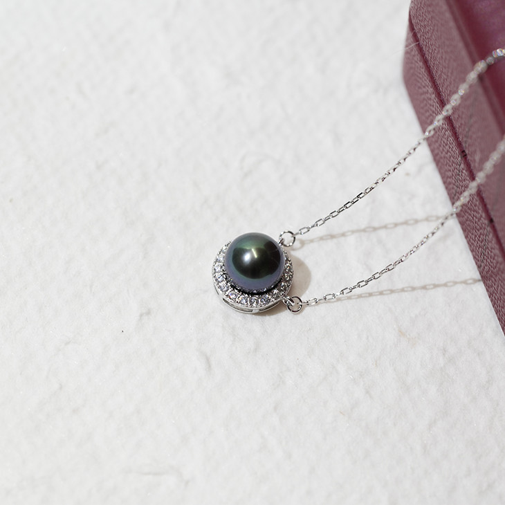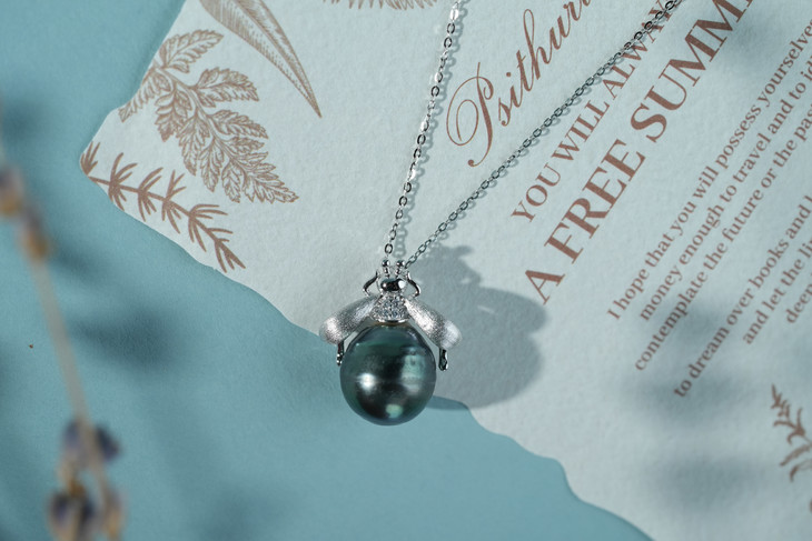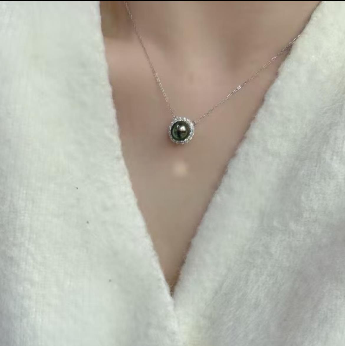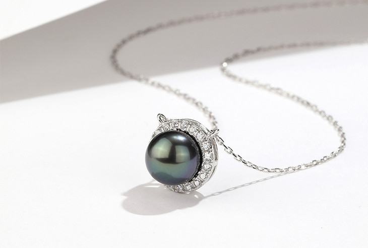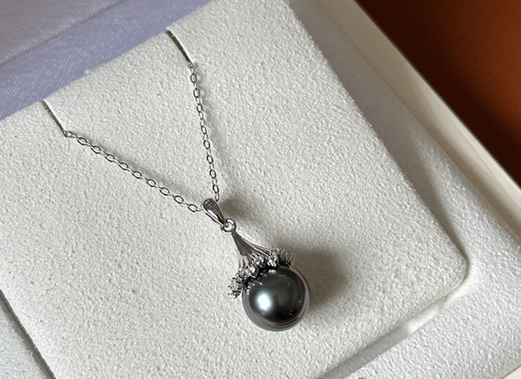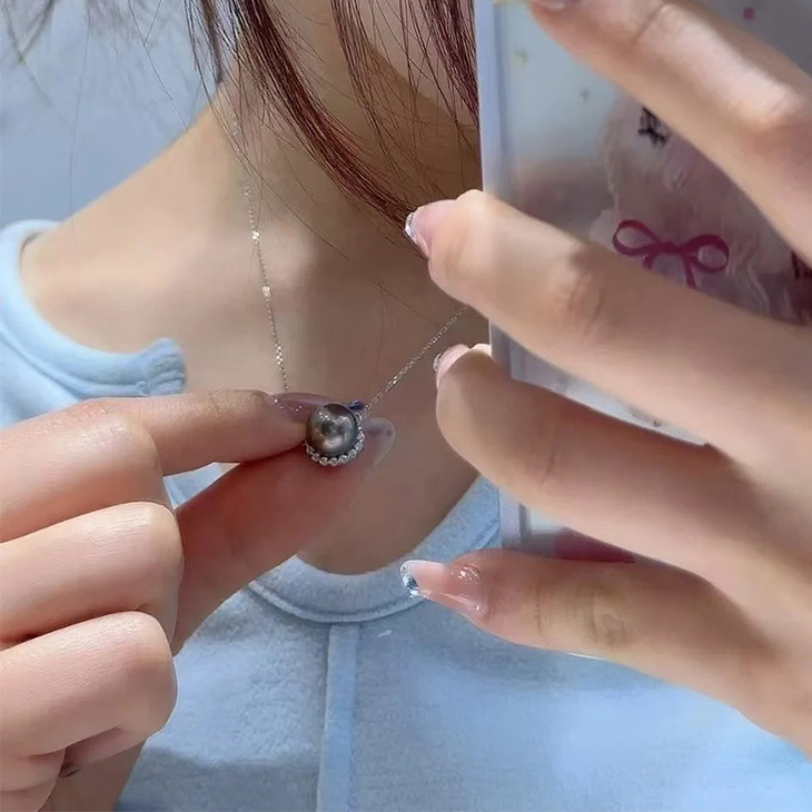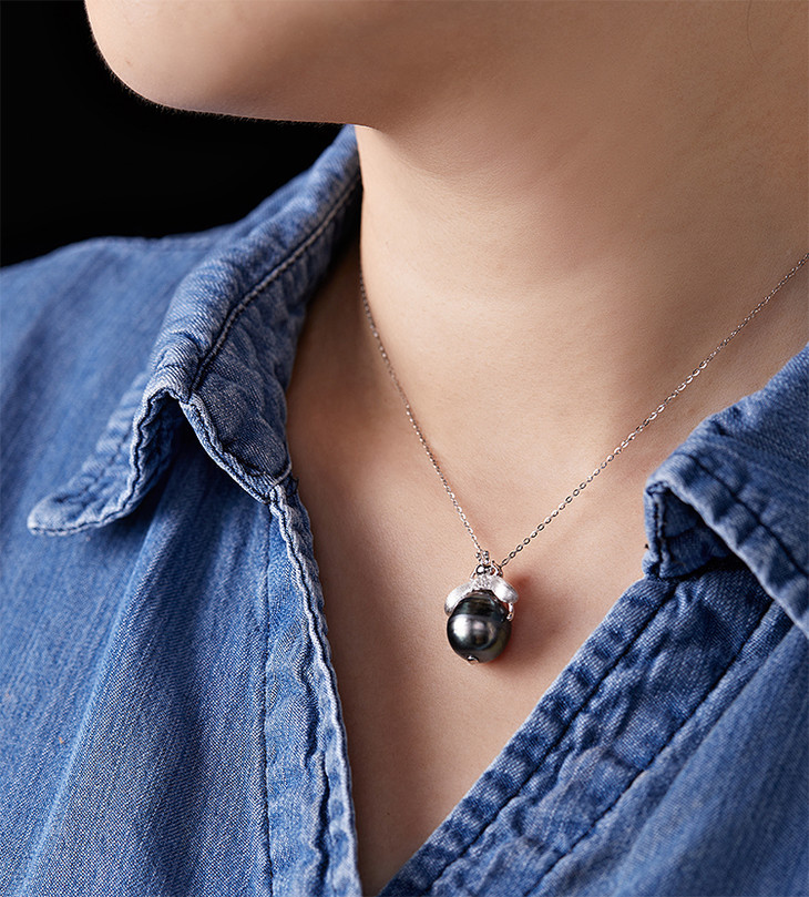 珍珠光泽高贵、内敛,美丽的黑珍珠吊坠绕过脖子、划过锁骨、垂坠在胸前,让你的气质更加矜贵。