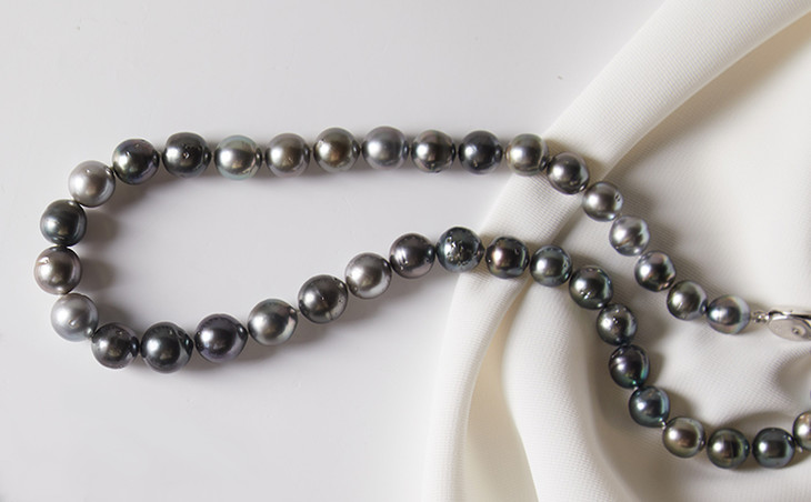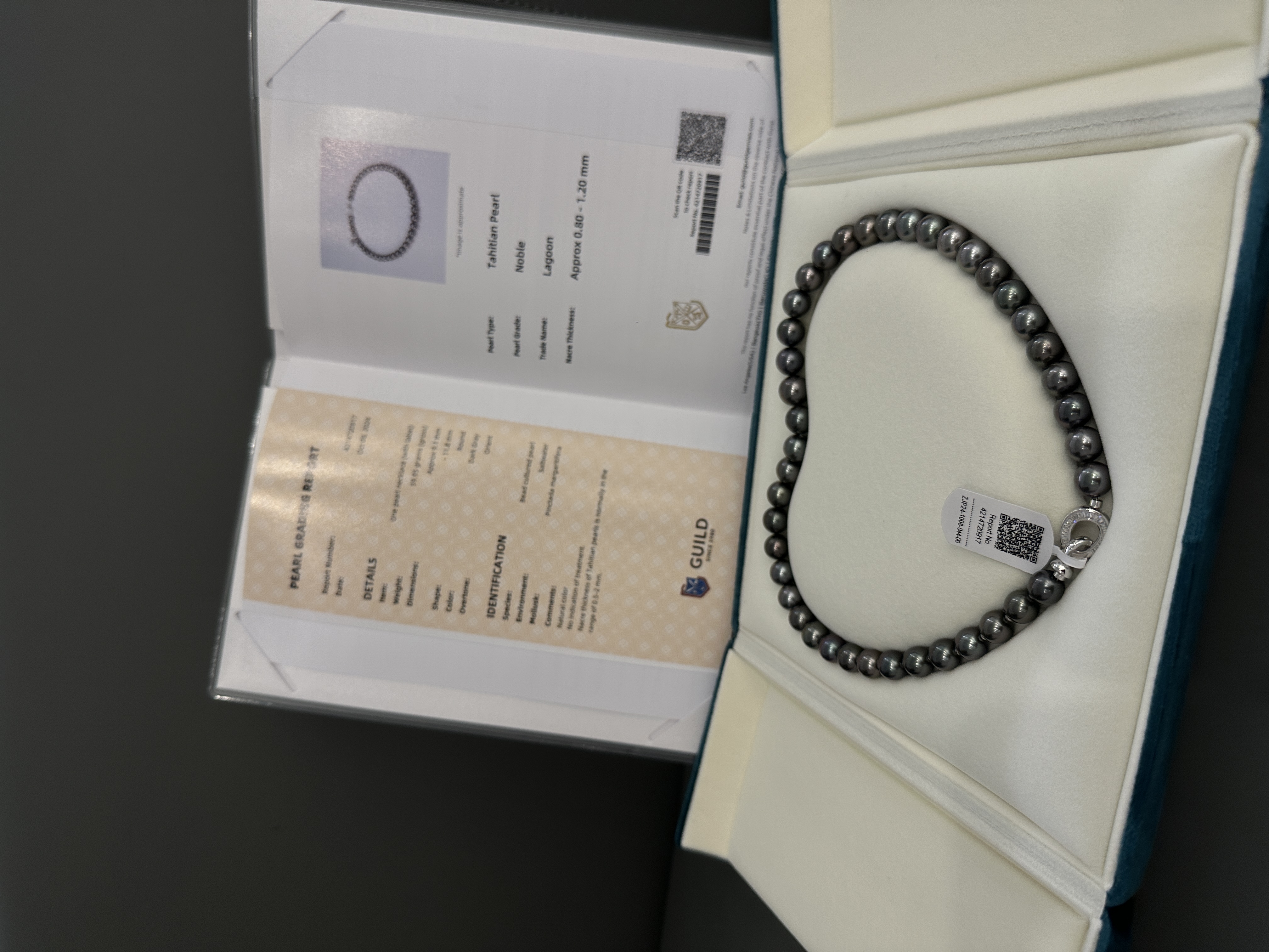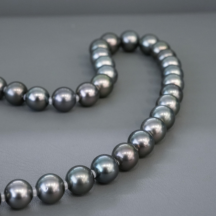 我们这一款每一颗珠的圆度、光泽、表面瑕疵、匹配度、珠层厚度都达到了Noble的级别,且颜色为Dark Gray(深灰级别)是市面上难得的空中品质。