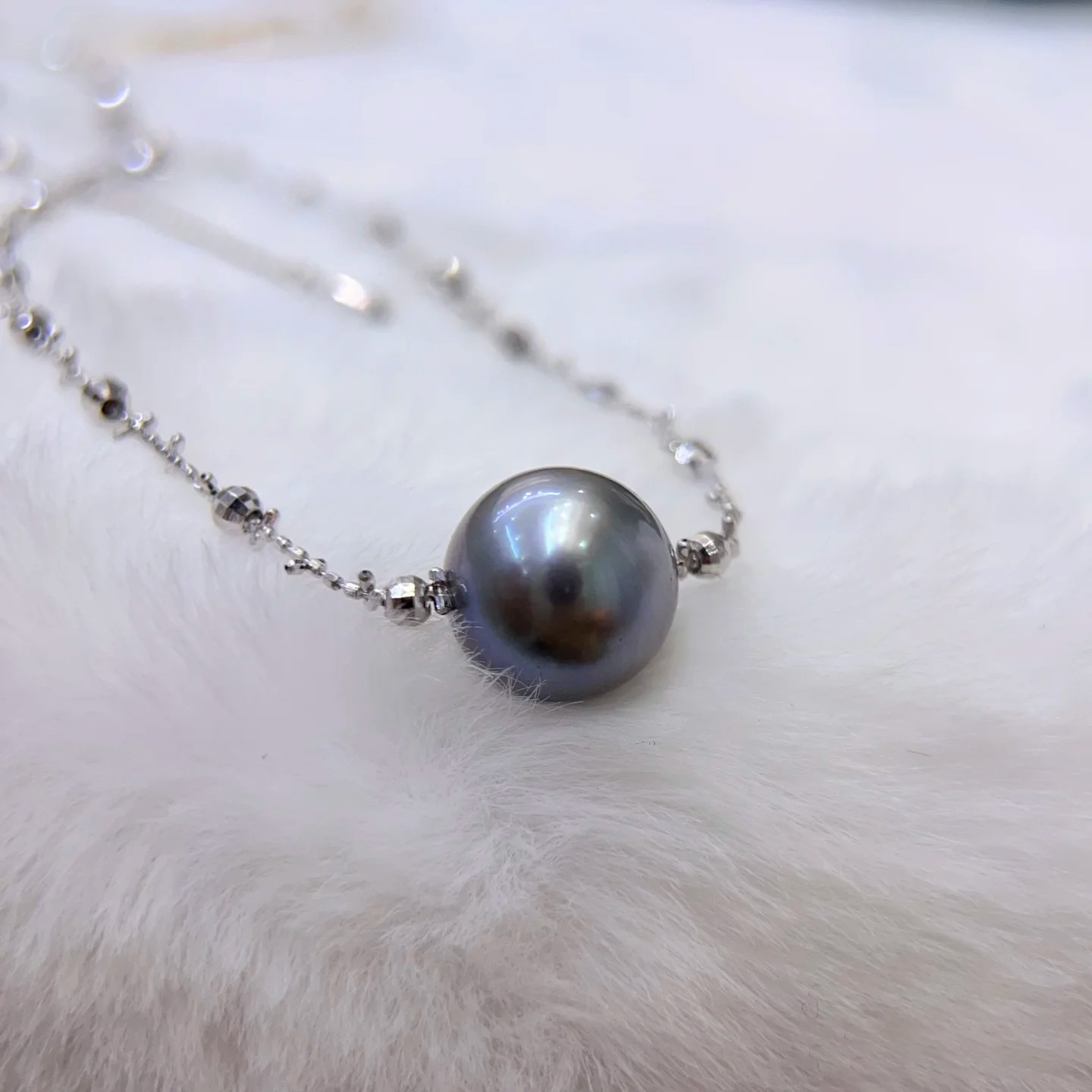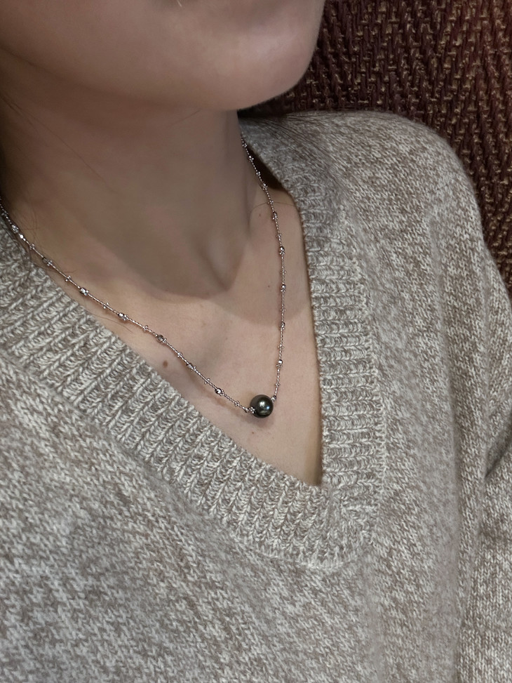 这条项链的设计感很独特,超超超迷你的925银小方糖和切割款银珠隔珠,错落有致,自带星光感,和那颗带着晕彩的黑珍珠十分搭。