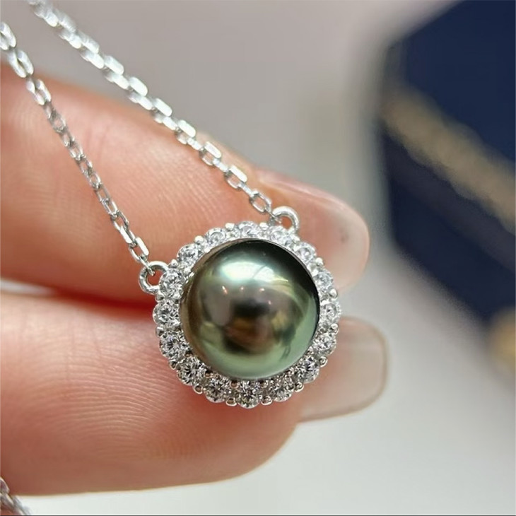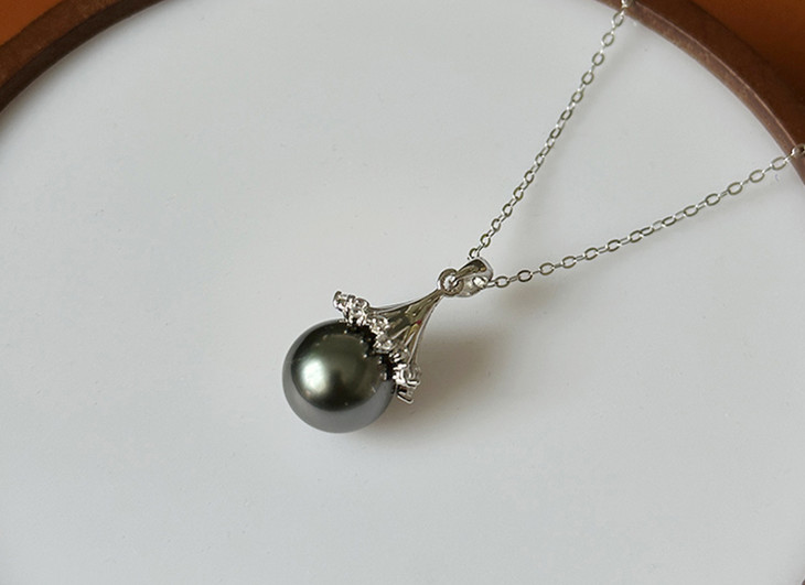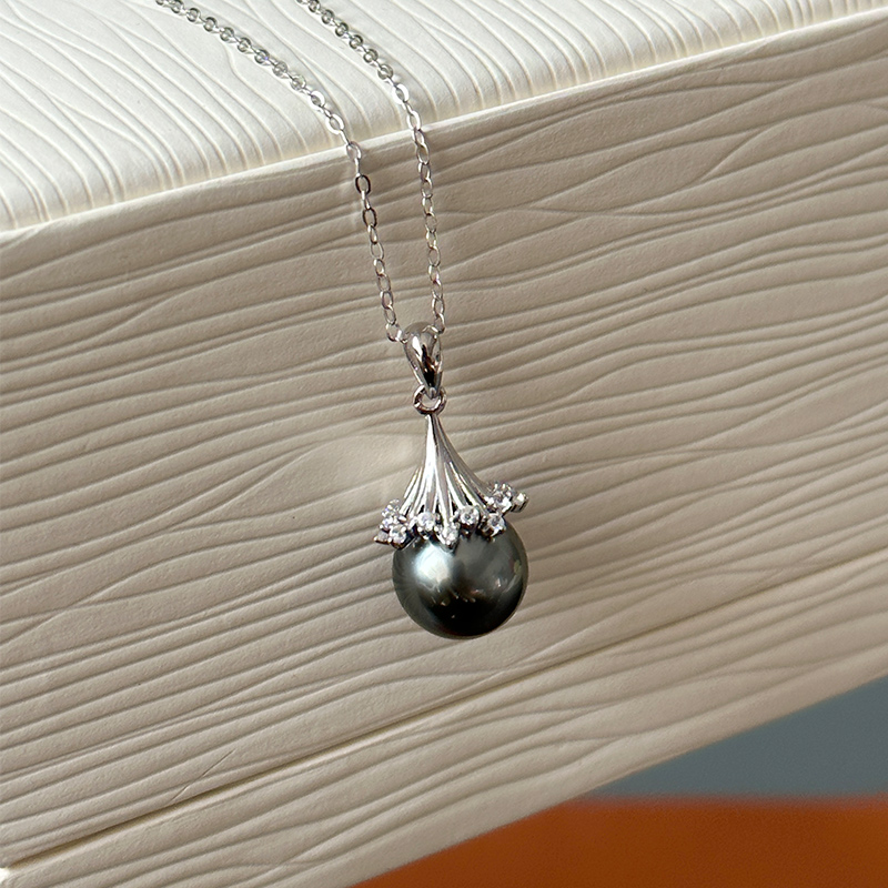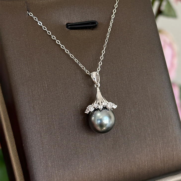 精致锆石花蕊大溪地黑珍珠吊坠
