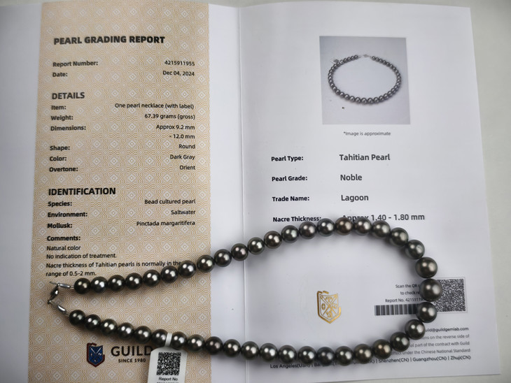 附带吉尔德(GUILD)证书,拉贡级别珍藏级大溪地黑珍珠项链(8-12mm)。