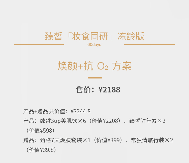 【已下架】预售发货 | 臻皙 3UP美肌饮*6盒+驻年素*2盒(赠甄格7天焕肤套装*1+常独清旅行装*2) [F类]