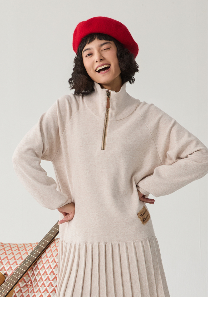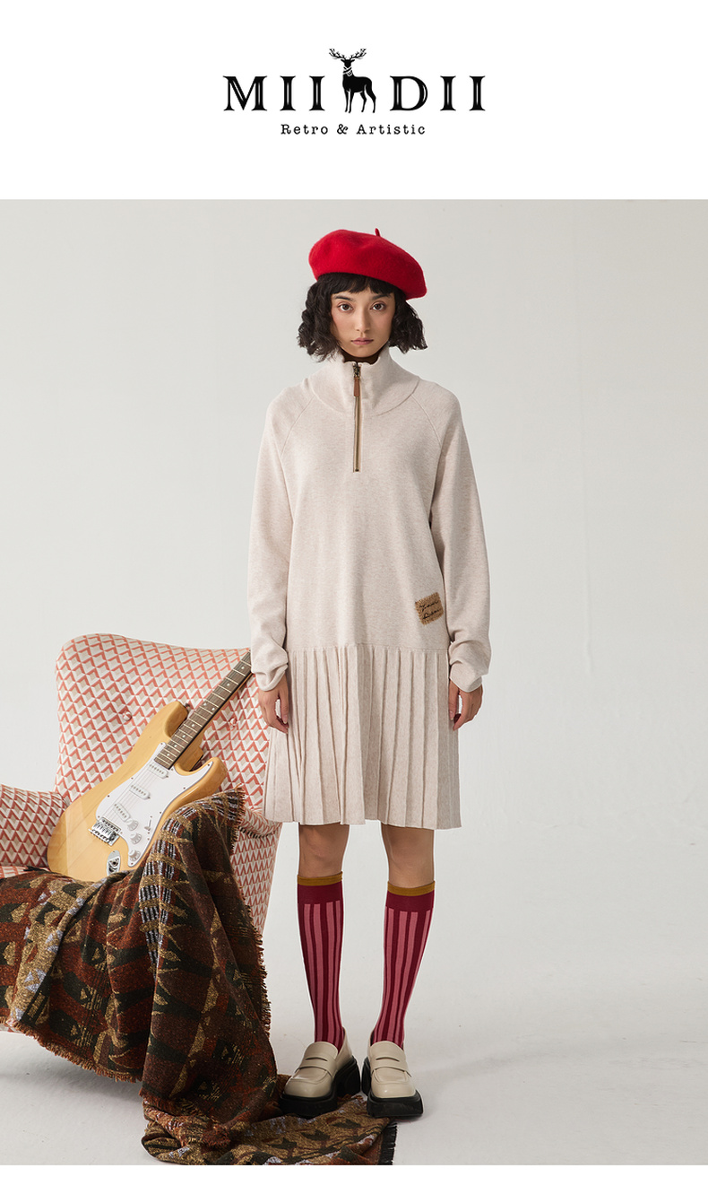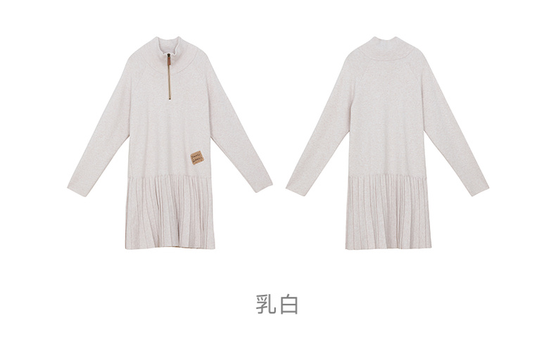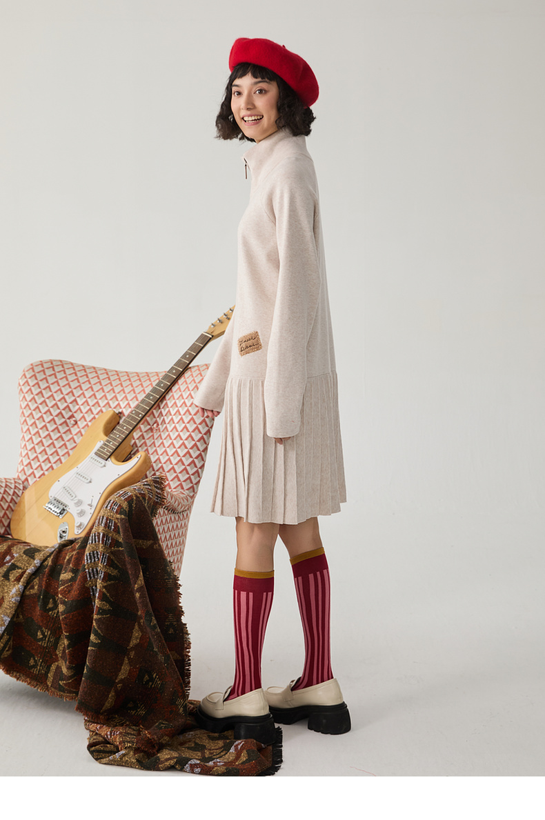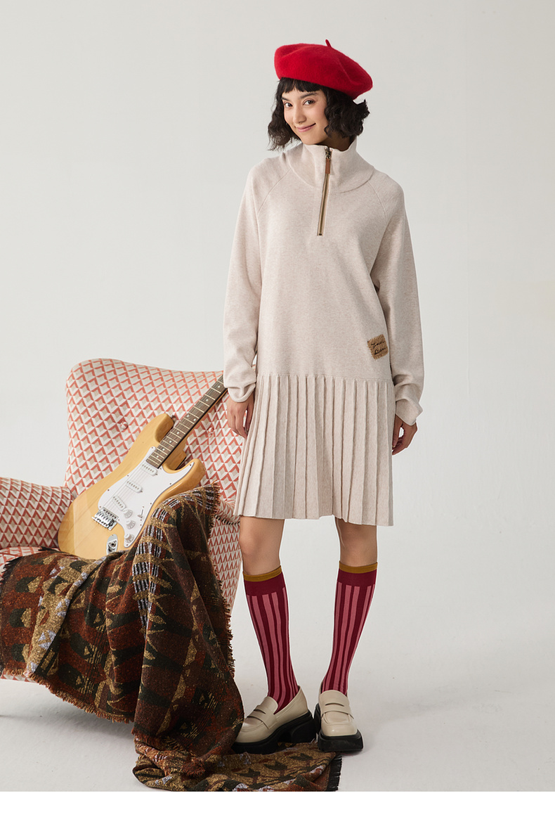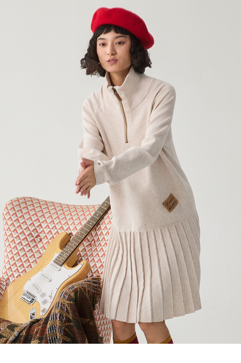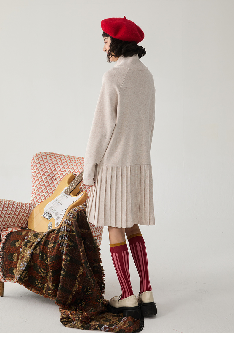 谜底针织连衣裙女2024冬季新品时尚高领A型直筒裙百褶裙244MZ1890