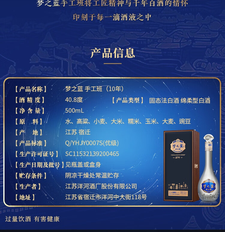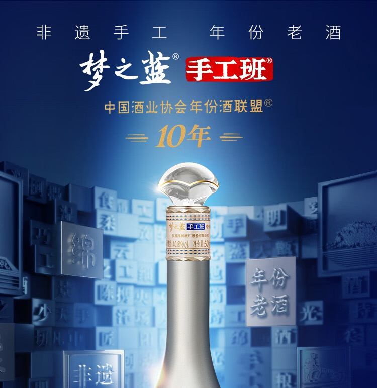 洋河 梦之蓝40.8度手工班10年500ml单瓶装(整箱为4瓶)