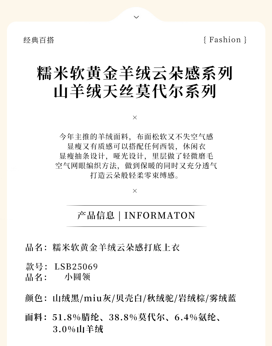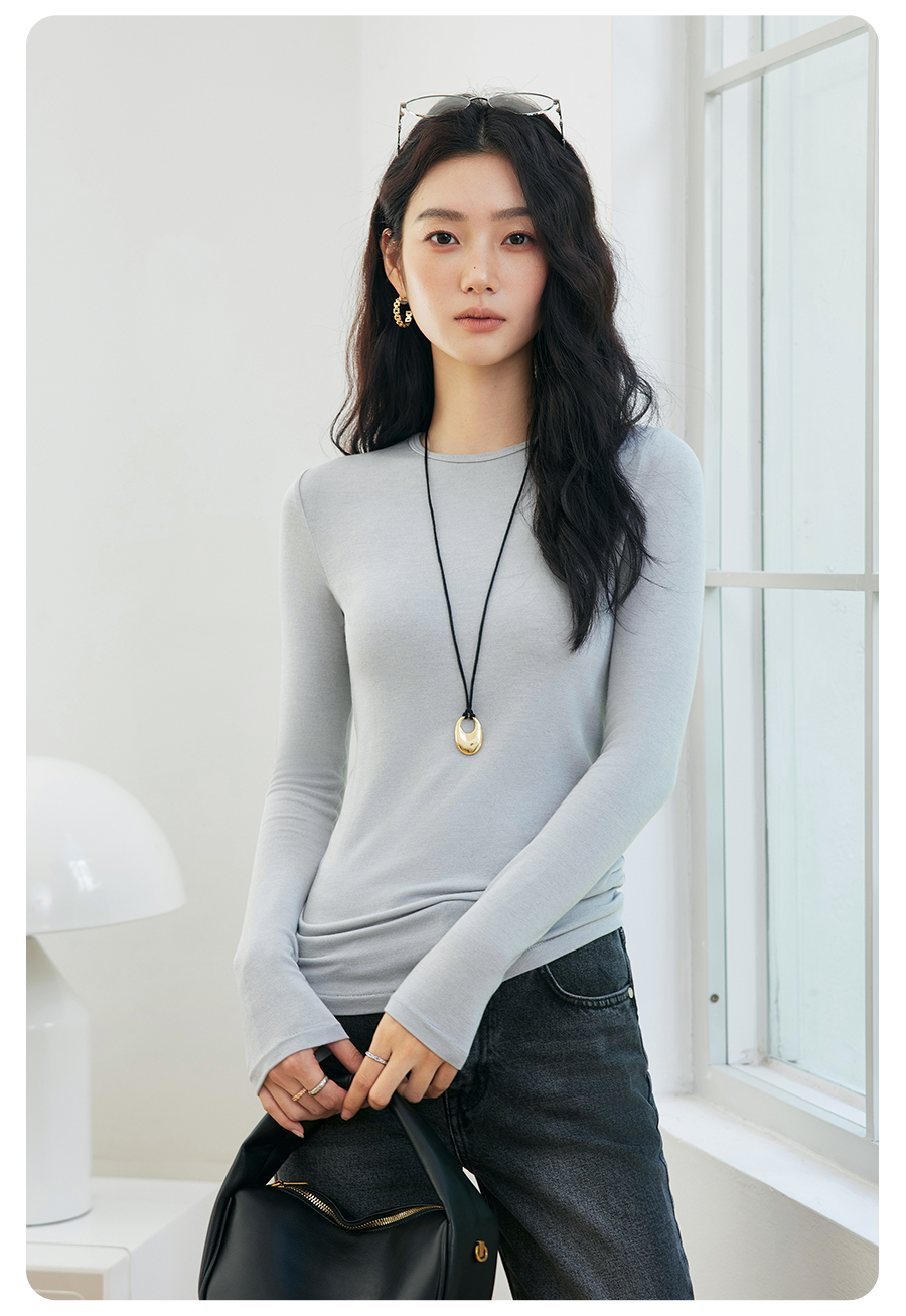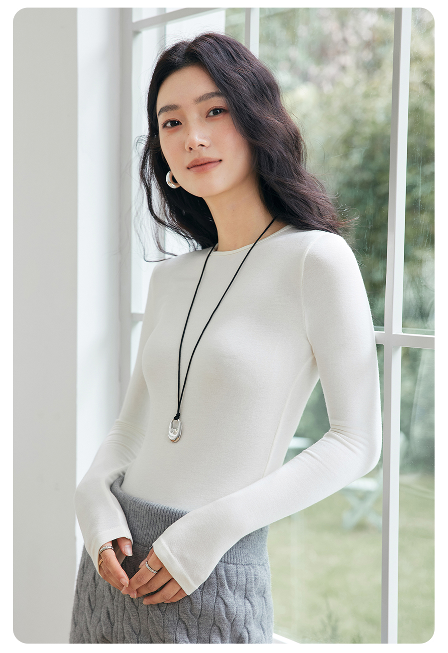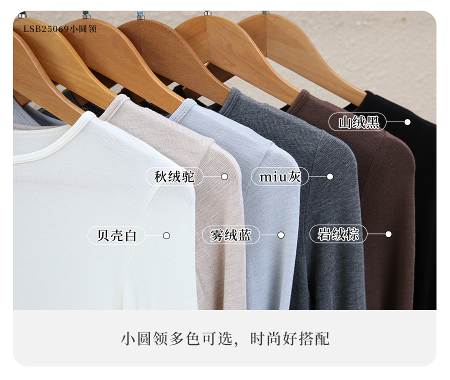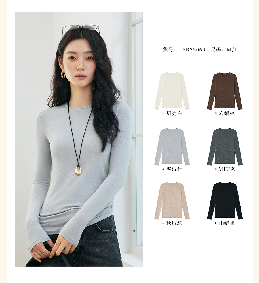 轻磨毛天丝莫代尔打底 添加软黄金羊绒 软软糯糯亲肤 云朵感打底长袖上衣 经典简约色系 上身显瘦收肉女装