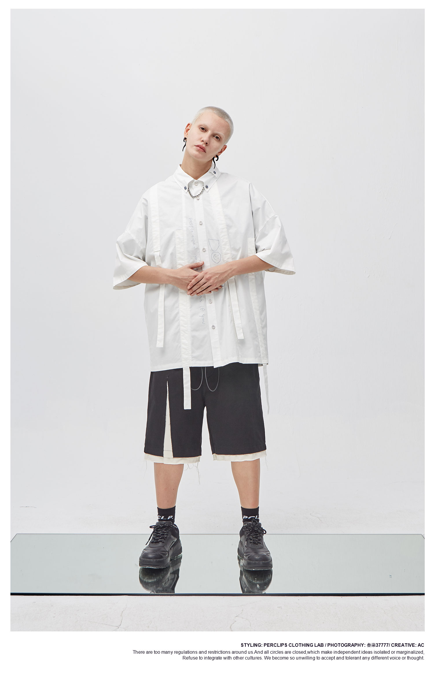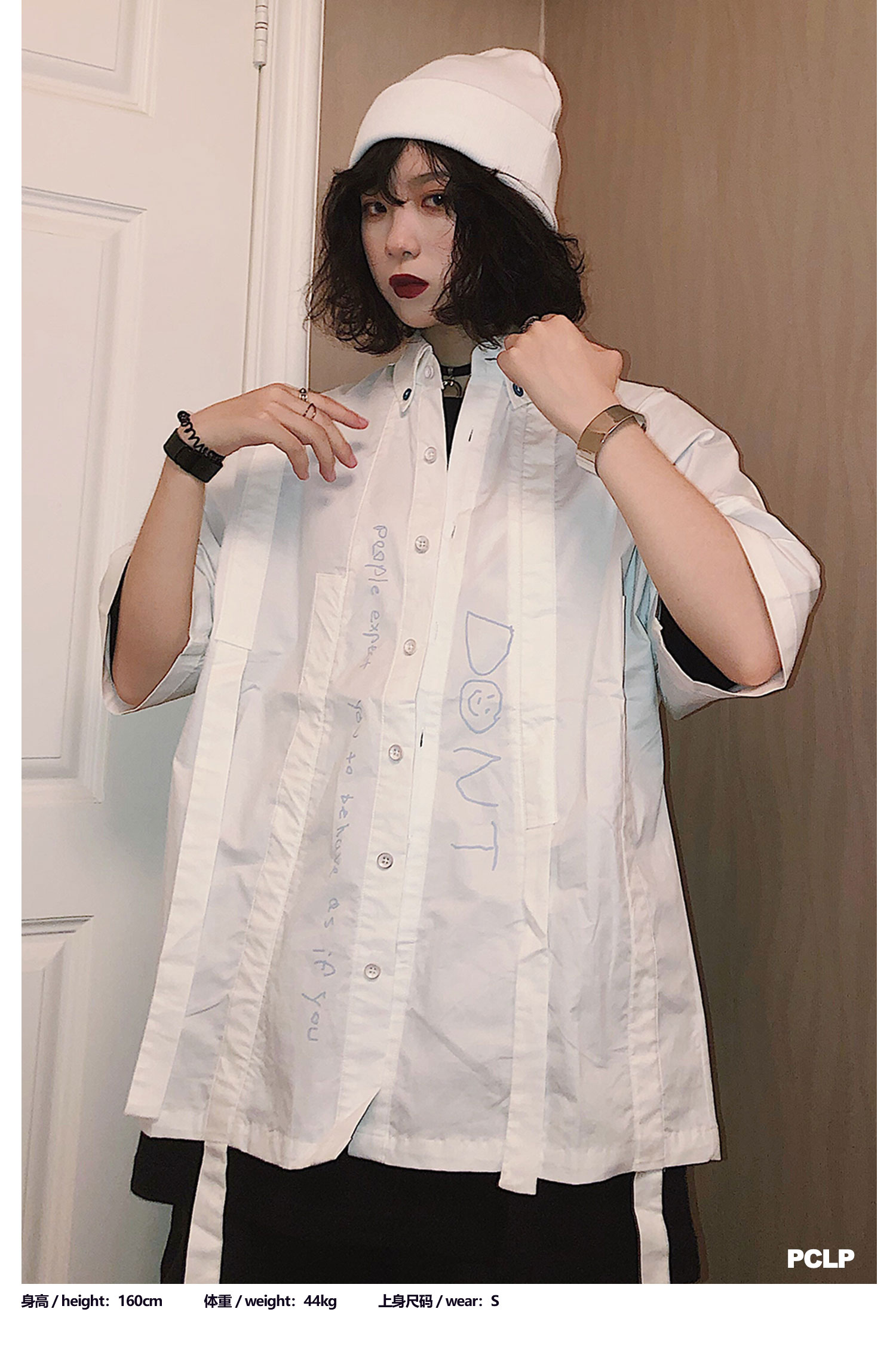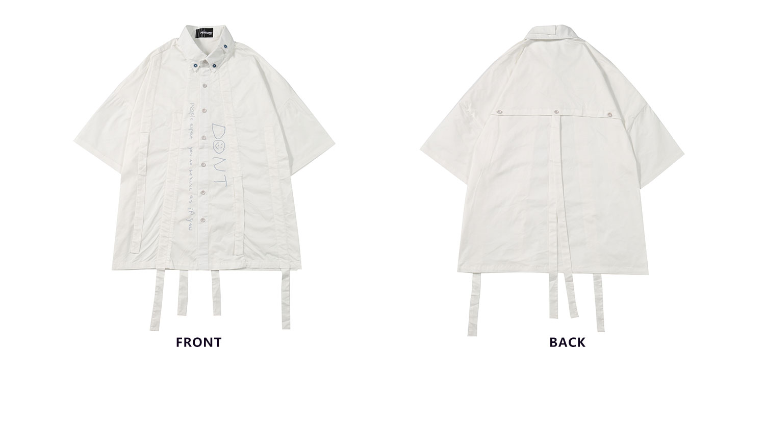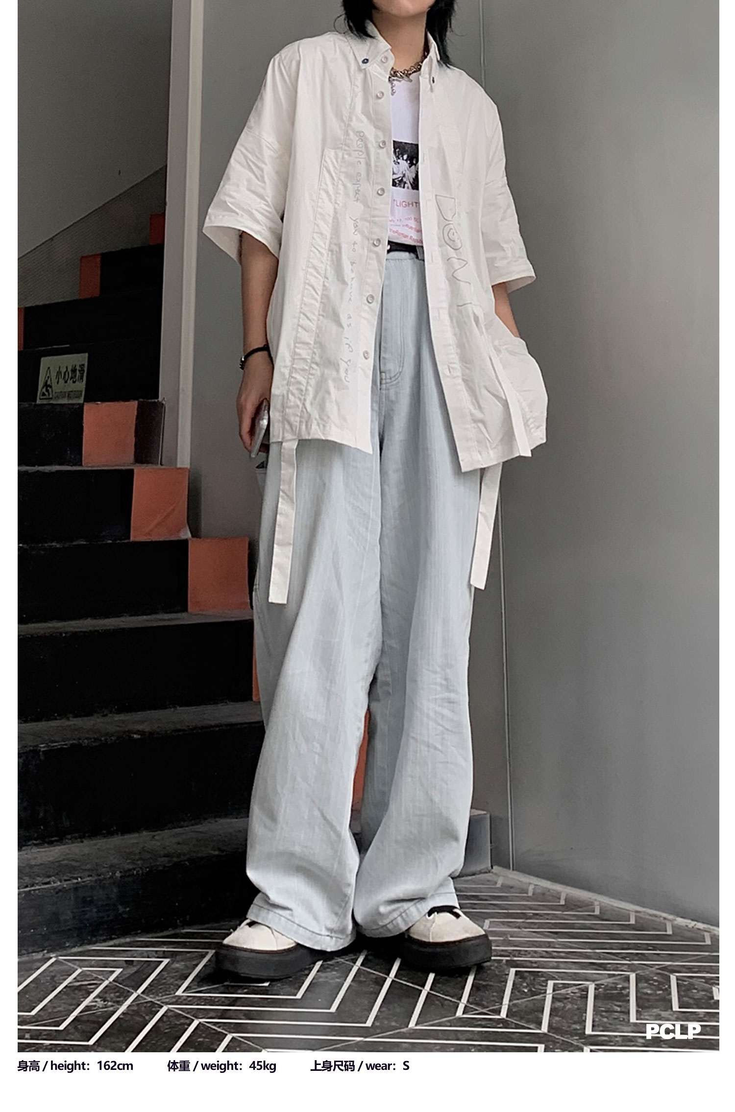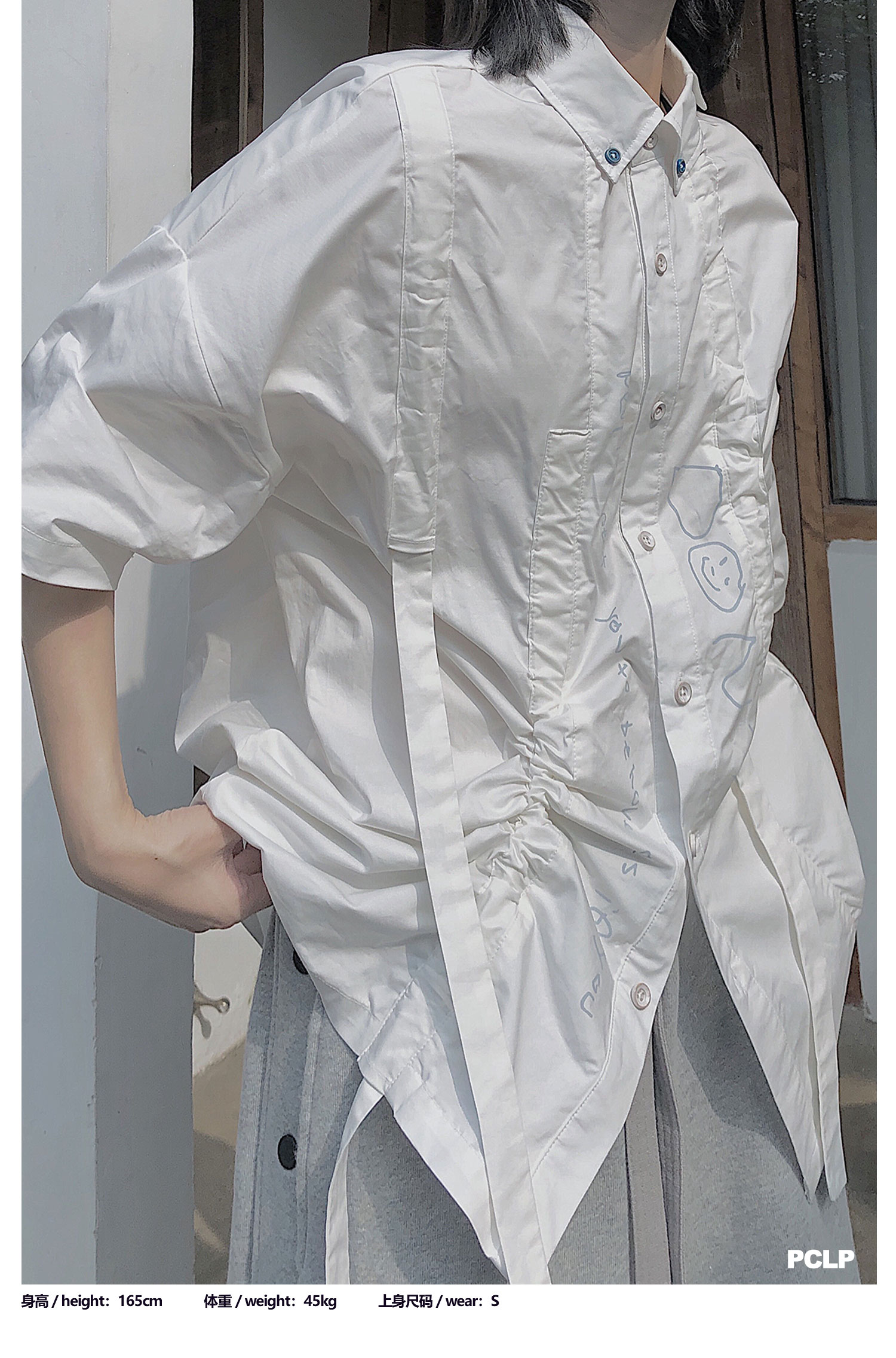 PCLP(PERCLIPS) 白色飘带短袖衬衫 夏季薄款休闲男士衬衣宽松潮