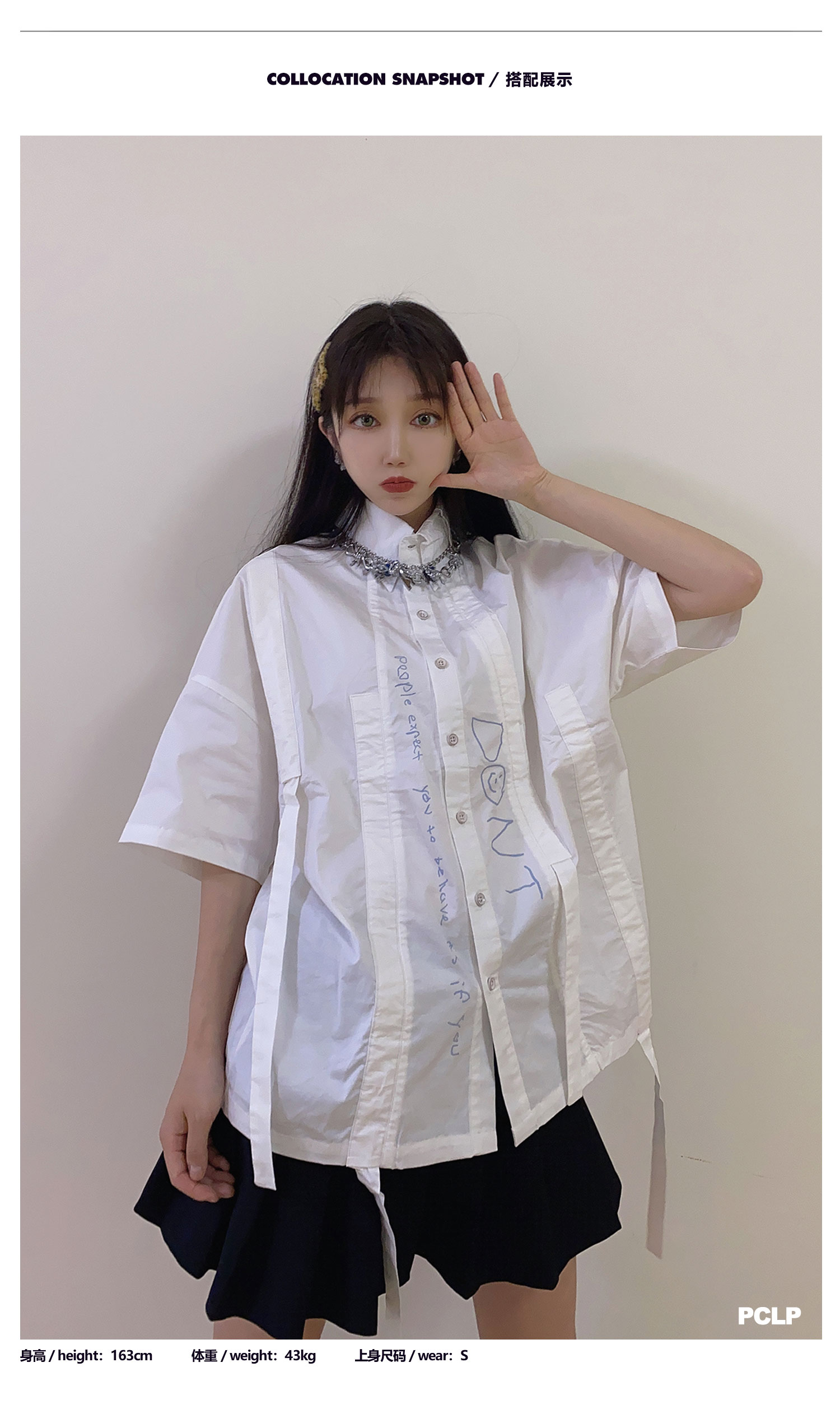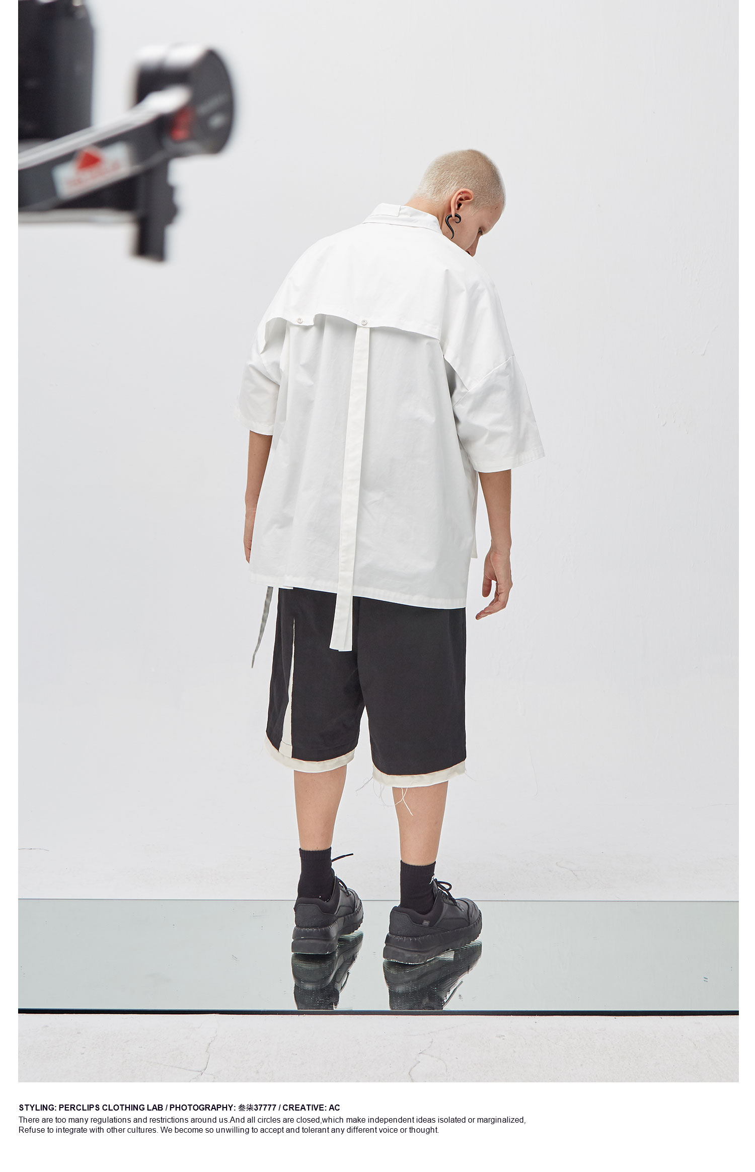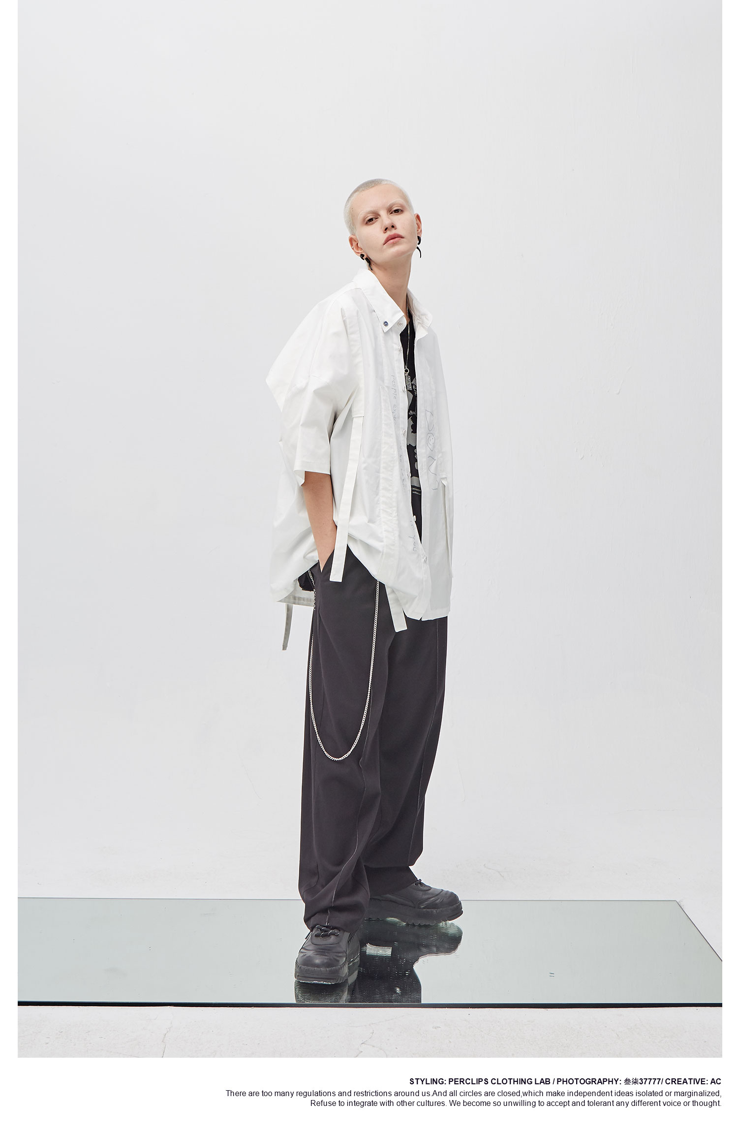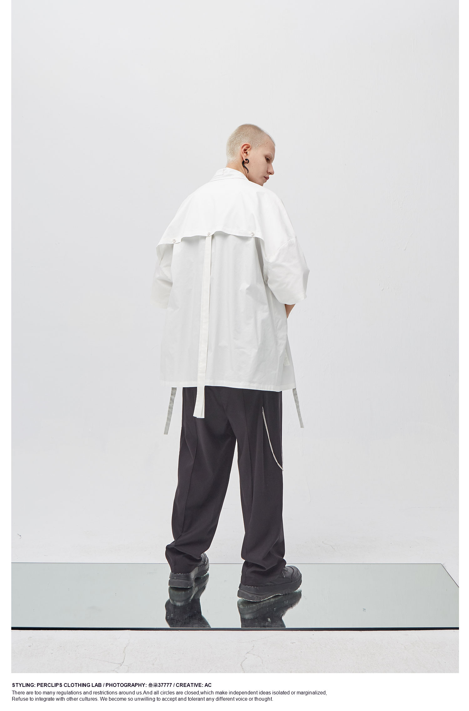 PCLP(PERCLIPS) 白色飘带短袖衬衫 夏季薄款休闲男士衬衣宽松潮