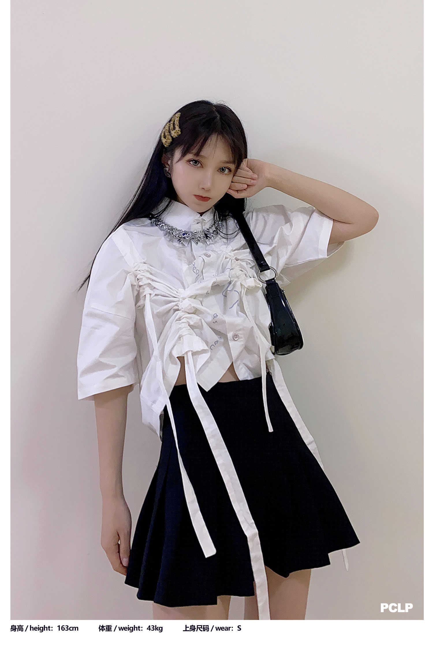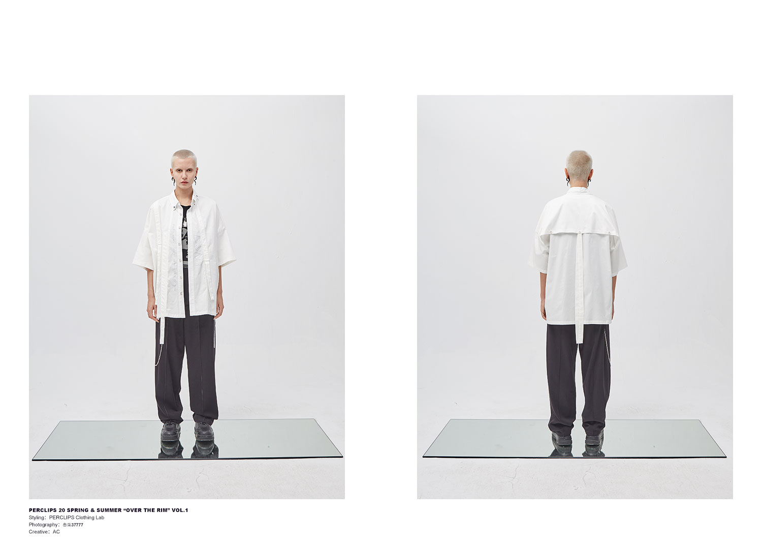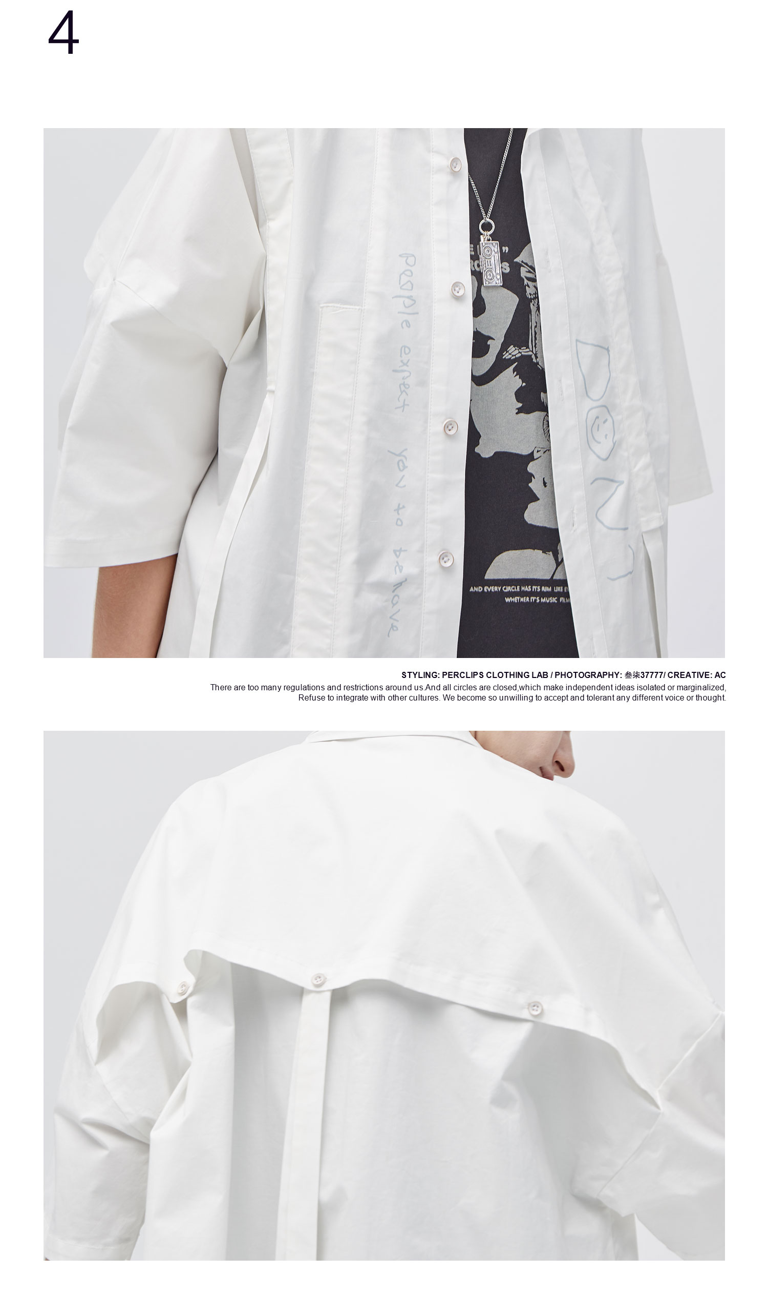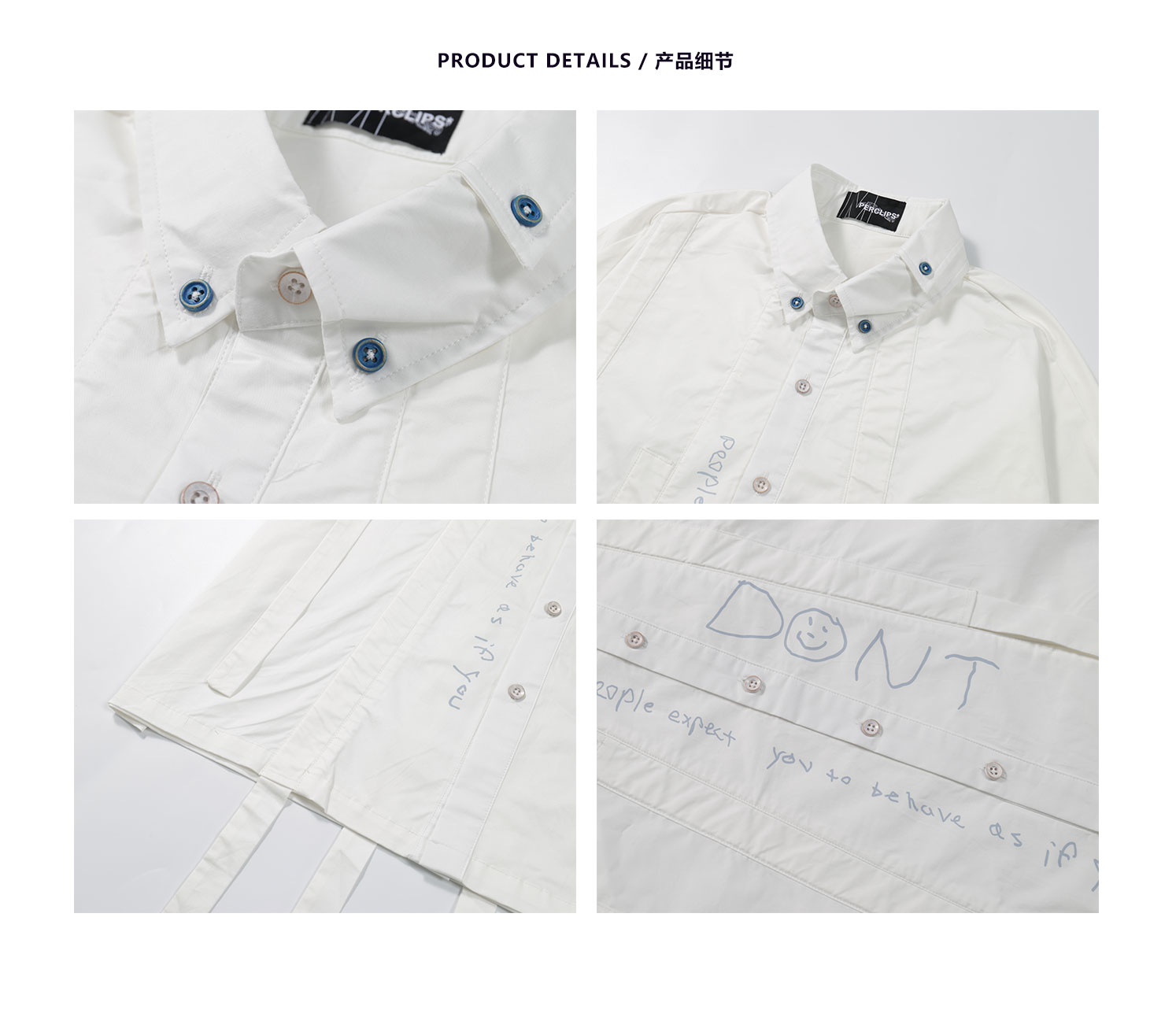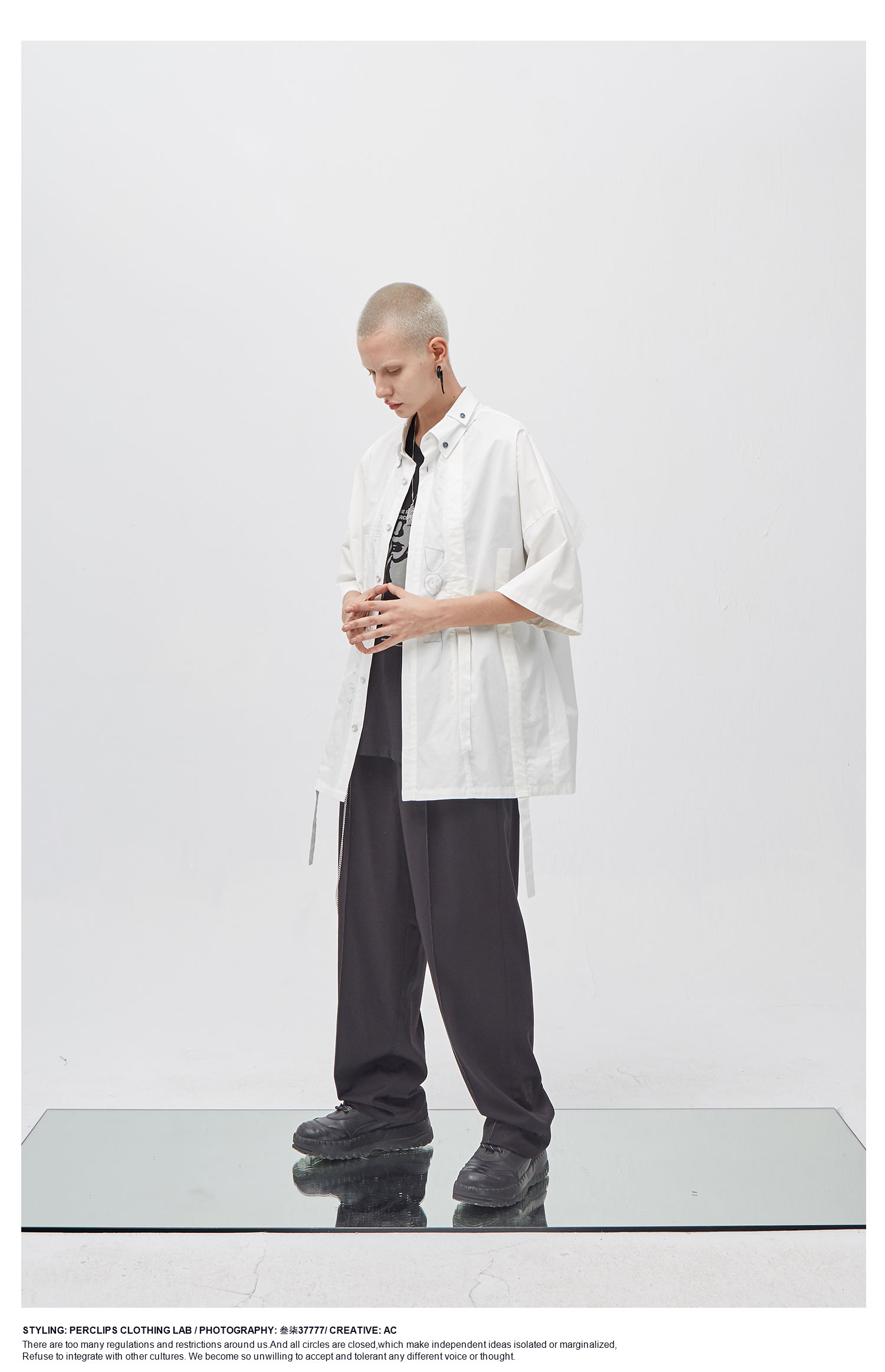 PCLP(PERCLIPS) 白色飘带短袖衬衫 夏季薄款休闲男士衬衣宽松潮
