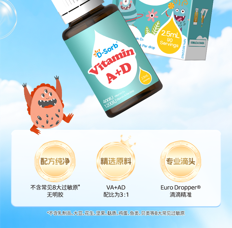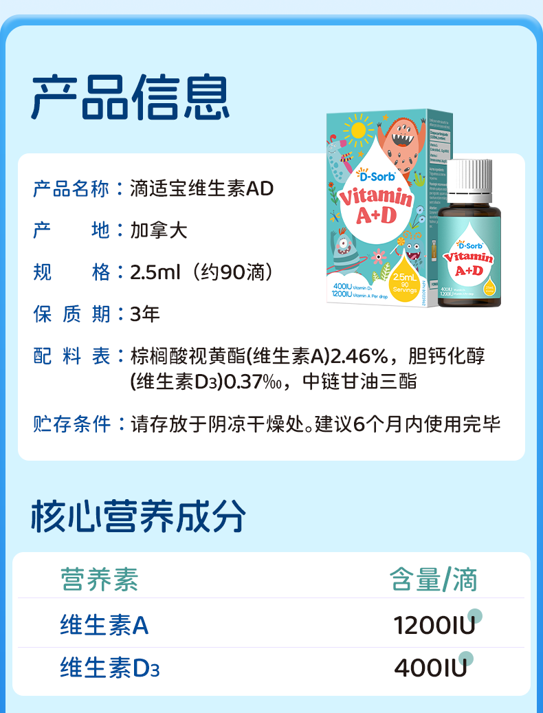 滴适宝(D-Sorb)儿童AD滴剂 维生素ADvd3滴剂 加拿大原装进口 宝宝新生婴幼儿维生素AD补充剂
