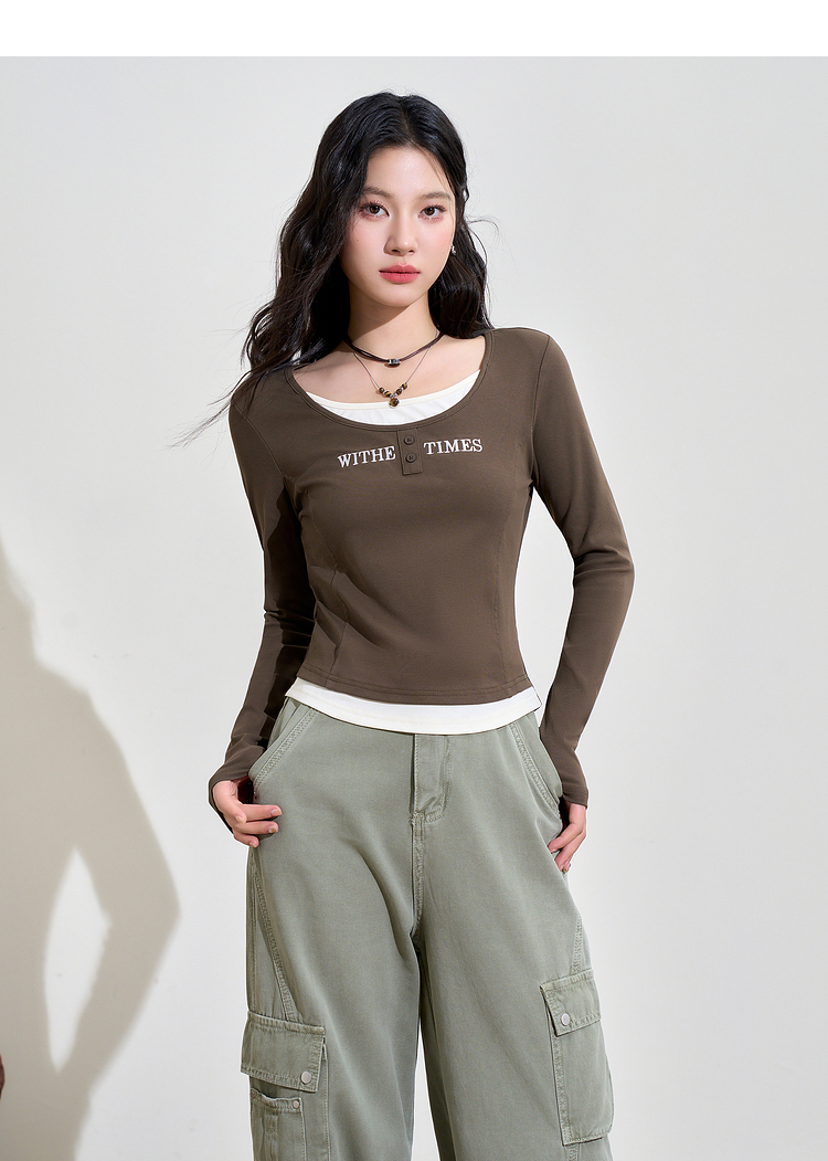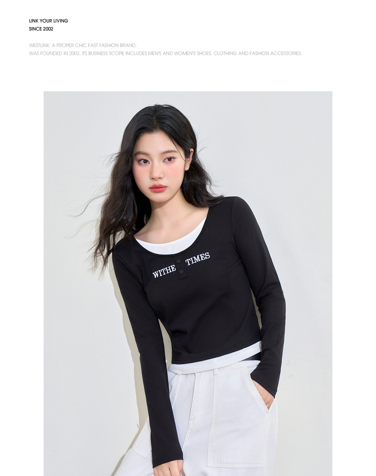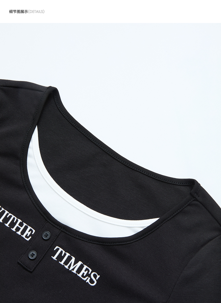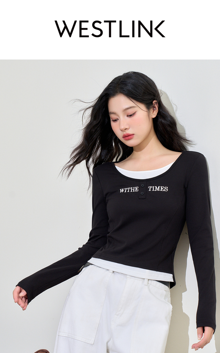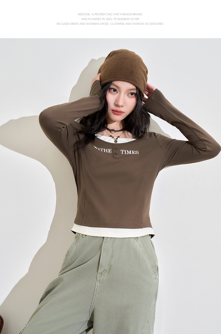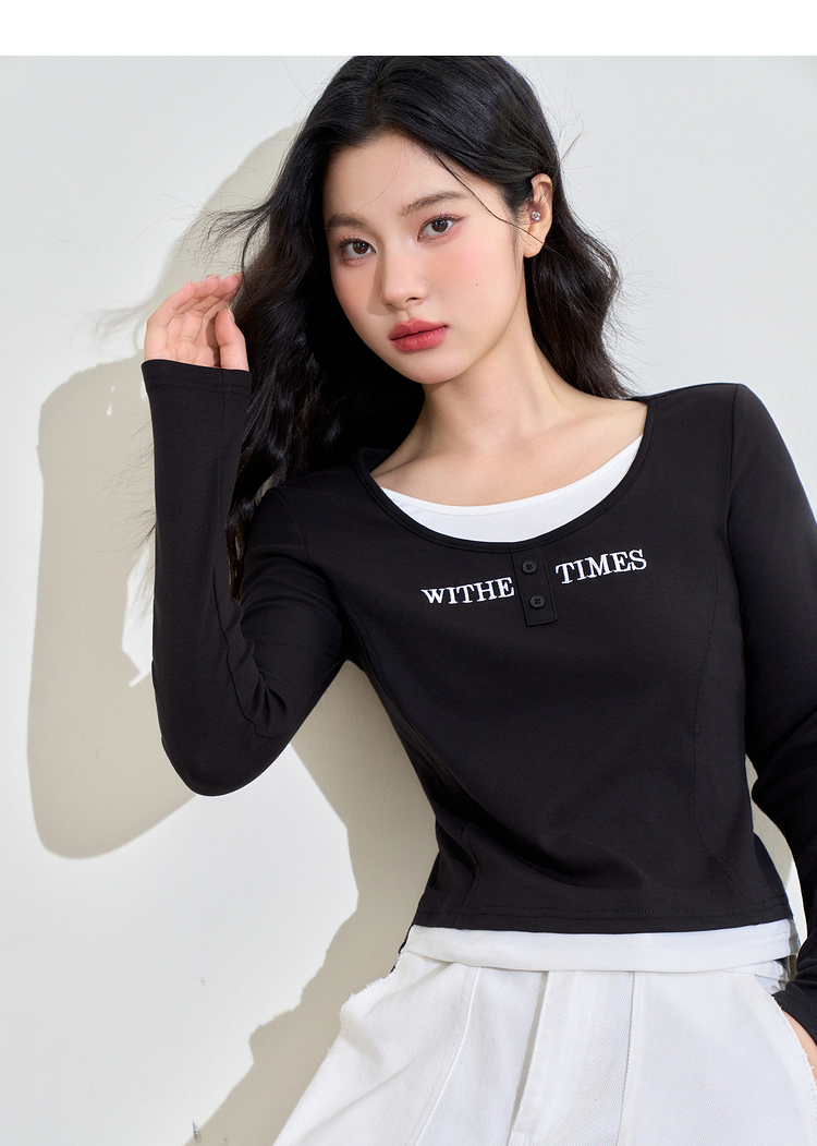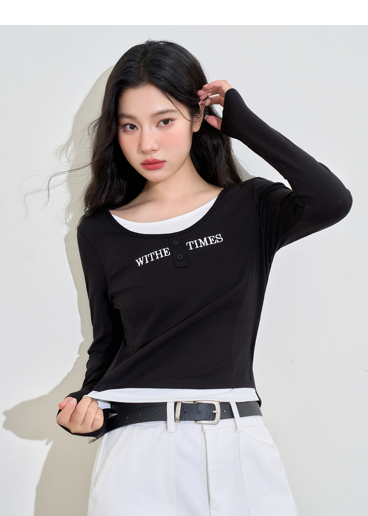 时尚字母印花假两件圆领长袖T恤女早春撞色收腰上衣V0042745