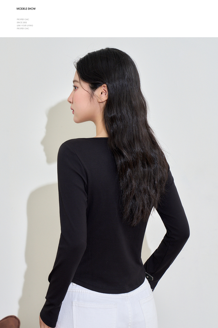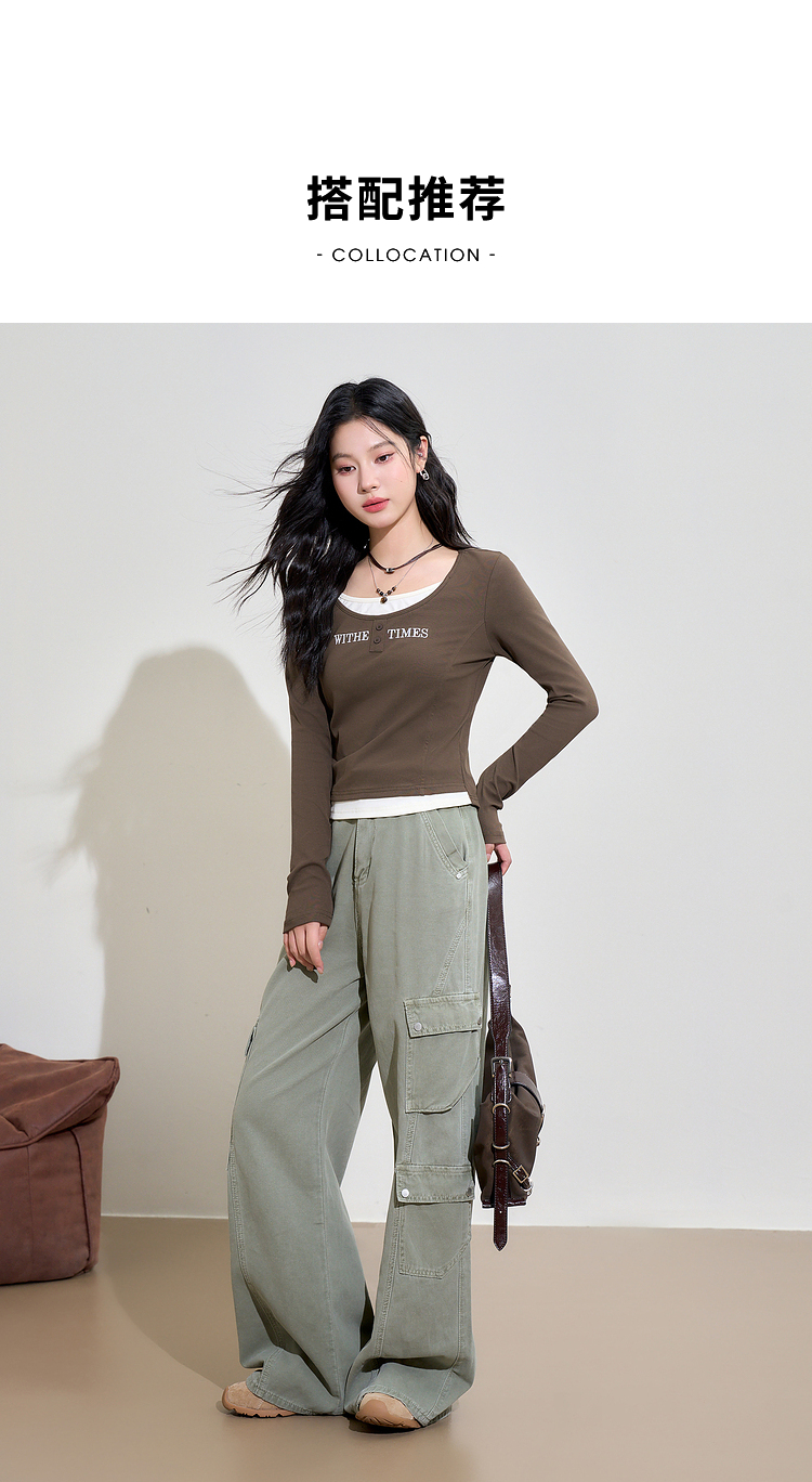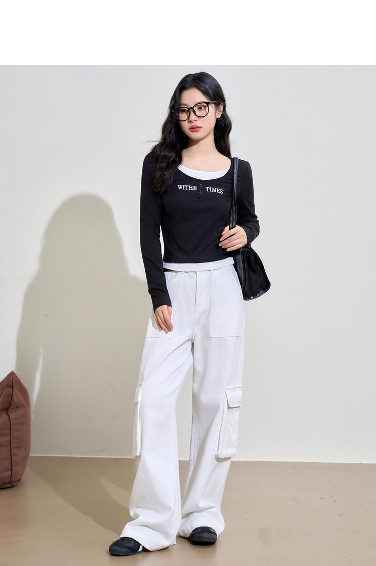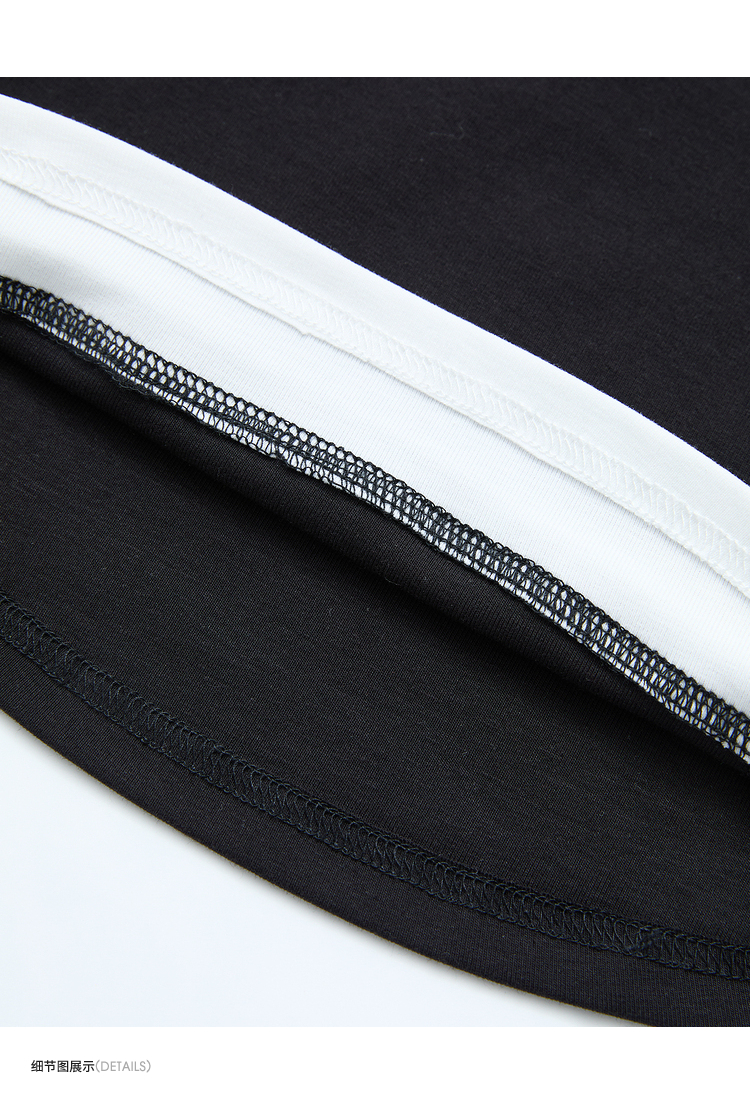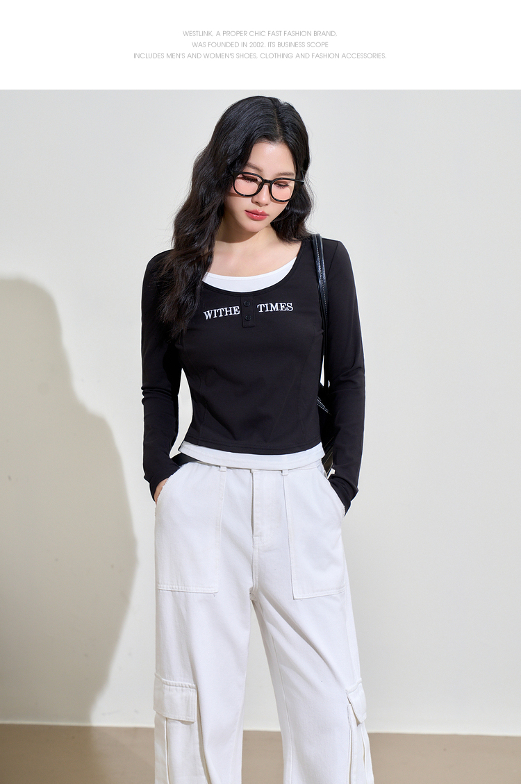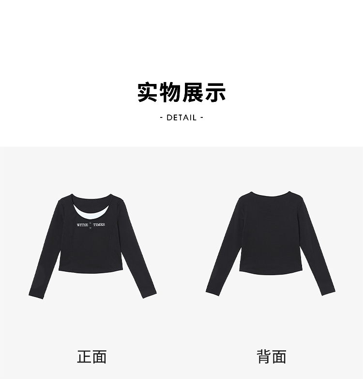 时尚字母印花假两件圆领长袖T恤女早春撞色收腰上衣V0042745