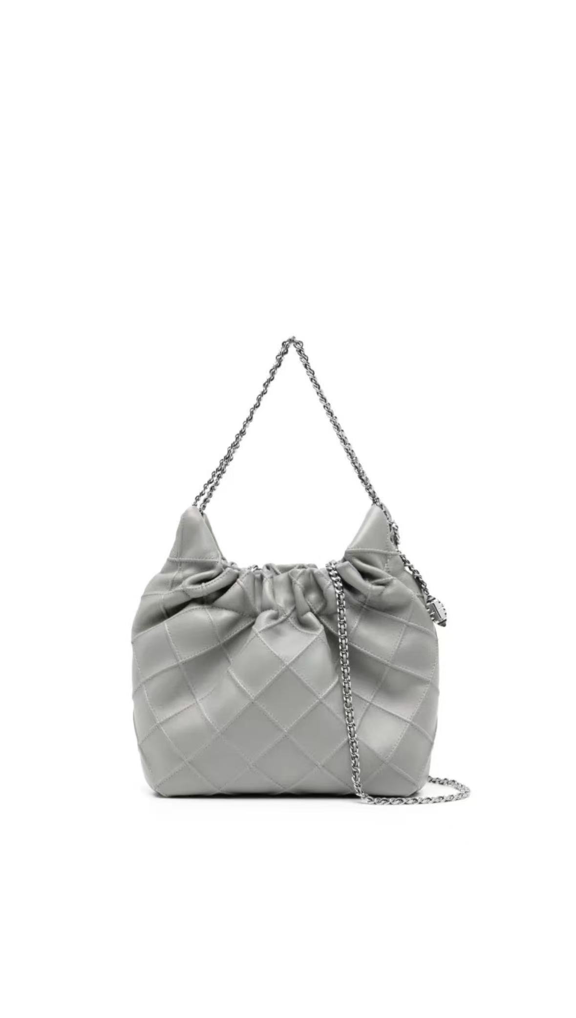 TORY BURCH 汤丽柏琦 Fleming 迷你肩背包精选柔软皮革,焕新融入菱形褶饰,搭配皮革编织链条背带,更显精致与时尚。主要材质:羊皮革。双链条皮革编织提柄