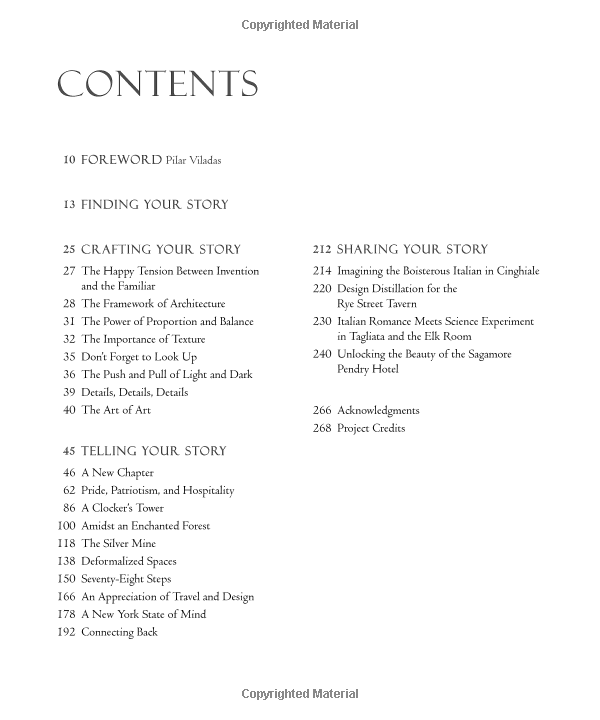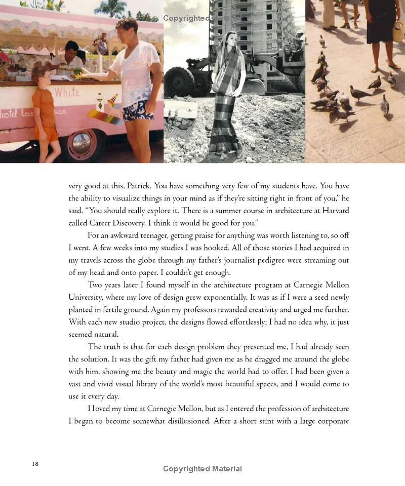 该书是他的首本著作,展示了他所设计的10个住宅项目和4个酒店及餐厅项目。这些设计豪华高贵、魅力四射,其中包括荣获大奖的巴尔的摩彭迪酋长酒店。他在这些项目中讲述了家庭、古老宅邸和餐馆的传奇故事。此外,他还围绕着比例和平衡、材质和建筑的重要性对奢华空间设计的八项原则进行了详述。他将故事完整地植入到室内设计之中,以此唤醒人们的记忆。