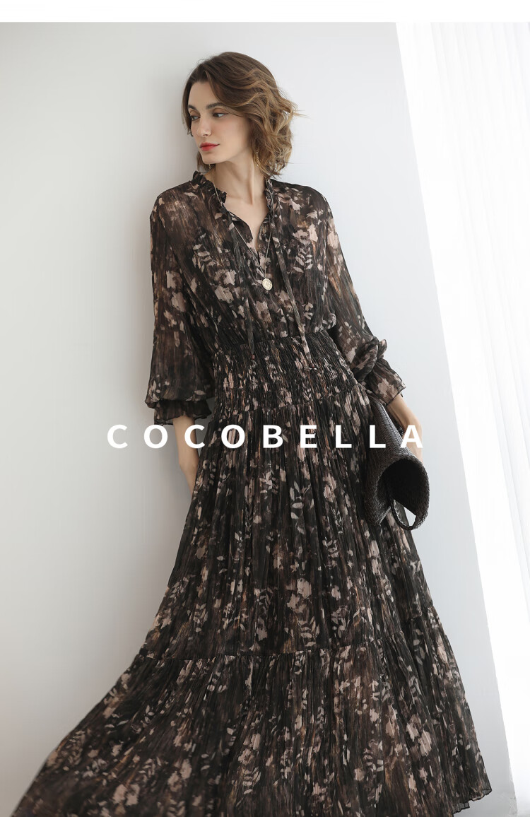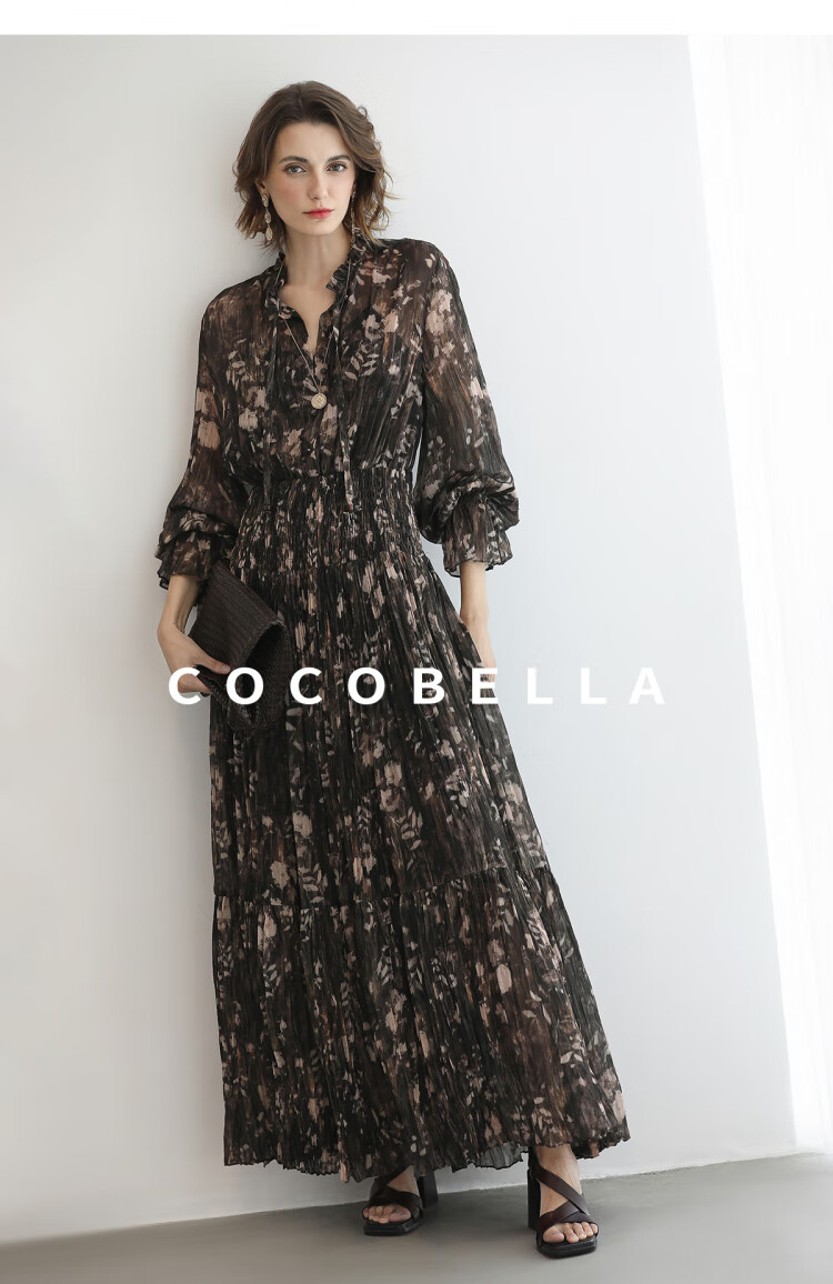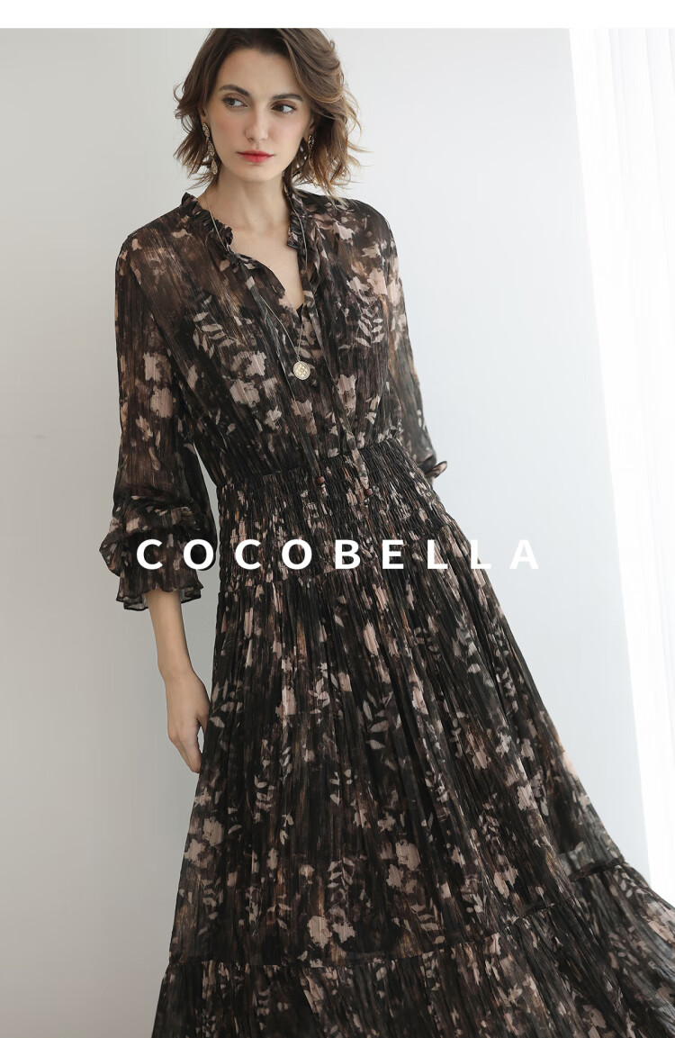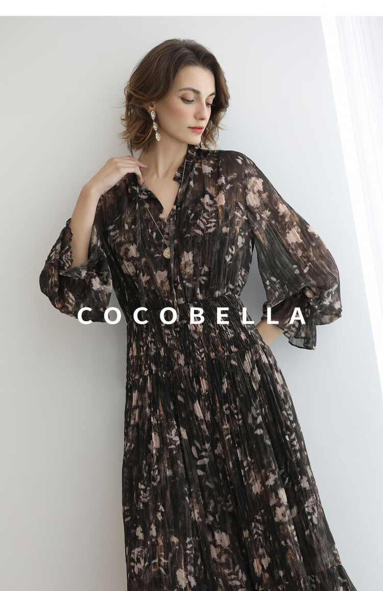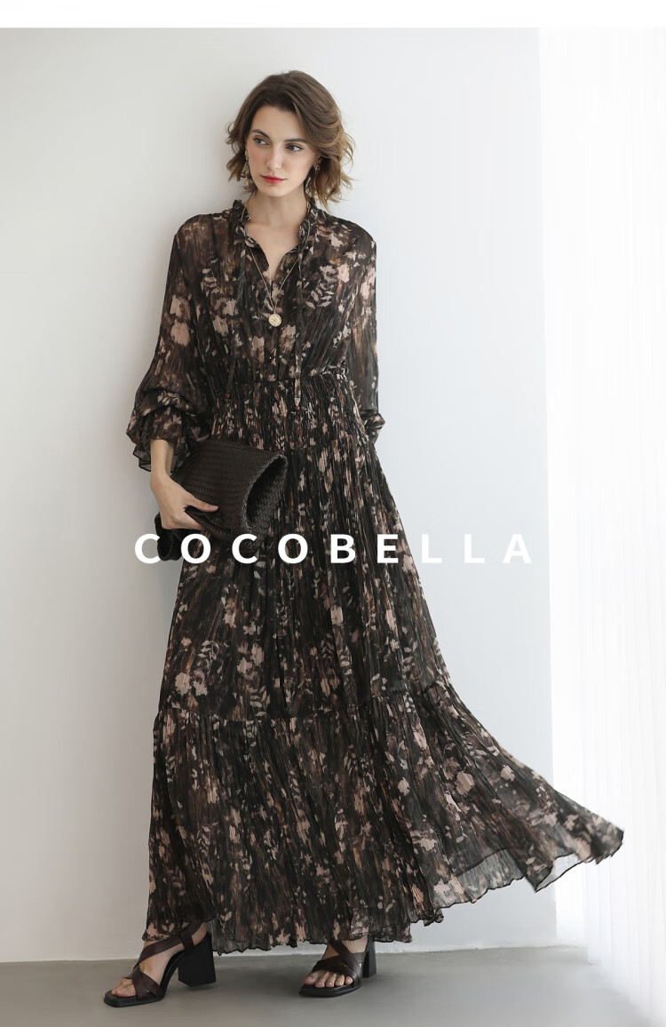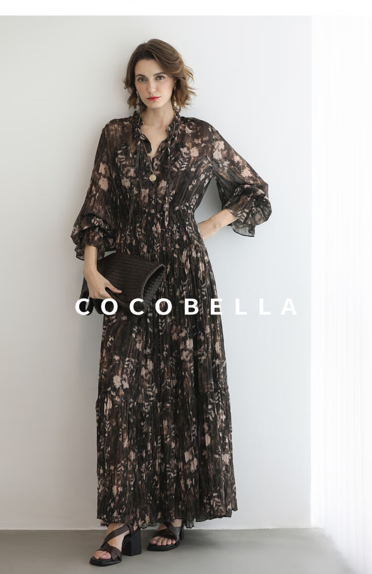 COCOBELLA重工金丝压褶花卉印花连衣裙女夏度假风雪纺长裙FR3075