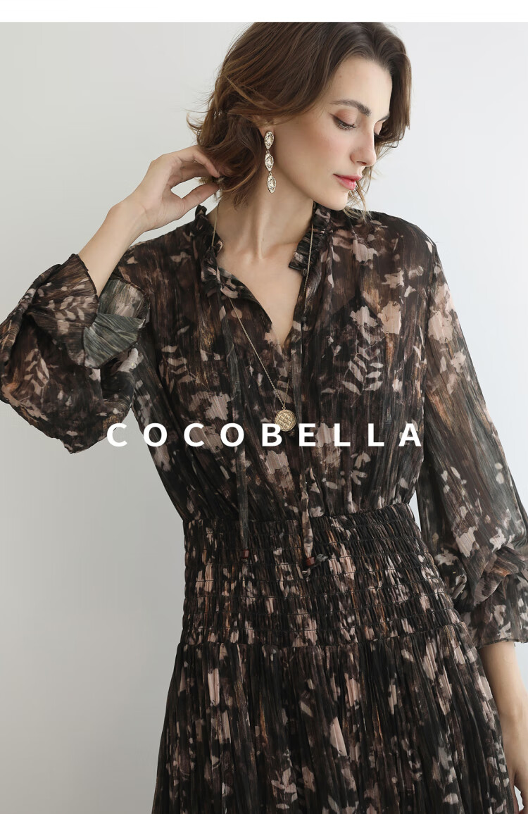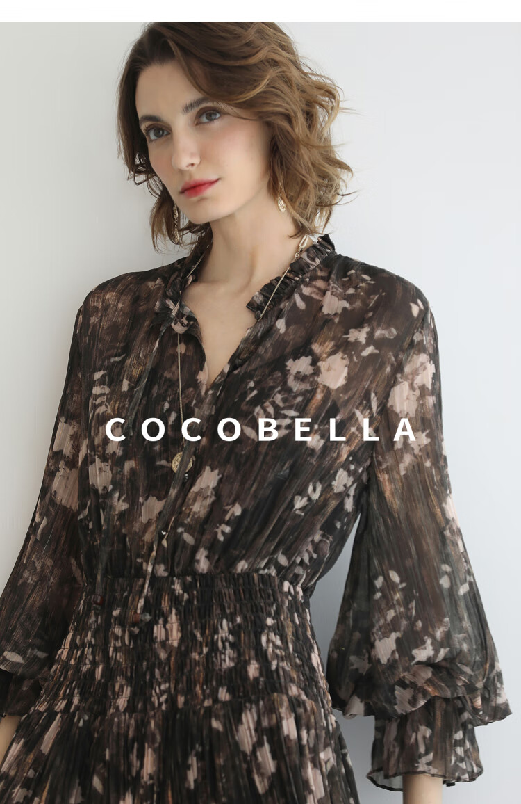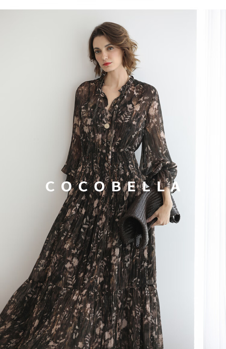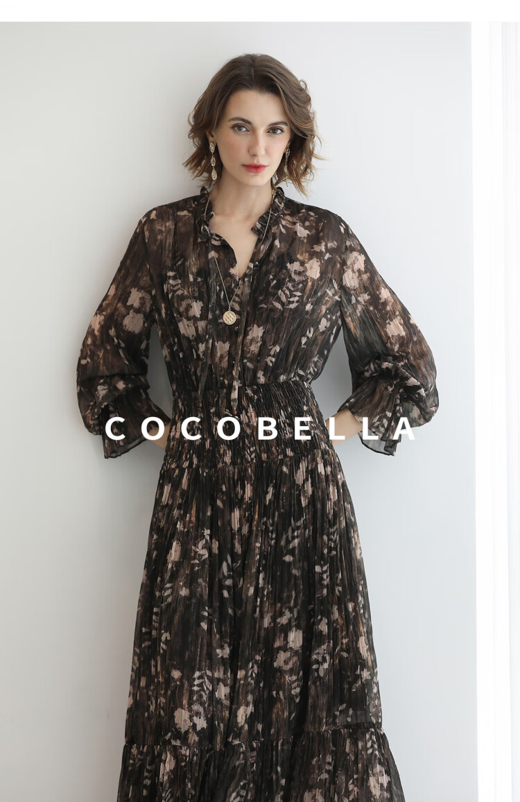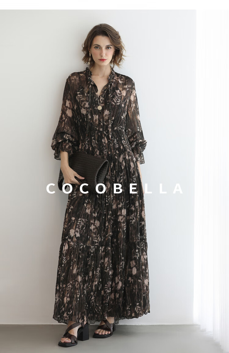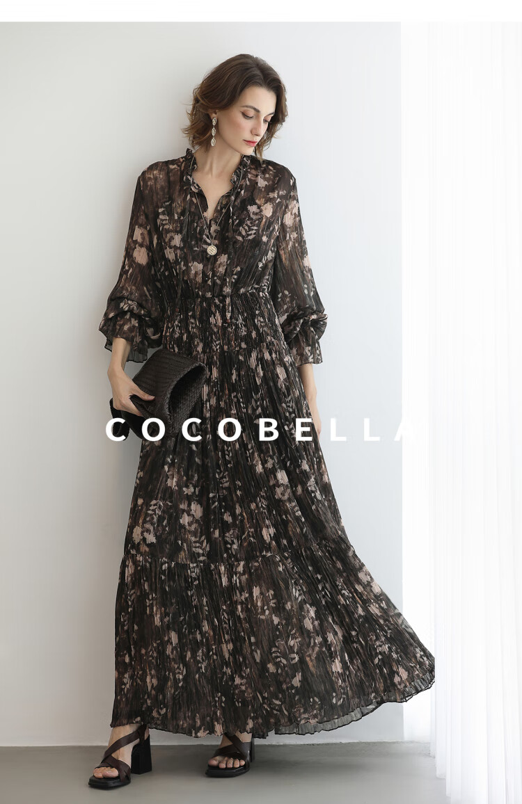 COCOBELLA重工金丝压褶花卉印花连衣裙女夏度假风雪纺长裙FR3075