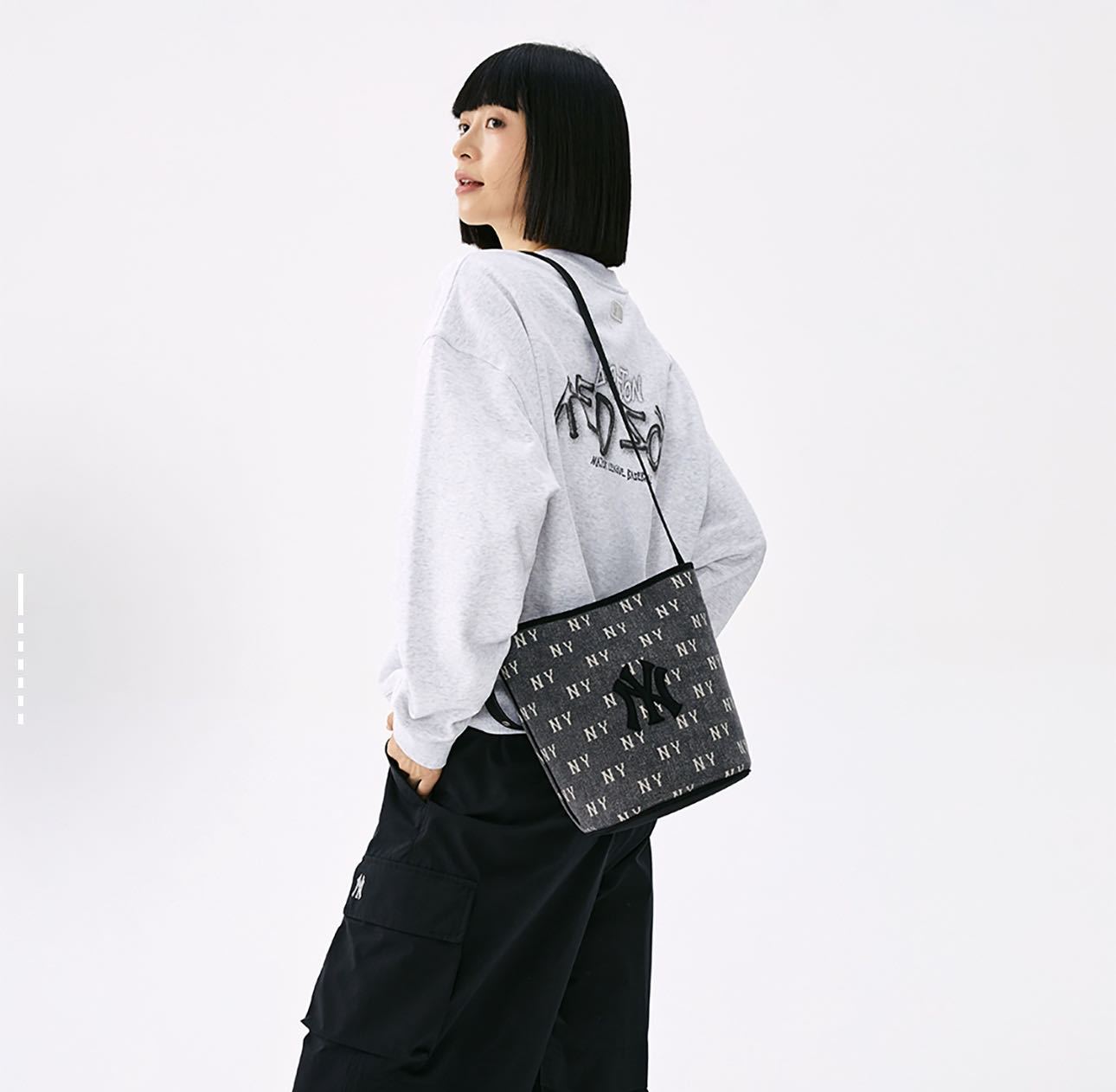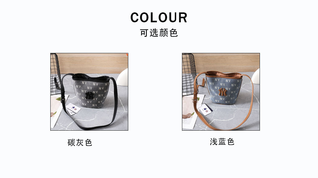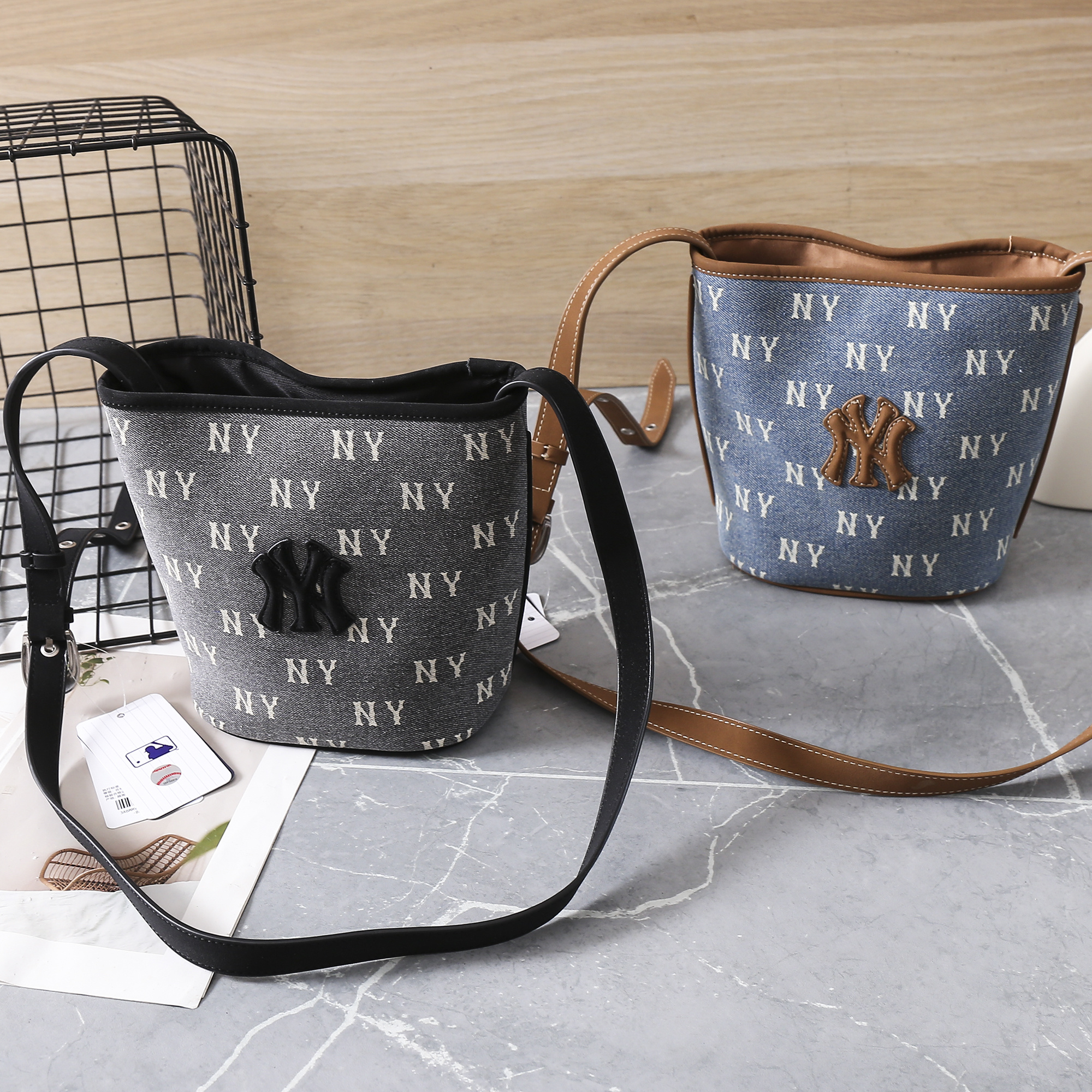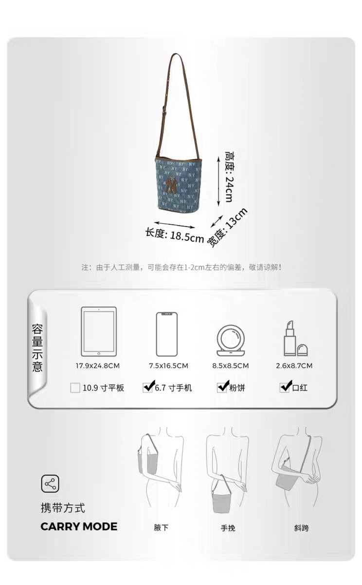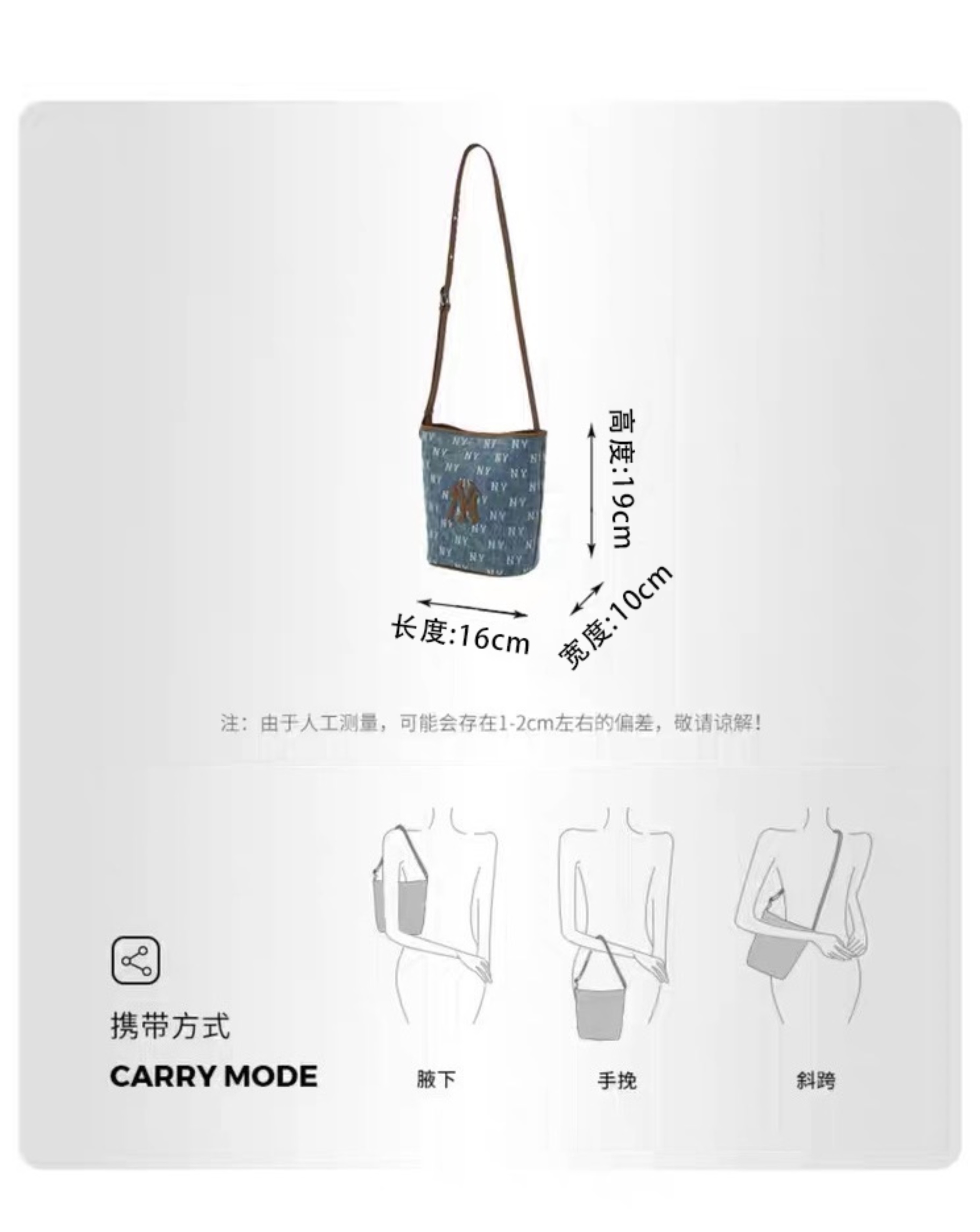 MLB25FW复古牛仔老花大水桶包 尺寸:长18.5cm、款13cm、高24cm材质:51%棉+33%聚酯纤维+15%再生纤维素纤维+1%其他纤维