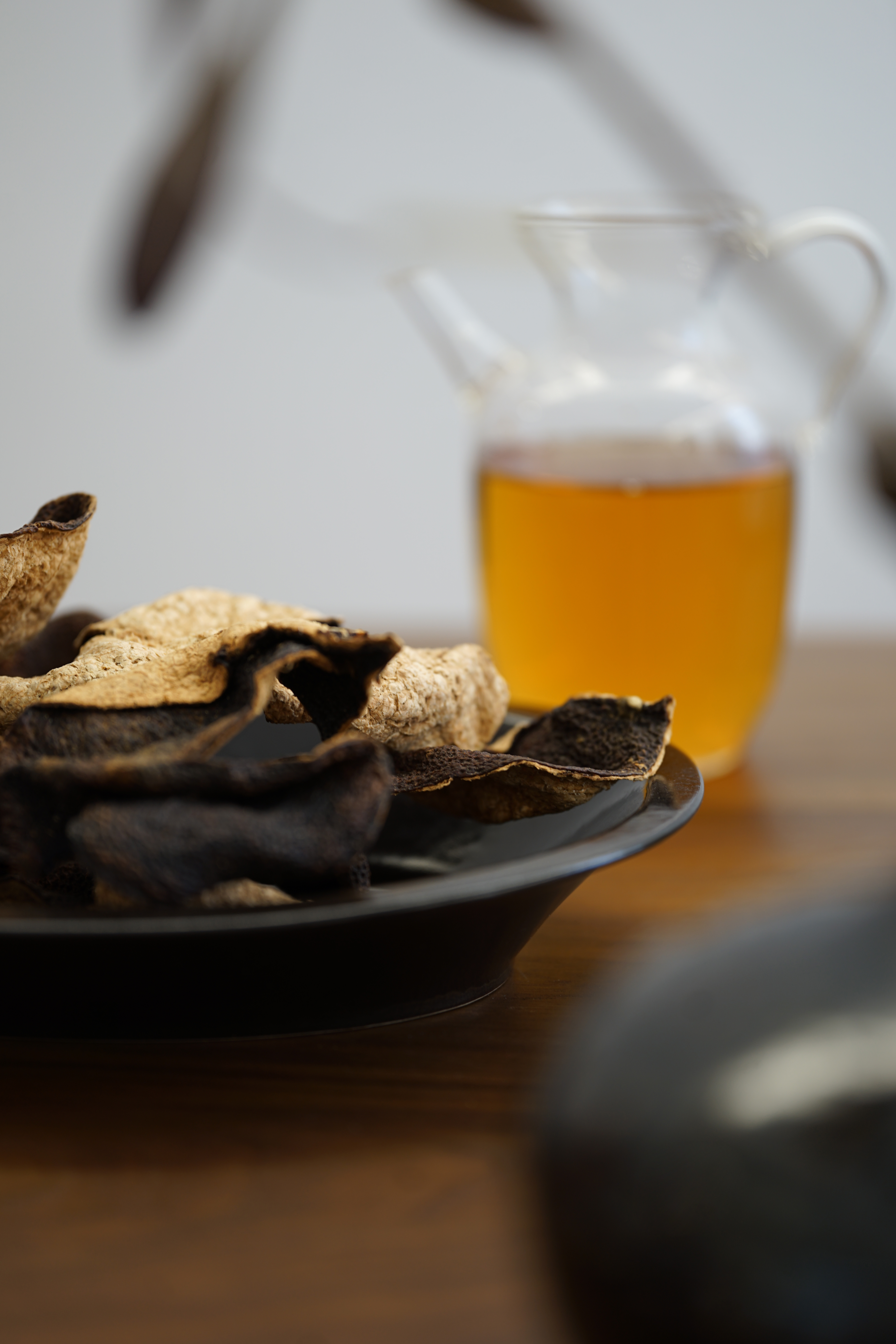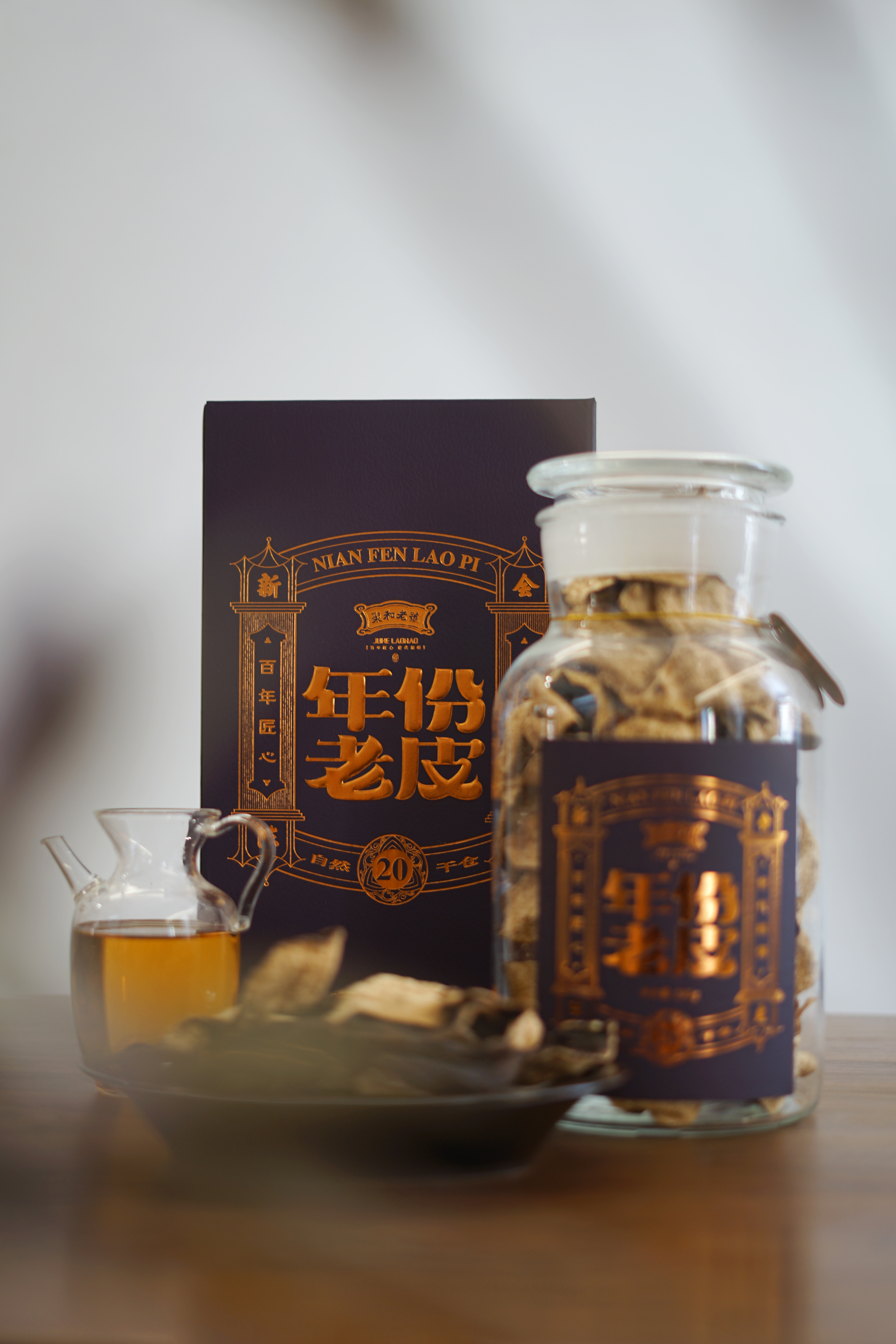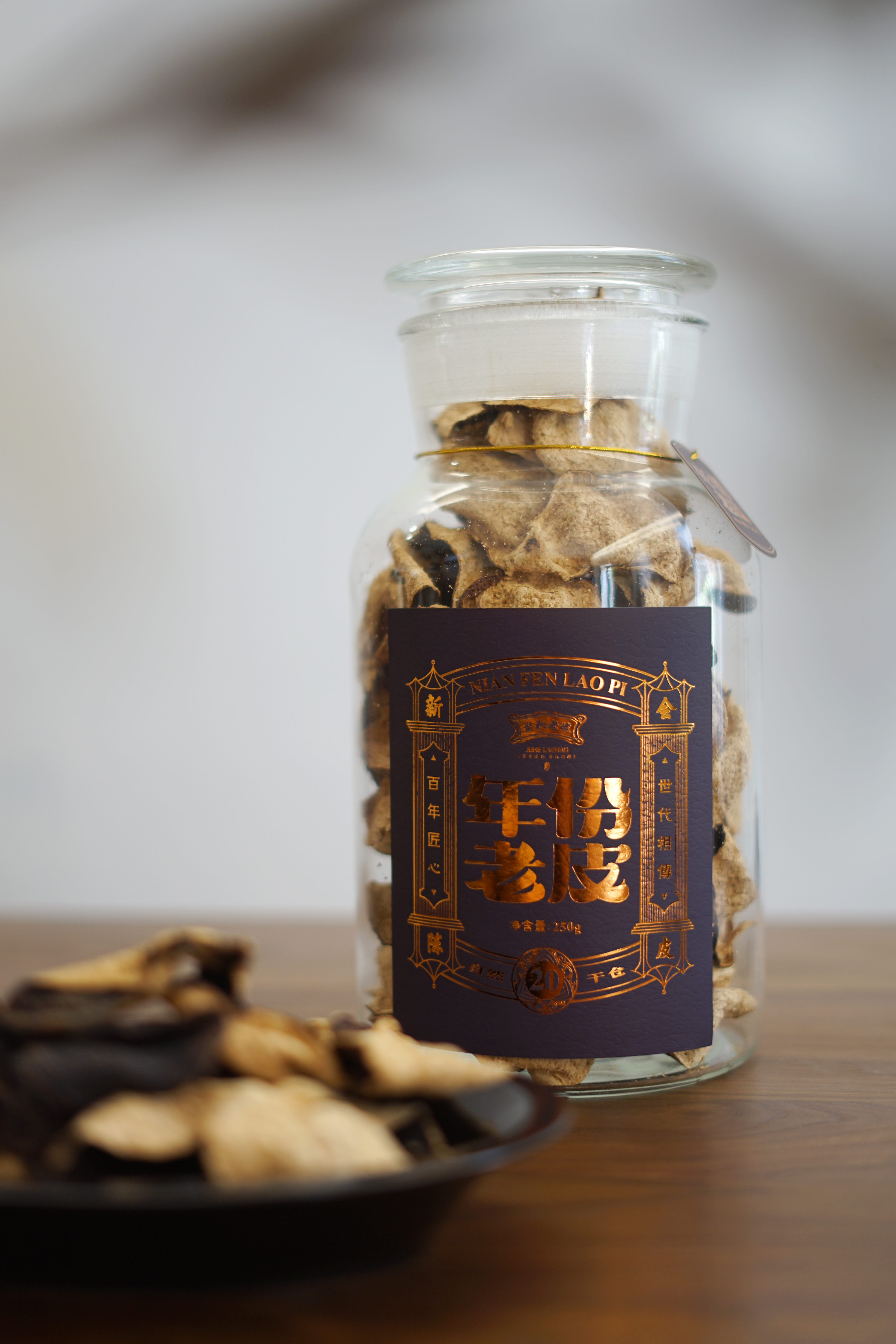 甄选了新会核心产区老树陈皮,经过20载陈化,玉露金浆,汤色橙黄明亮,汤感粘稠饱满,浓醇流光。皮质柔软而有韧性,弹性十足,富有张力,久煮不烂,可遇不可求。