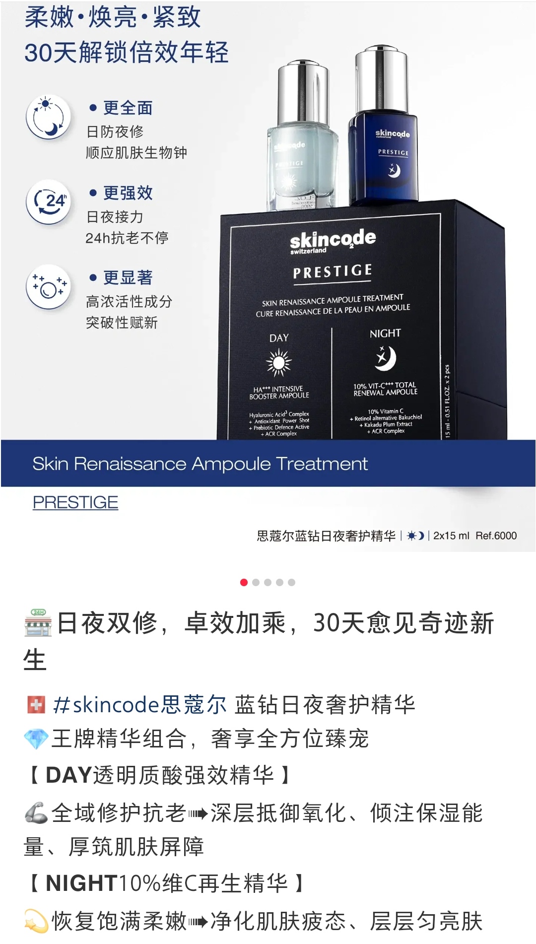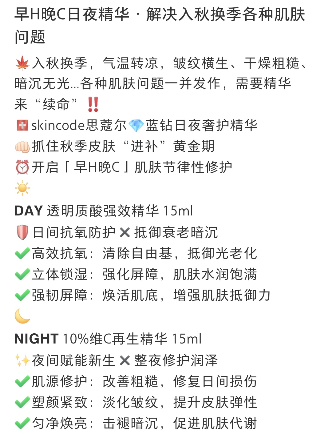 【品名】瑞士skincode思蔻尔高端系 早H晚C抗老精华抗氧化15ml*2