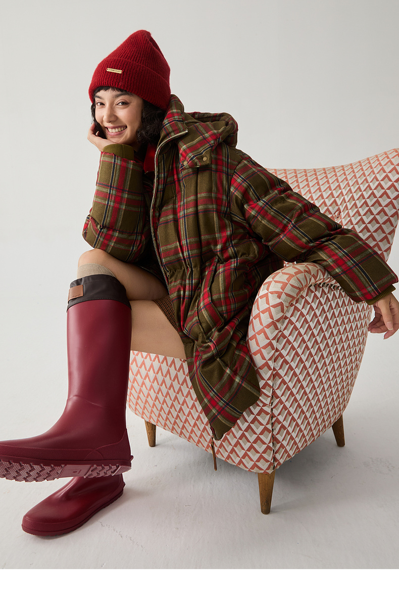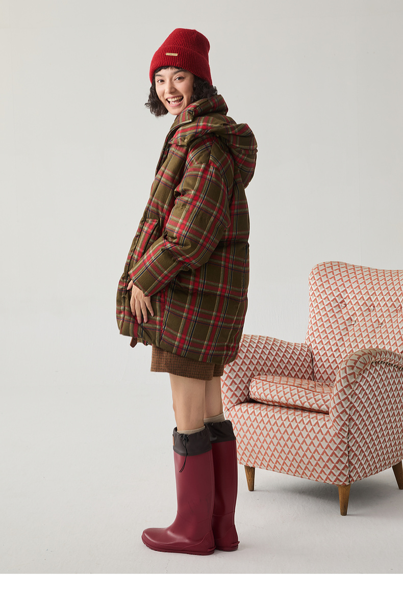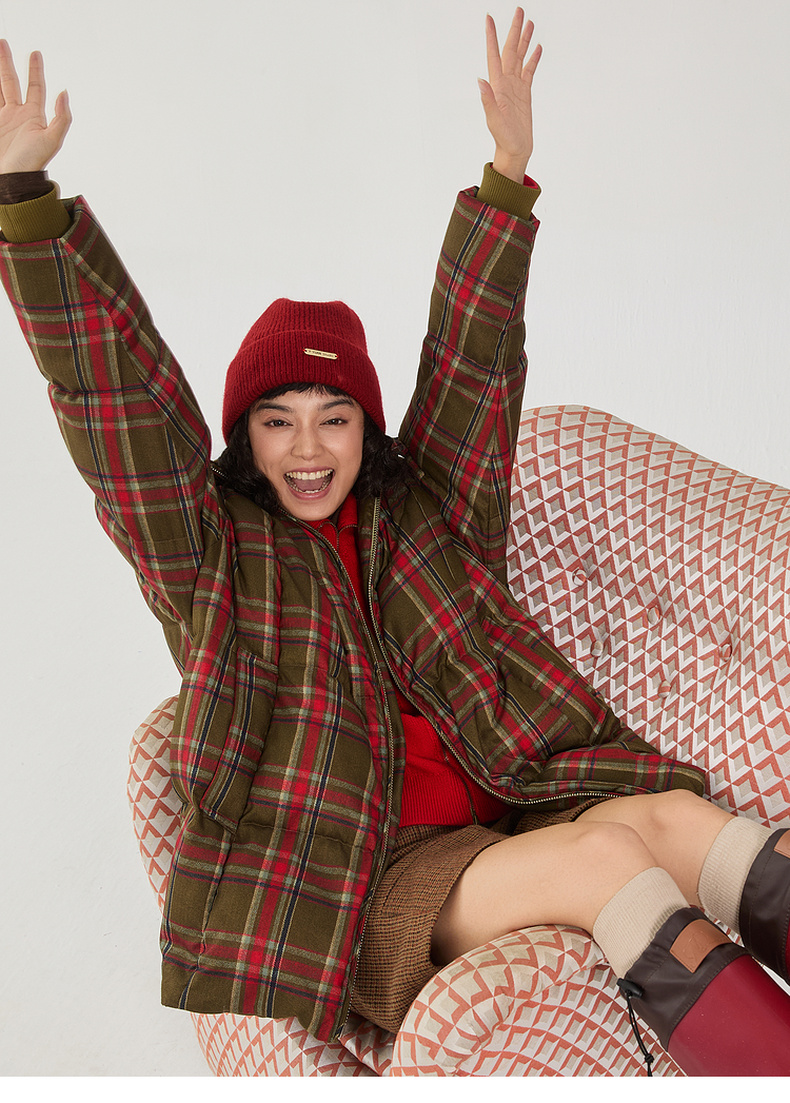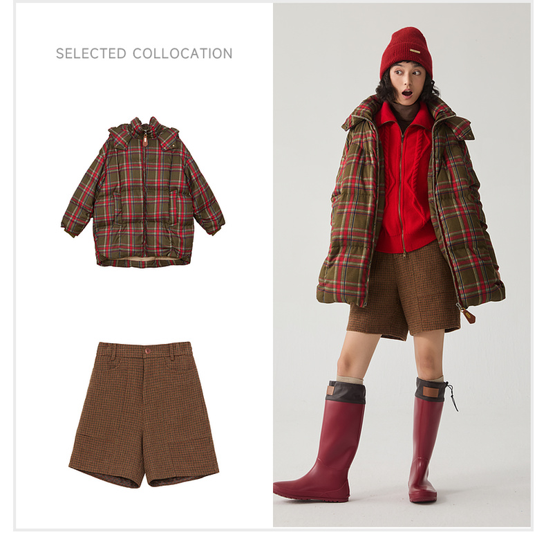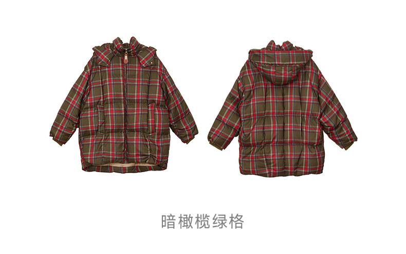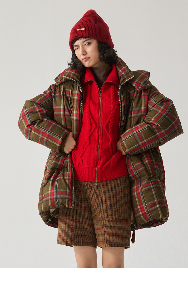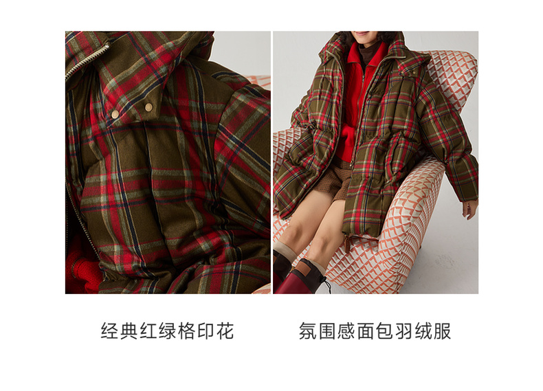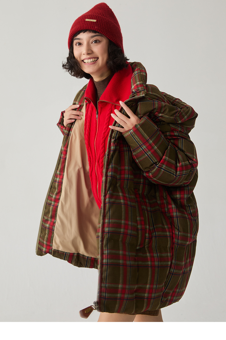 谜底红色格子羽绒服女2024冬新品复古风宽松加厚面包服244MY1491