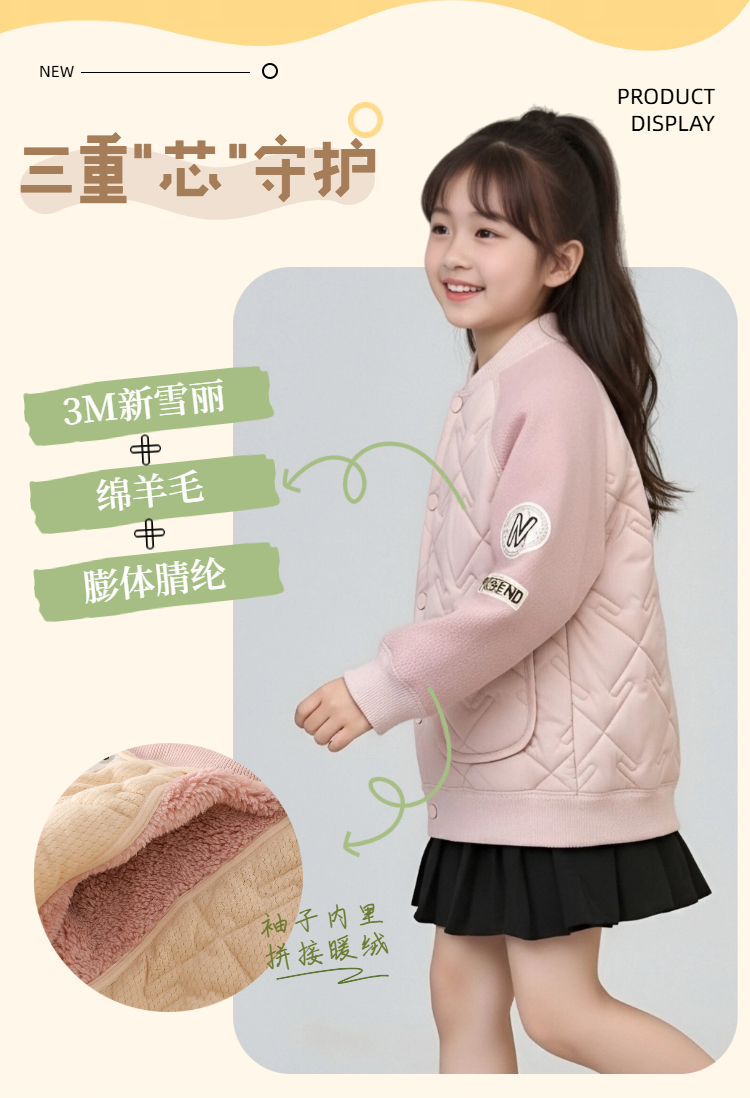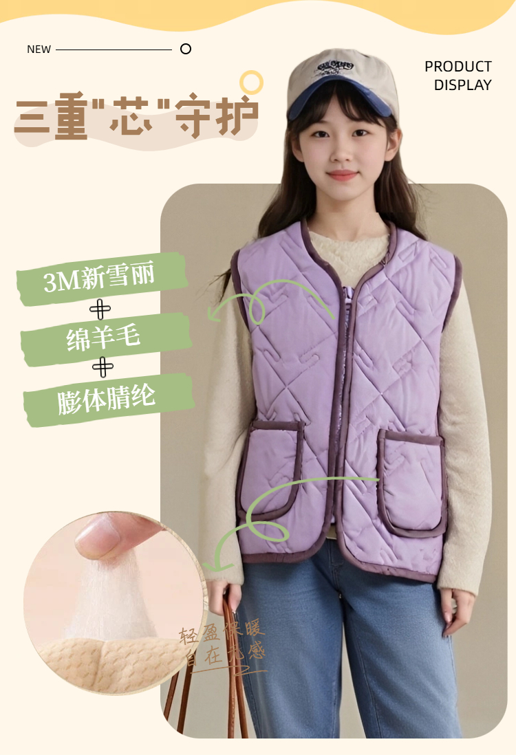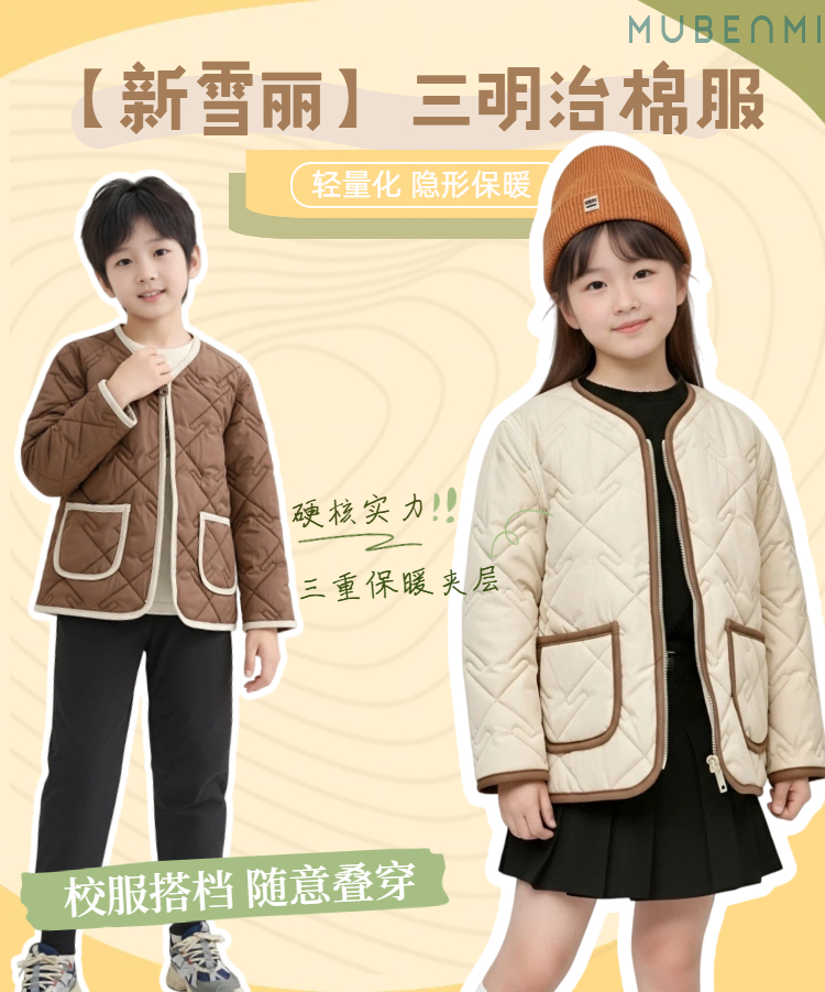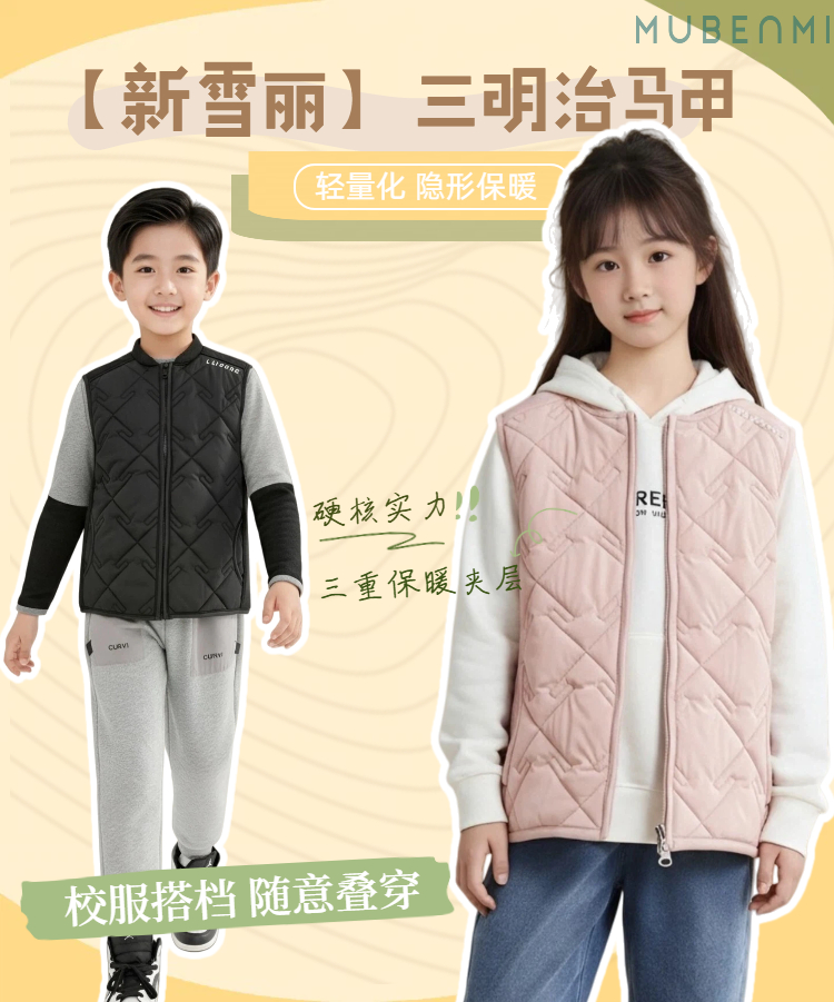 【童装服饰丨MUBENMI新雪丽三明治棉服&马甲】 面料柔软亲肤,同色系按扣/拉链设计,方便穿脱,轻暖中间层,保暖不显臃肿,校服里内搭叠穿,或是单独外穿出游皆可,轻松应对多变天气
