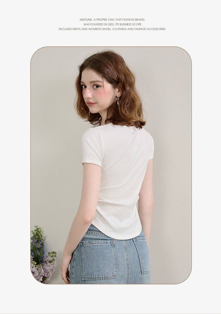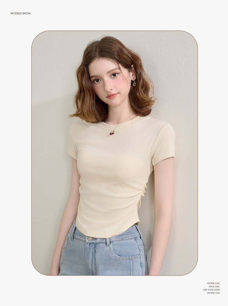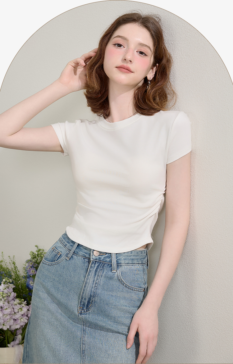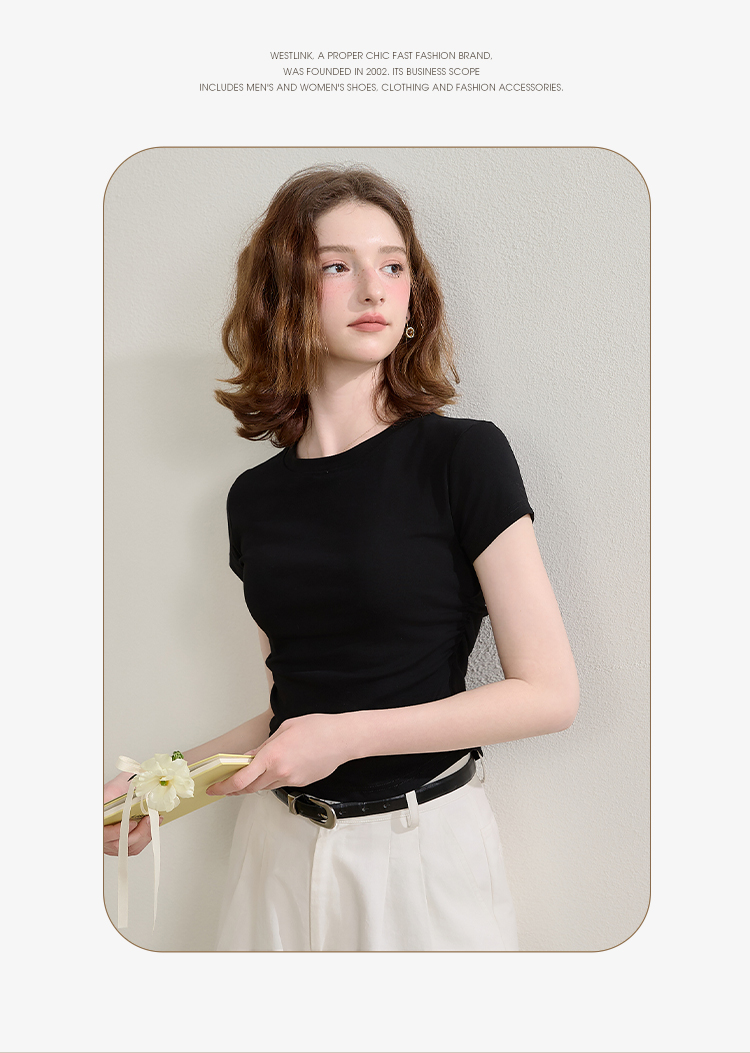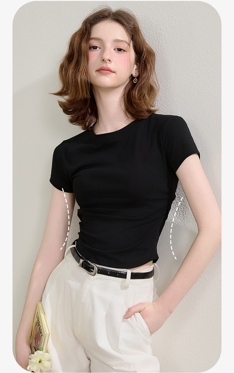 西遇圆领短袖t恤女新款休闲纯色修身内搭正肩短款上衣SS150224