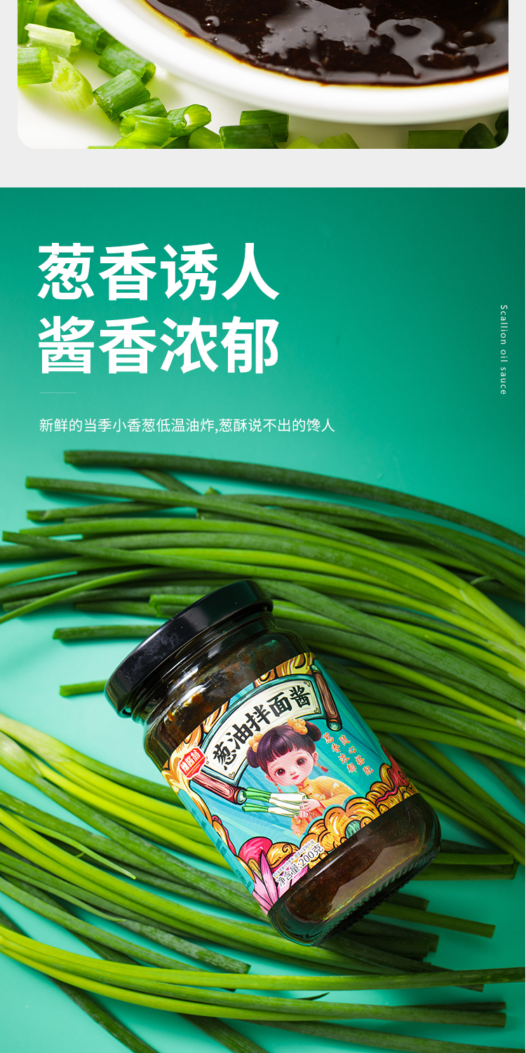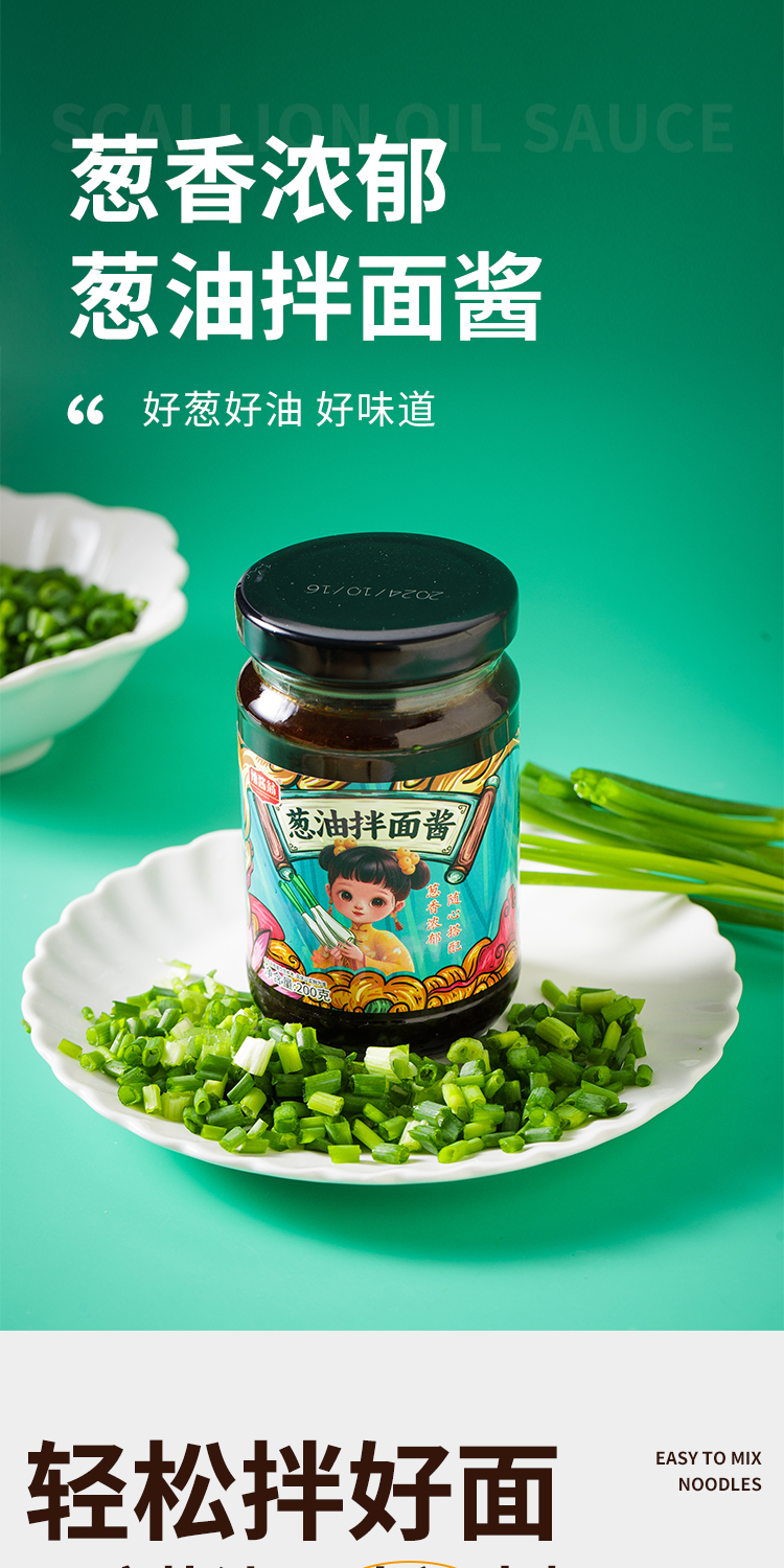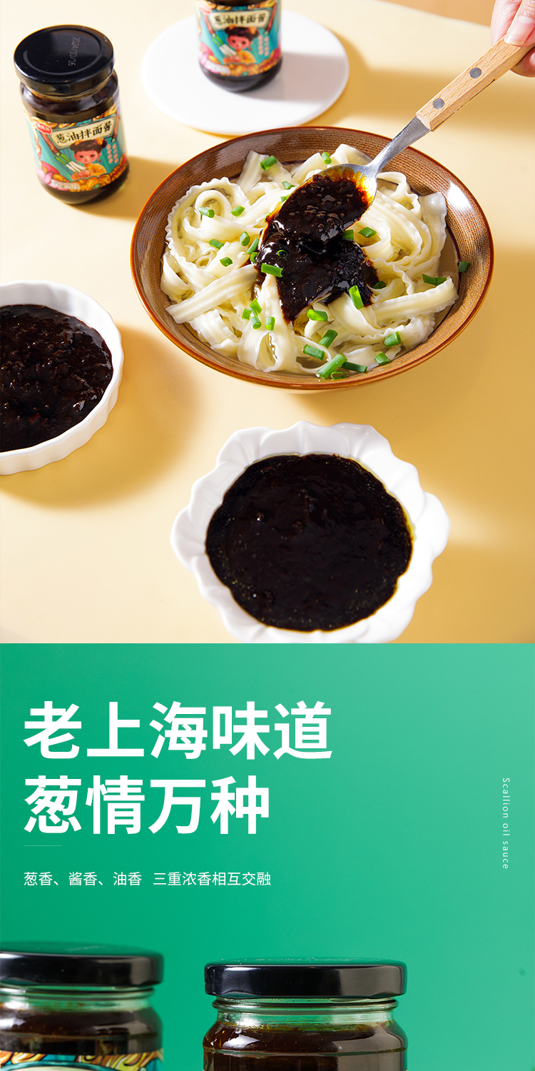 葱油拌面酱配料表:小葱、酿造酱油(含焦糖色)、植物油(含TBHQ)、洋葱、耗油、白砂糖、食用盐、沥干物≥20%。