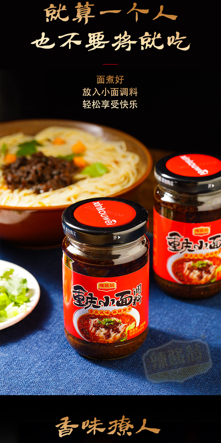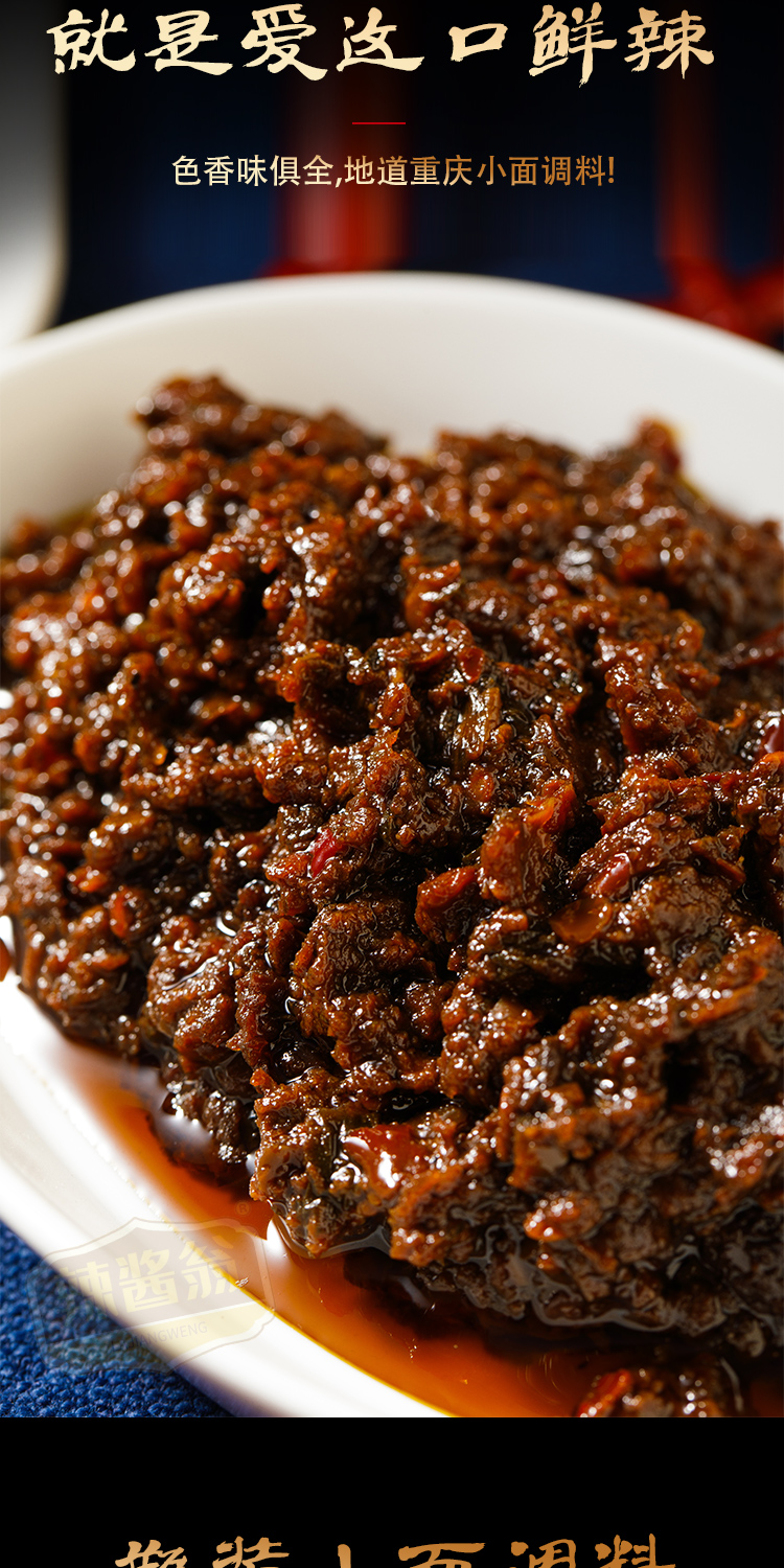 重庆小面调料酱:大豆油、芽菜、黄豆酱(水、大豆、小麦粉、食用盐)、辣椒、洋葱、姜、大蒜、白砂糖、芝麻、味精、香辛料、山梨酸钾。