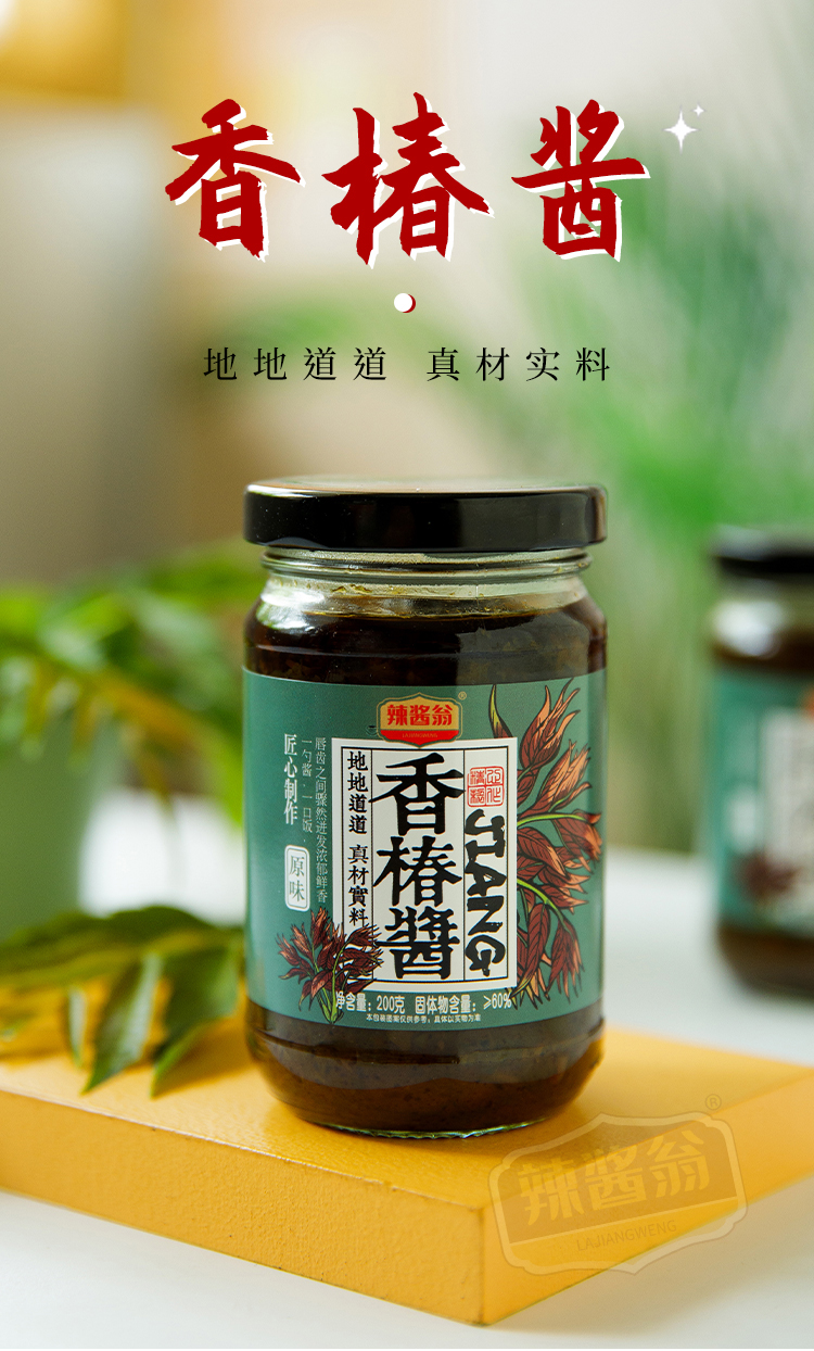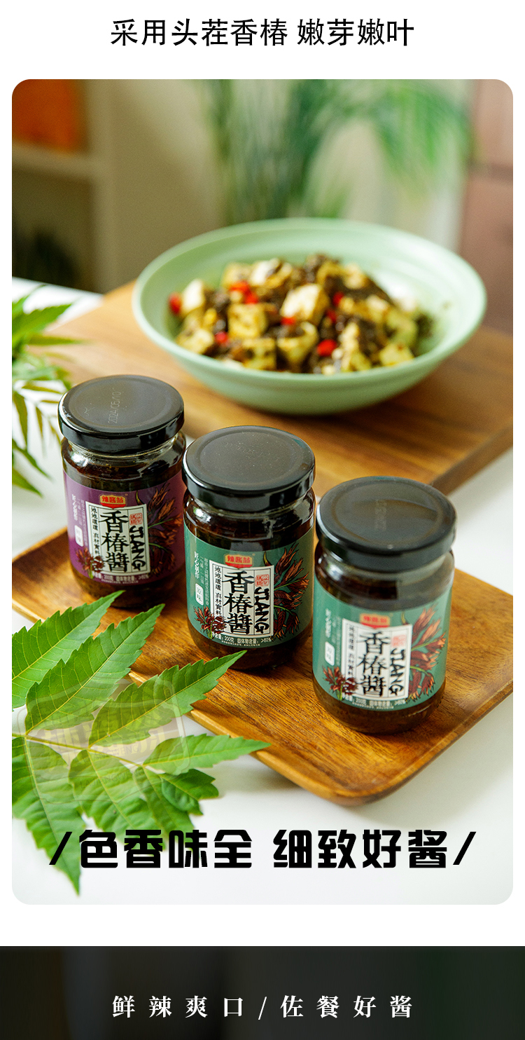 香椿酱配料表:大豆油、香椿、黄豆酱(水、大豆、小麦粉、食用盐)、白砂糖、味精、山梨酸钾。