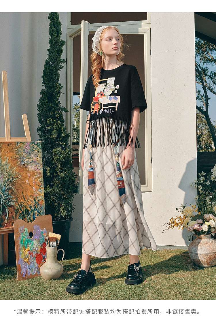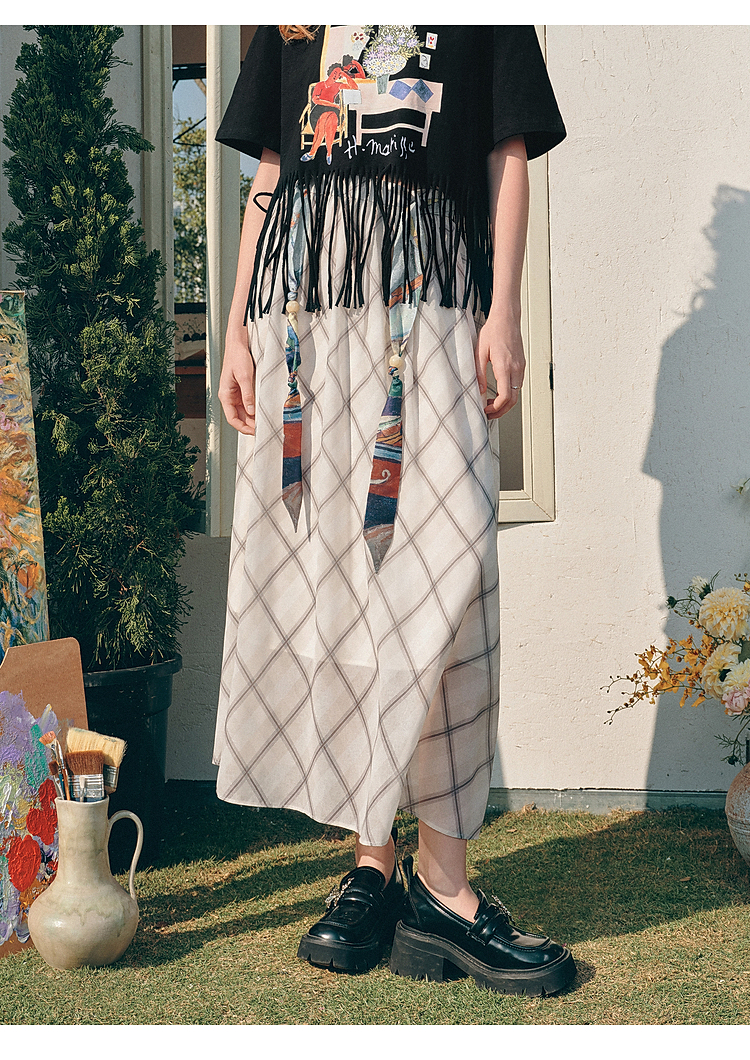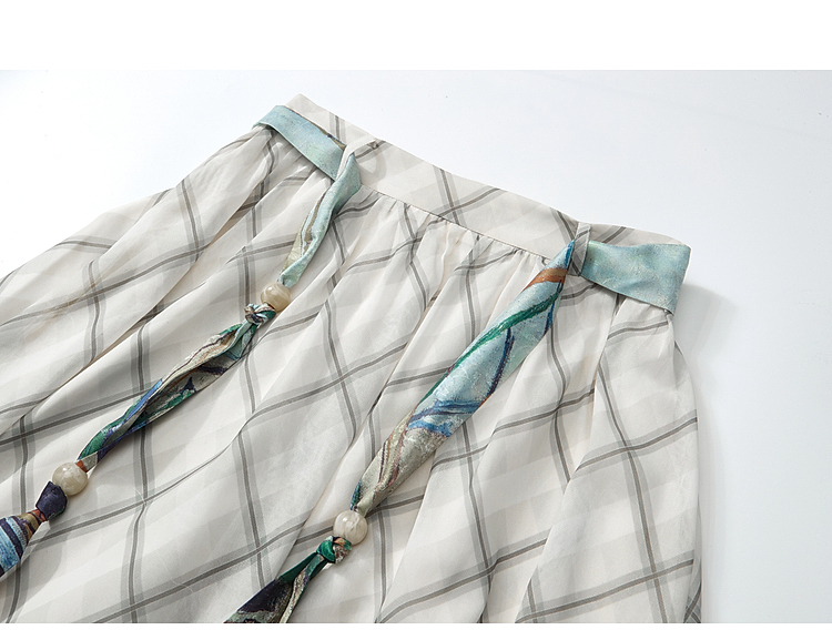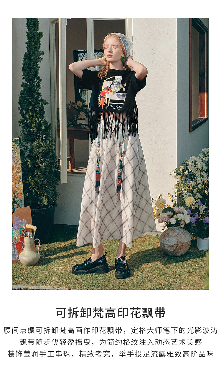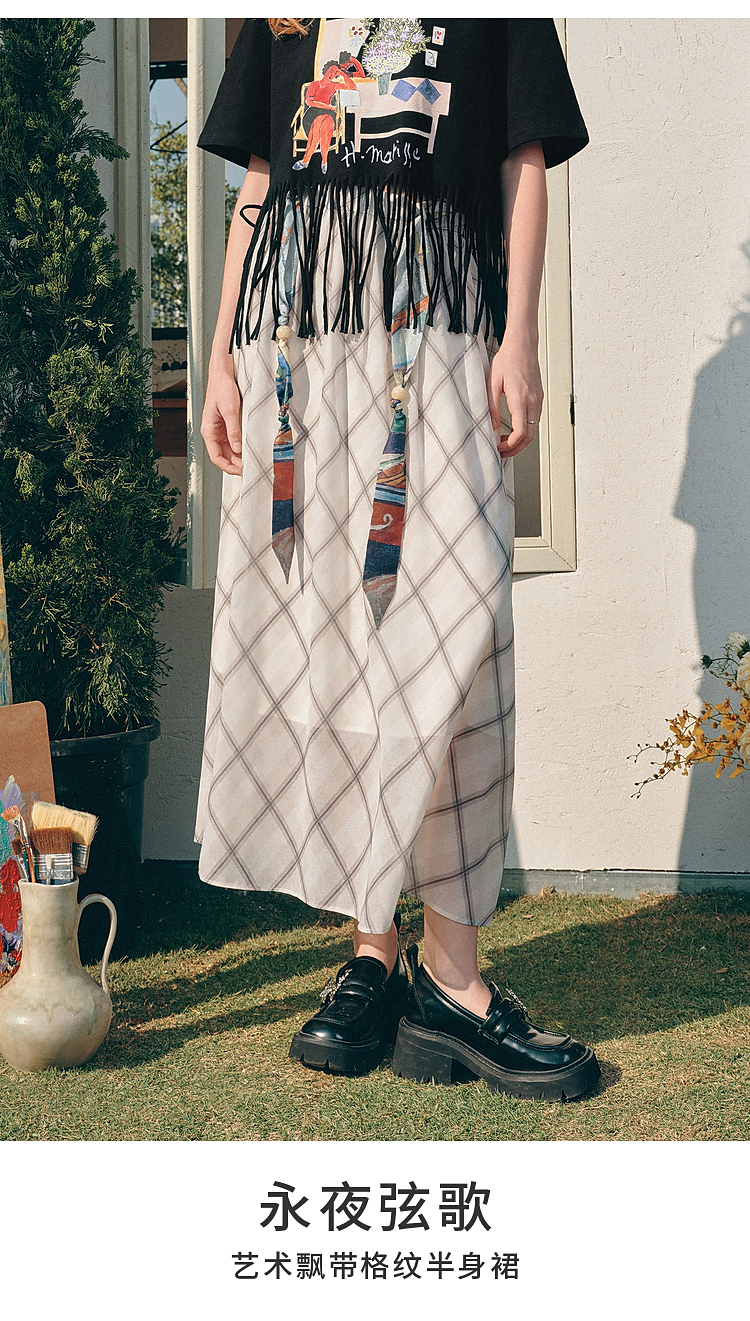 两三事 永夜弦歌 2026春季新款民族风可拆卸印花飘带格子半身裙