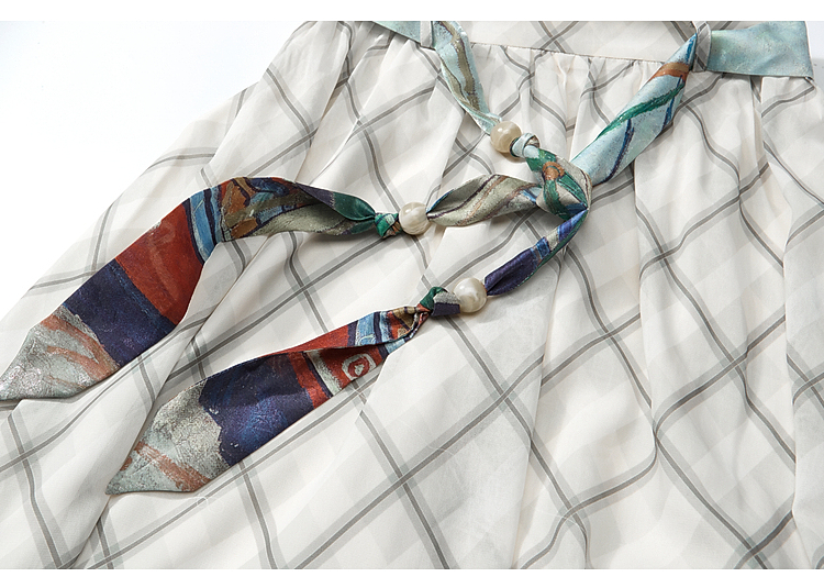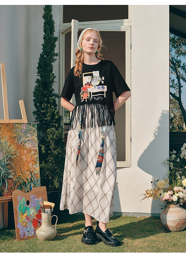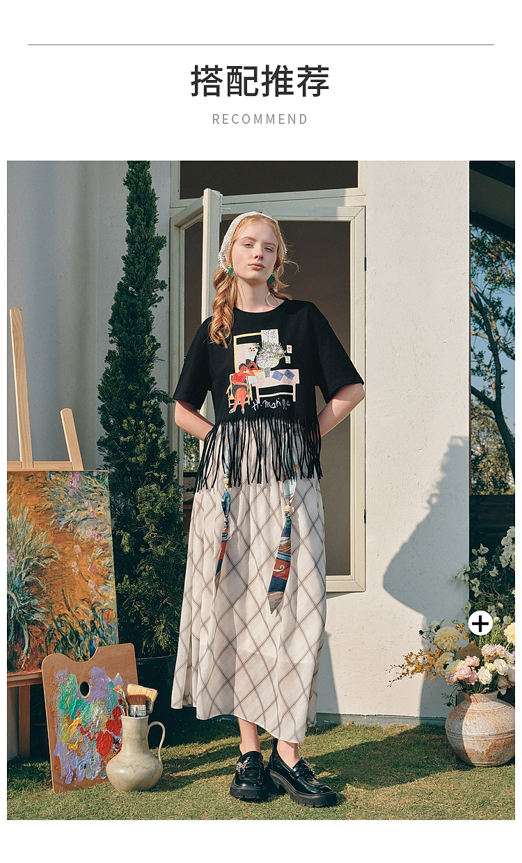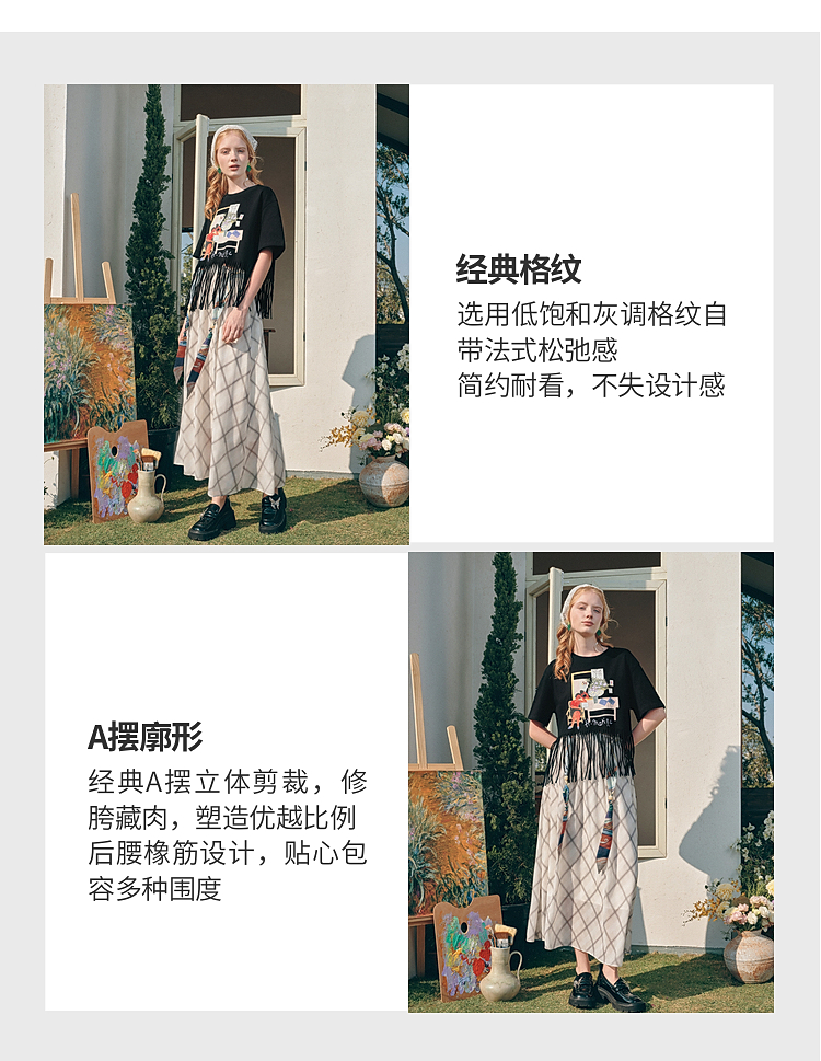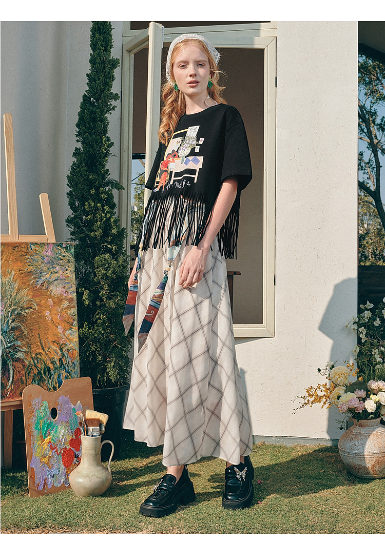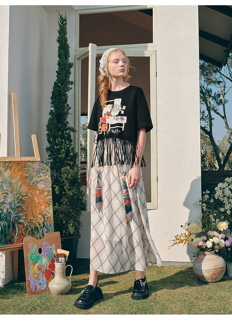 两三事 永夜弦歌 2026春季新款民族风可拆卸印花飘带格子半身裙