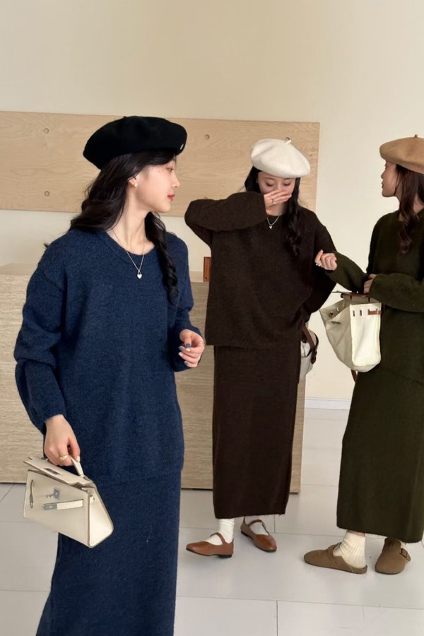 Le Malene 羊毛针织圆领毛衣过膝半裙套装 21425