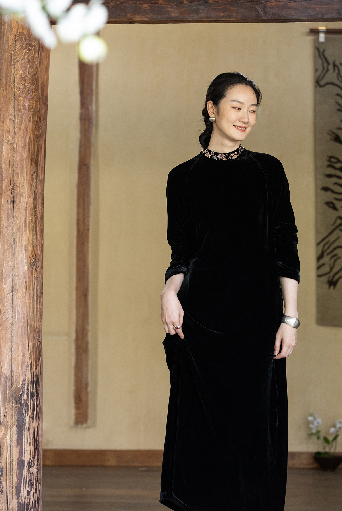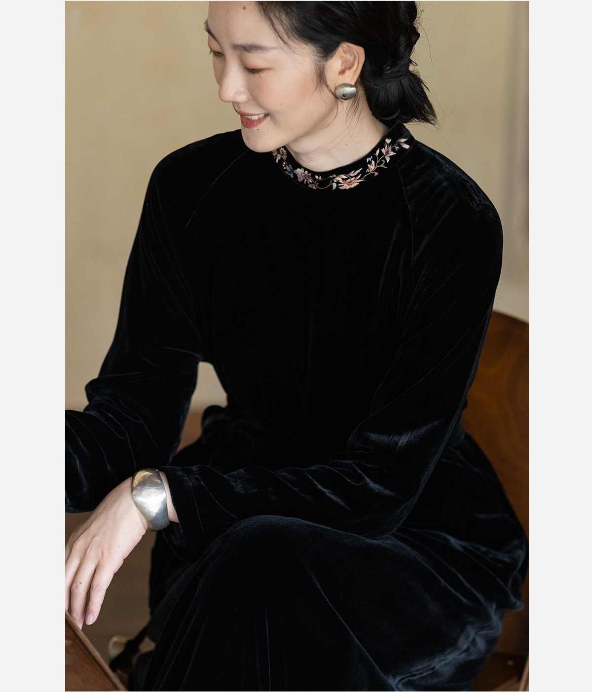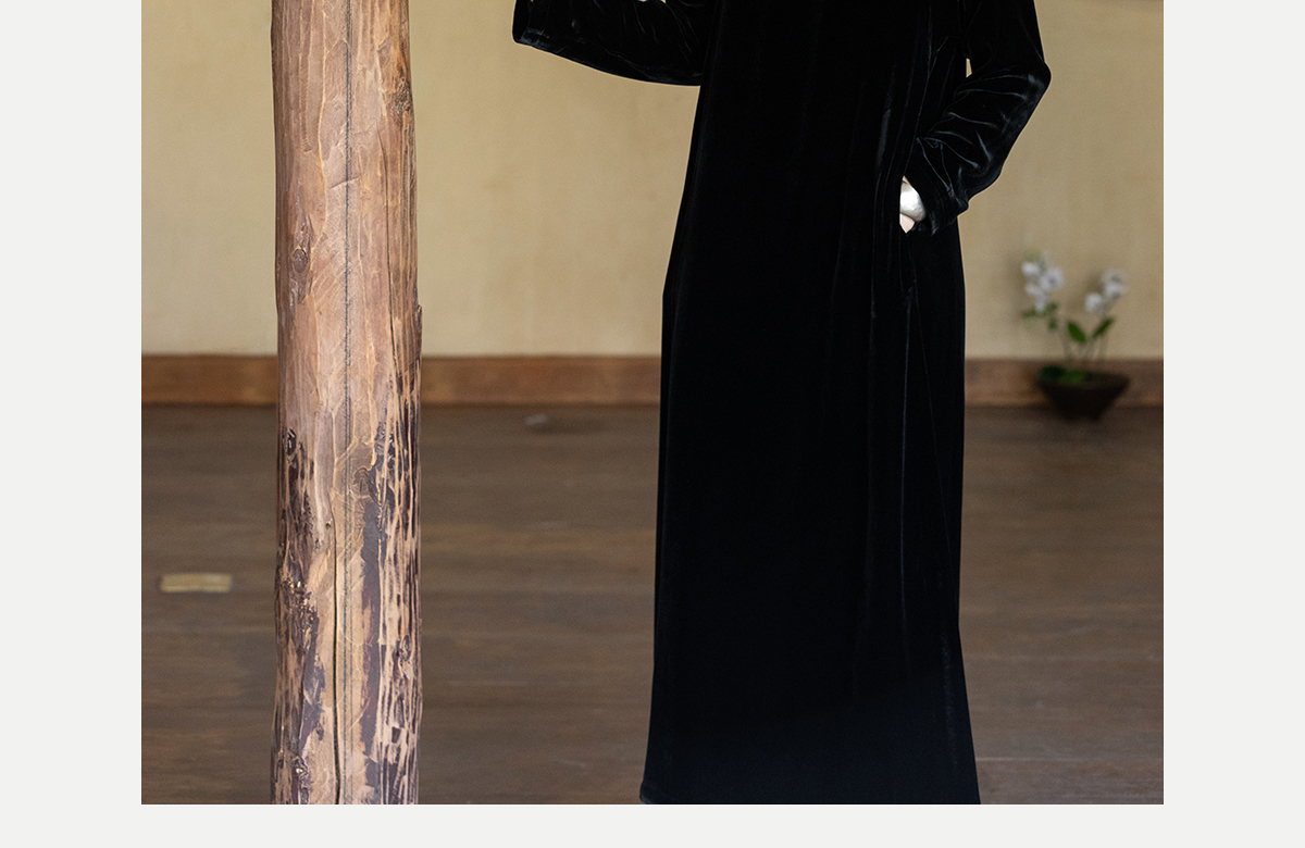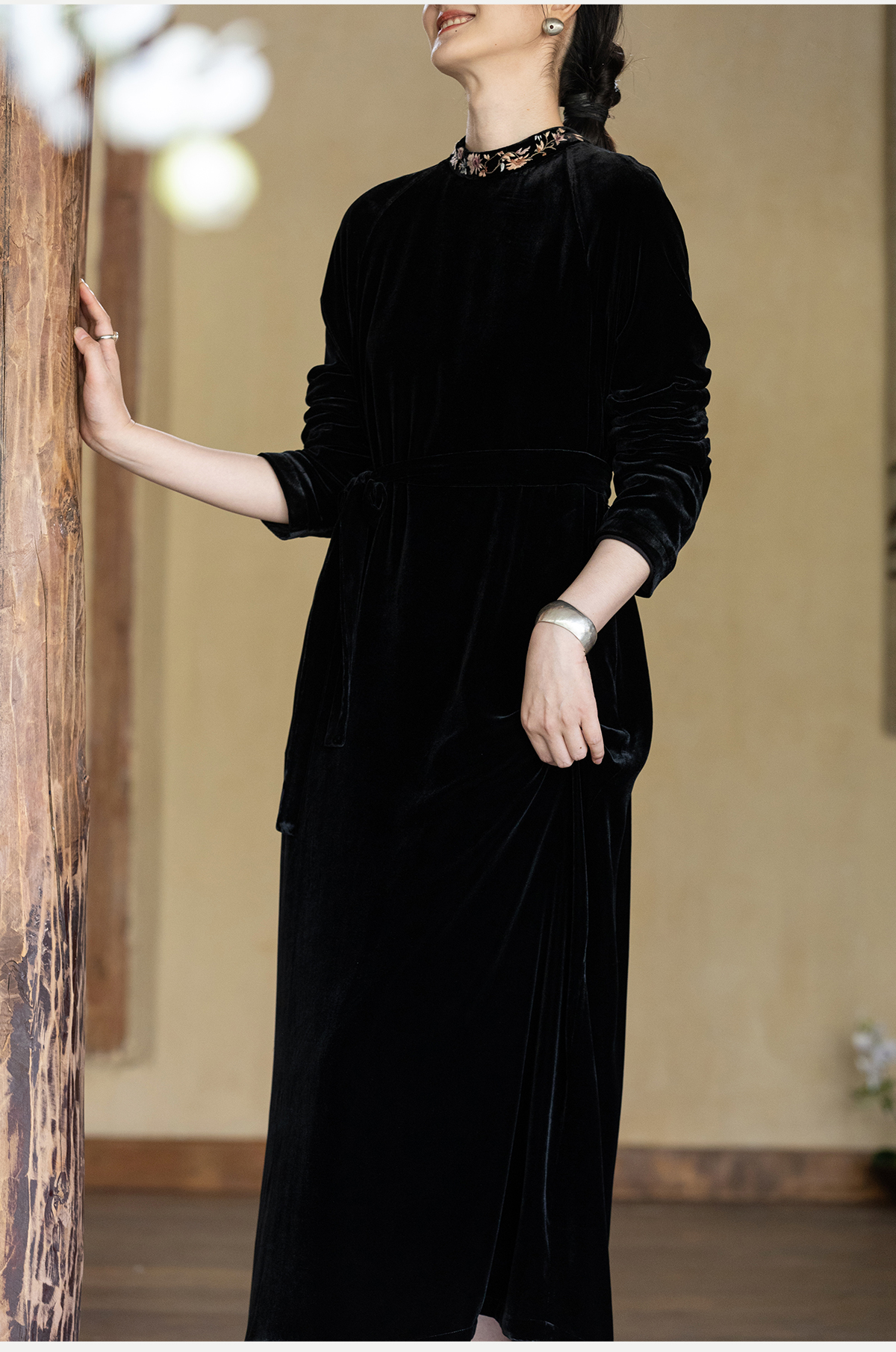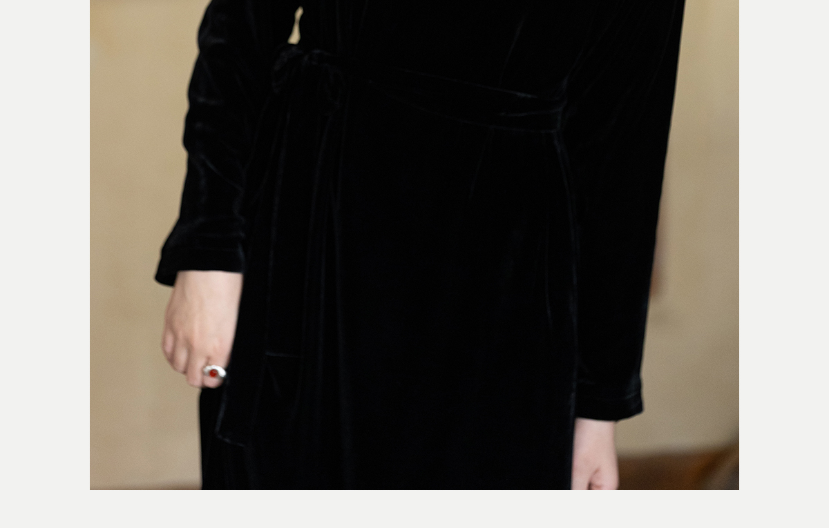 牧衣游原创 丝绒手工刺绣连衣裙黑色高级感宽松复古气质长裙 迎岚