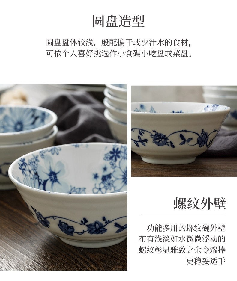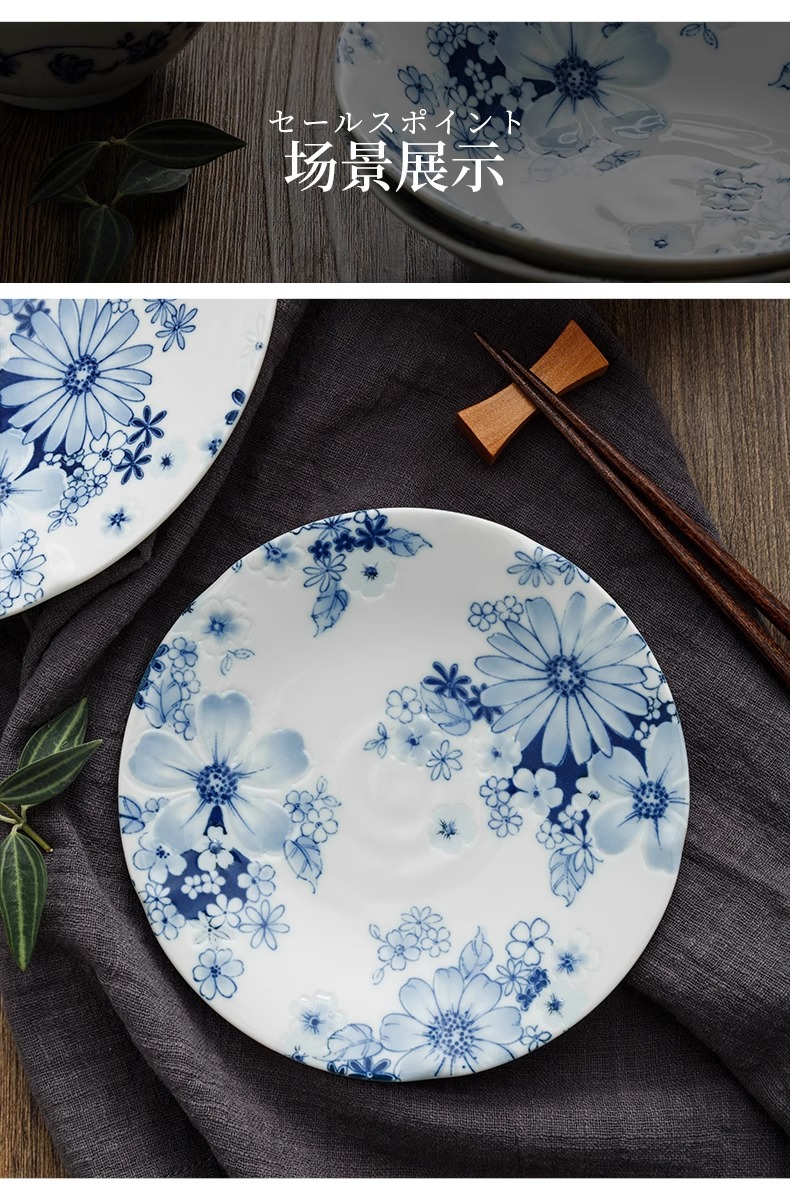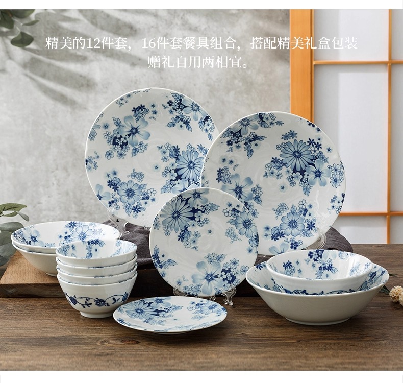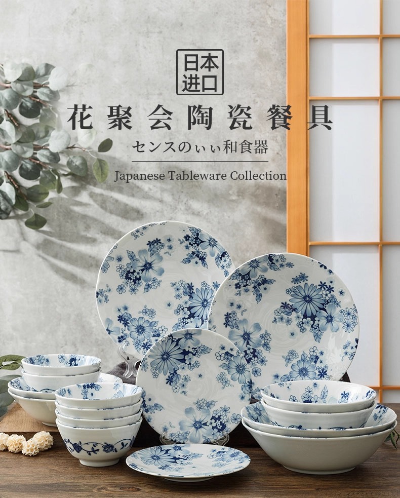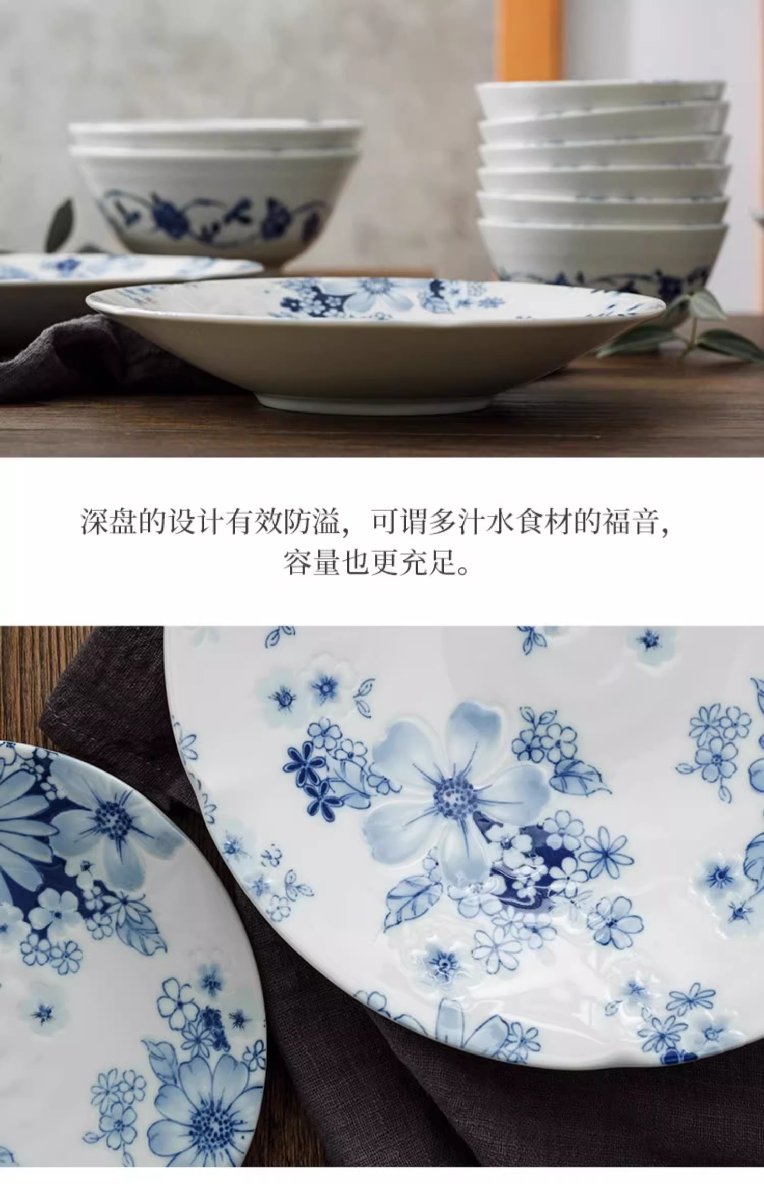 日本进口花集碗家用深盘碟子有古窑菜盘日式餐具青花瓷盘子有古窯花聚会12件套装
