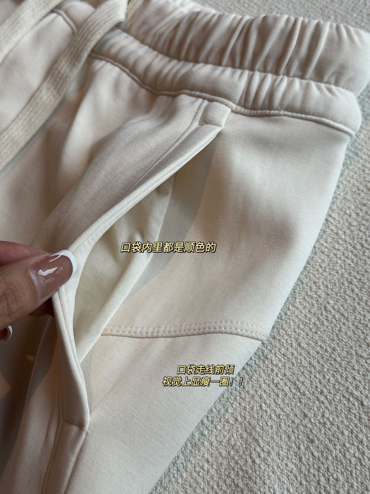 后腰也是一个弧形过来的 更加提臀 拼接在口袋哪里
