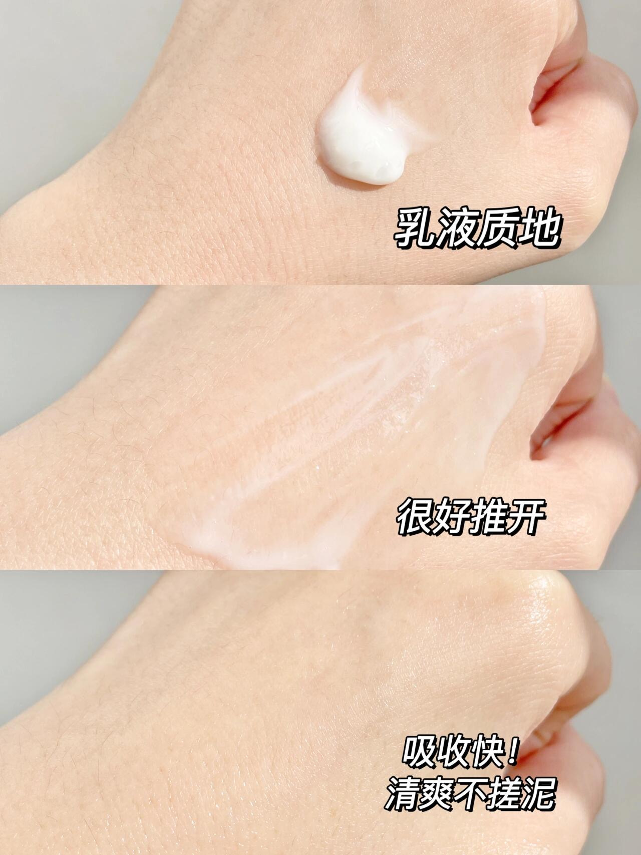 白色乳液型质地,在延展时稍许有一点润感
