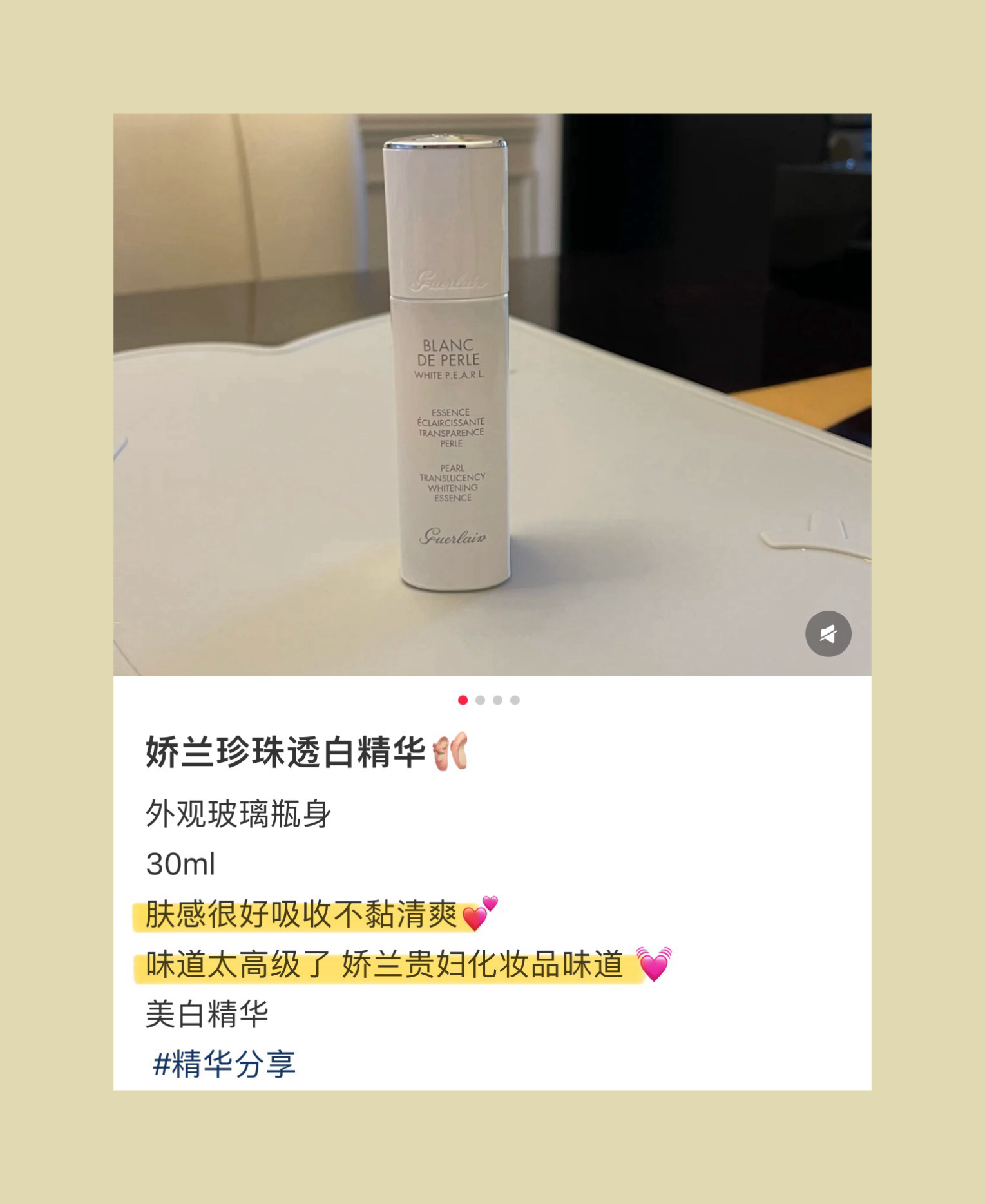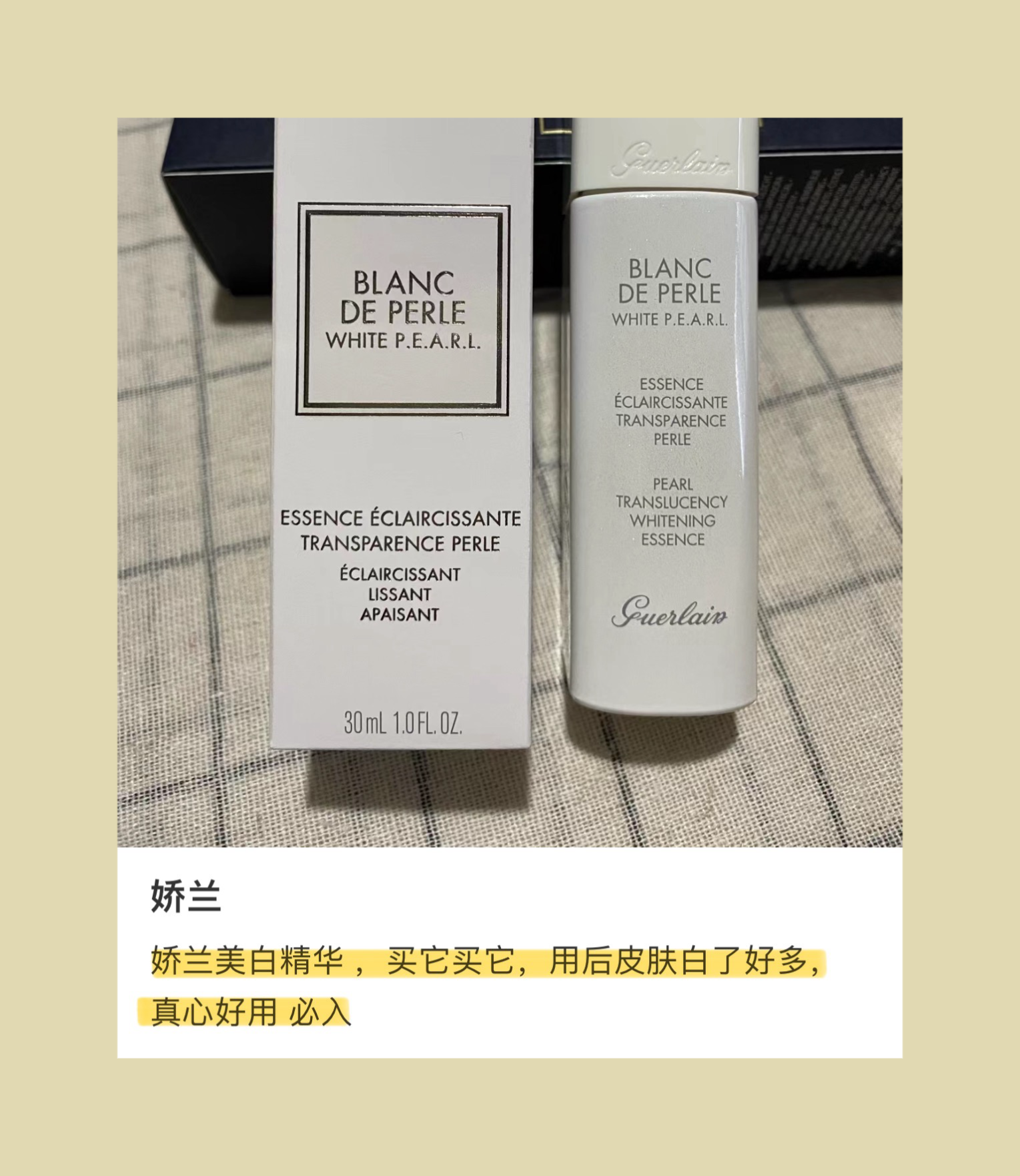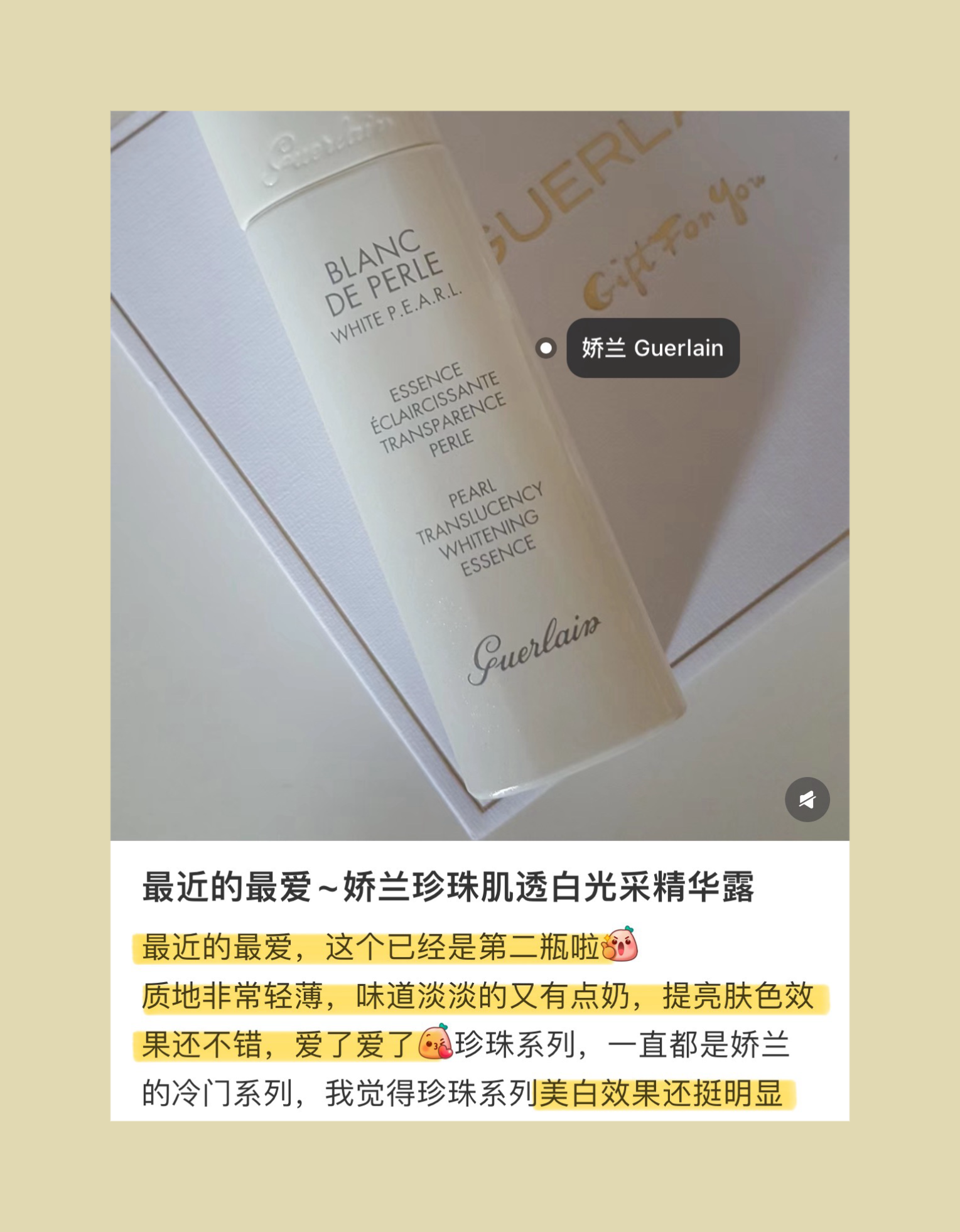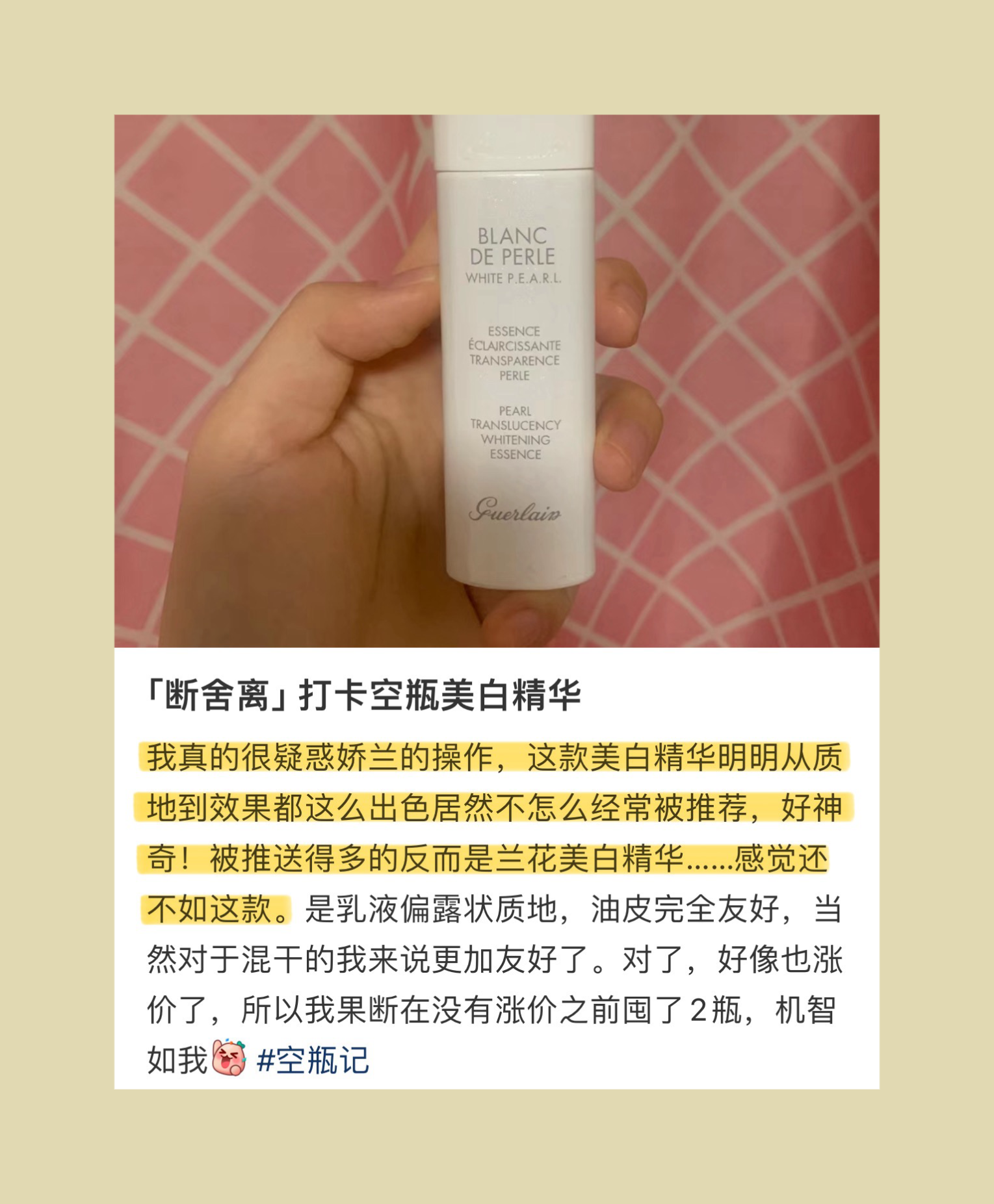 “我真的很疑惑娇兰的操作,这款美白精华明明从质地到效果都这么出色!居然不怎么经常被推荐,好神奇!被推送得多的反而是兰花美白精华……感觉还不如这款。是乳液偏露状质地,油皮完全友好!”
