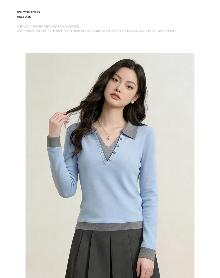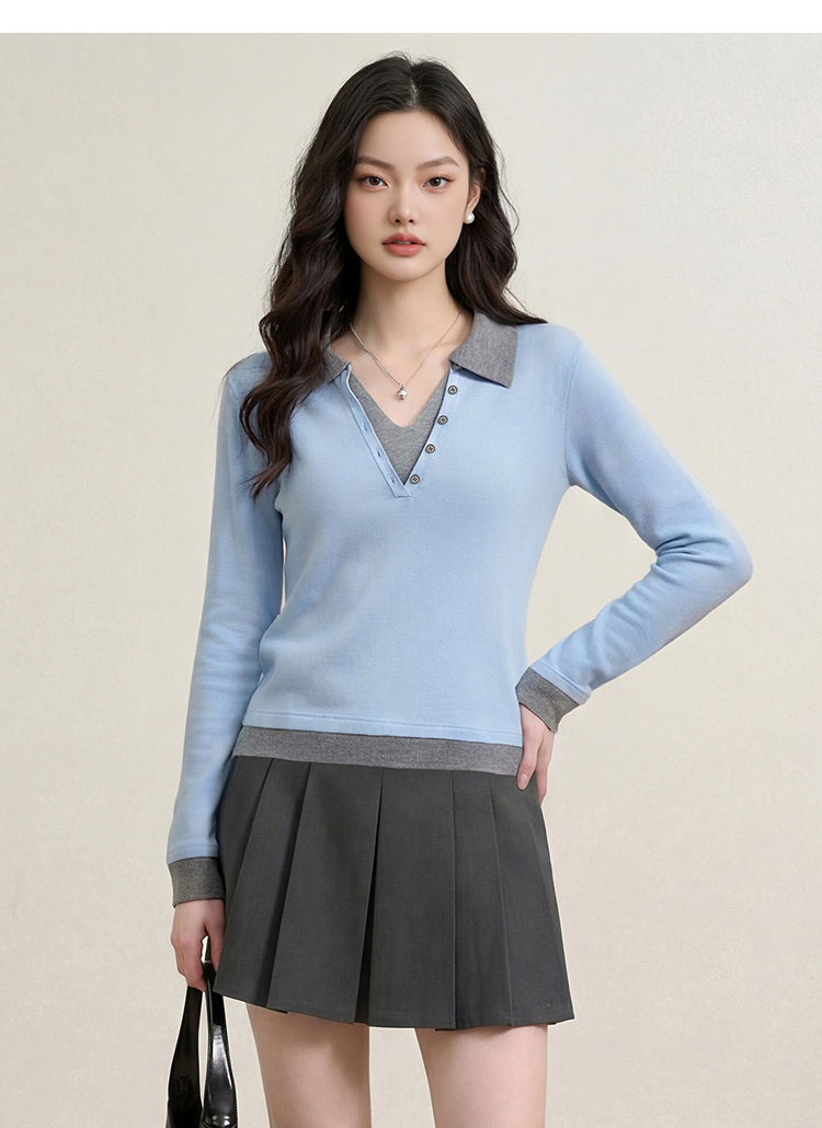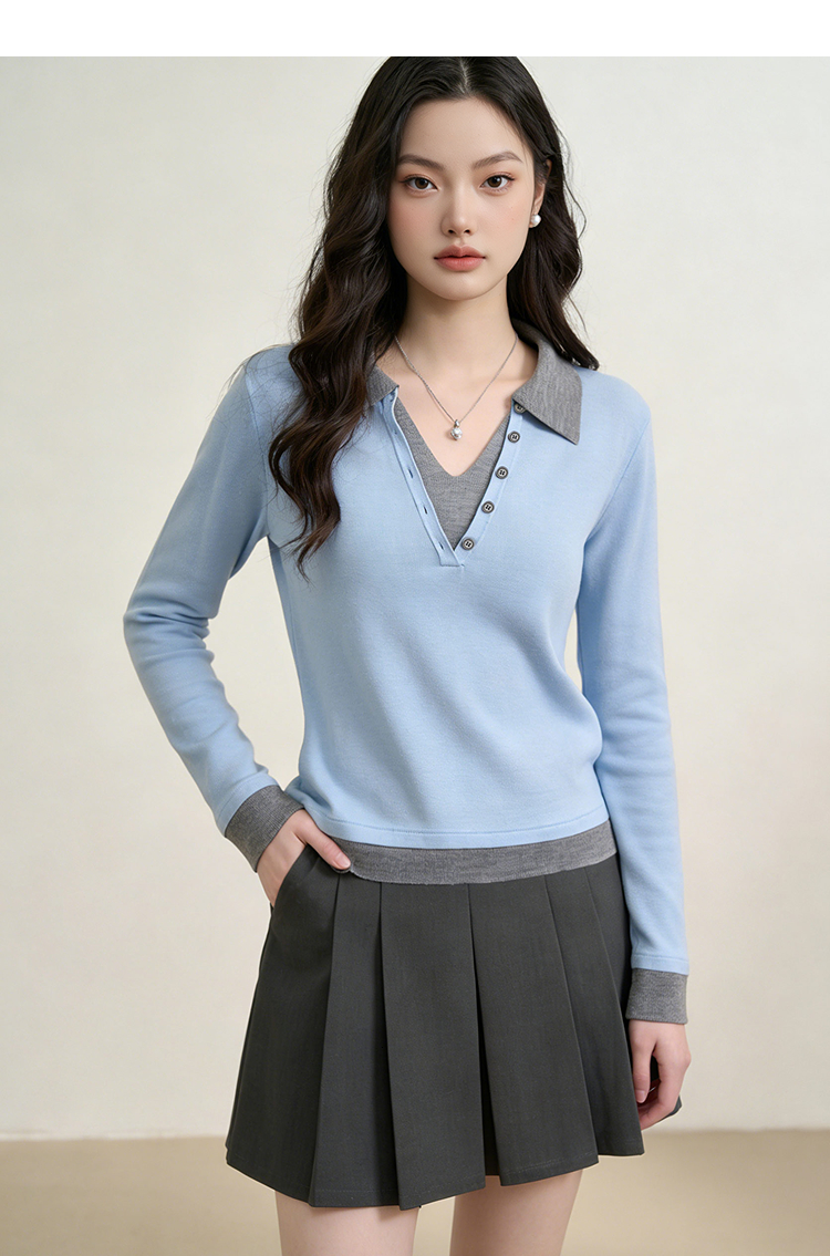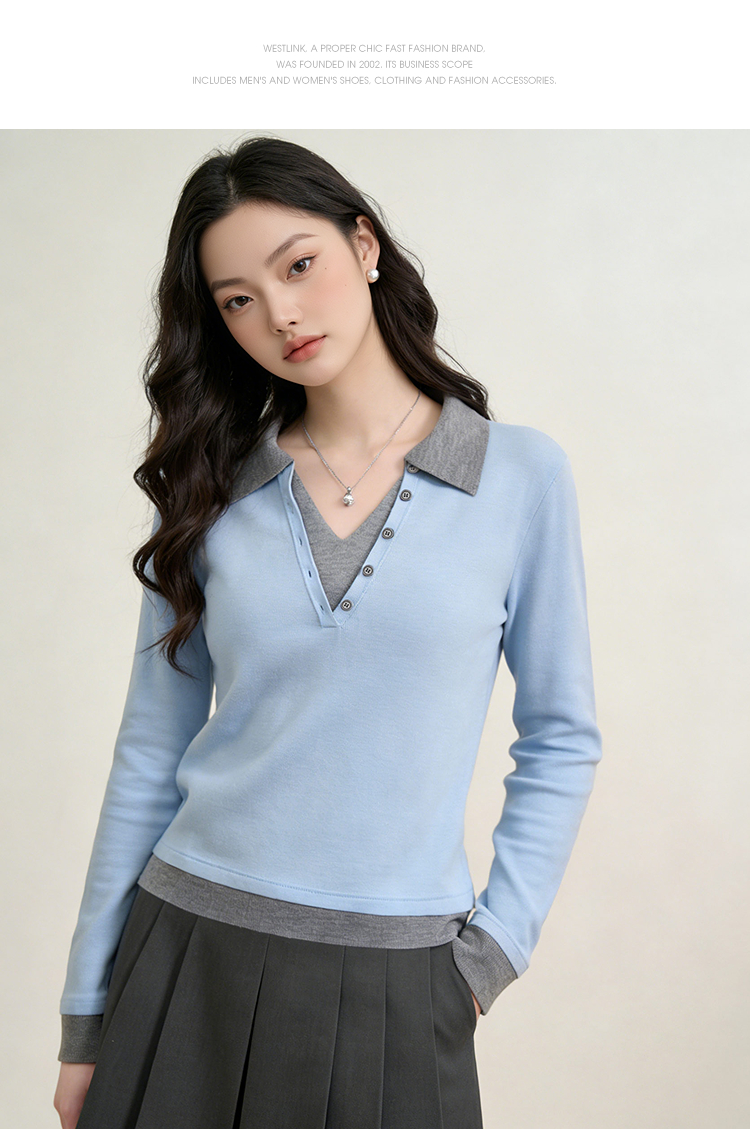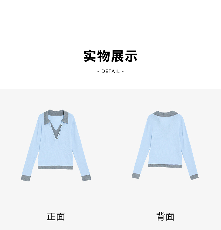 西遇复古修身假两件针织衫女2026年春季新款翻领撞色显瘦长袖毛衣10260068