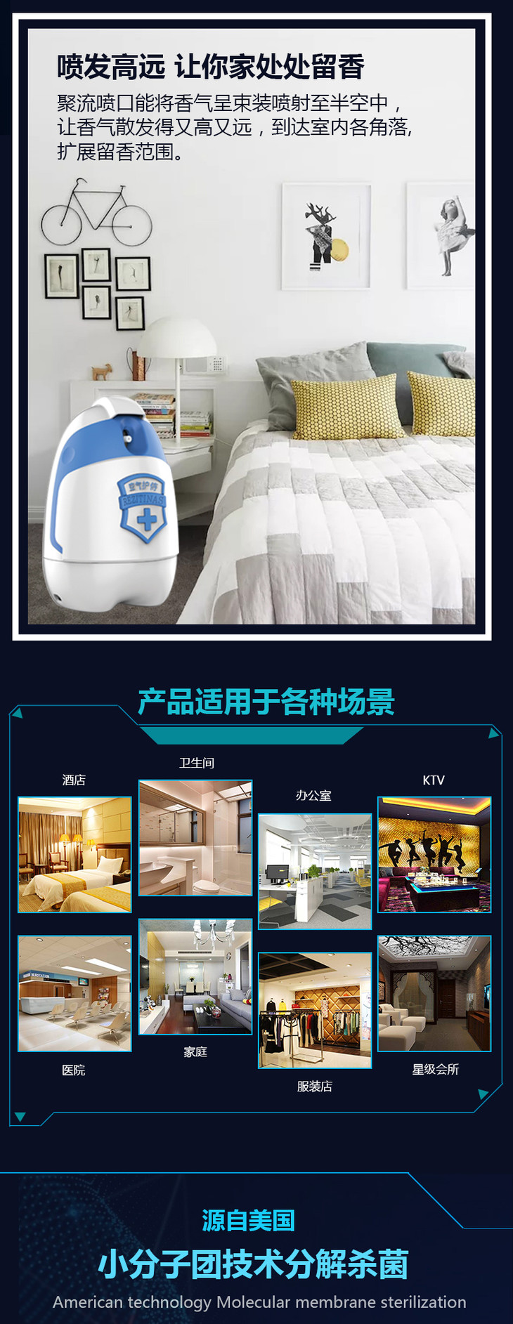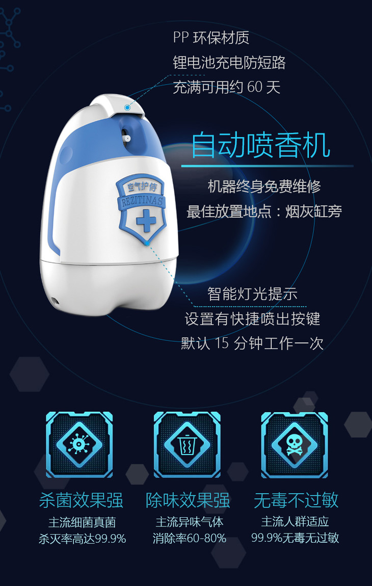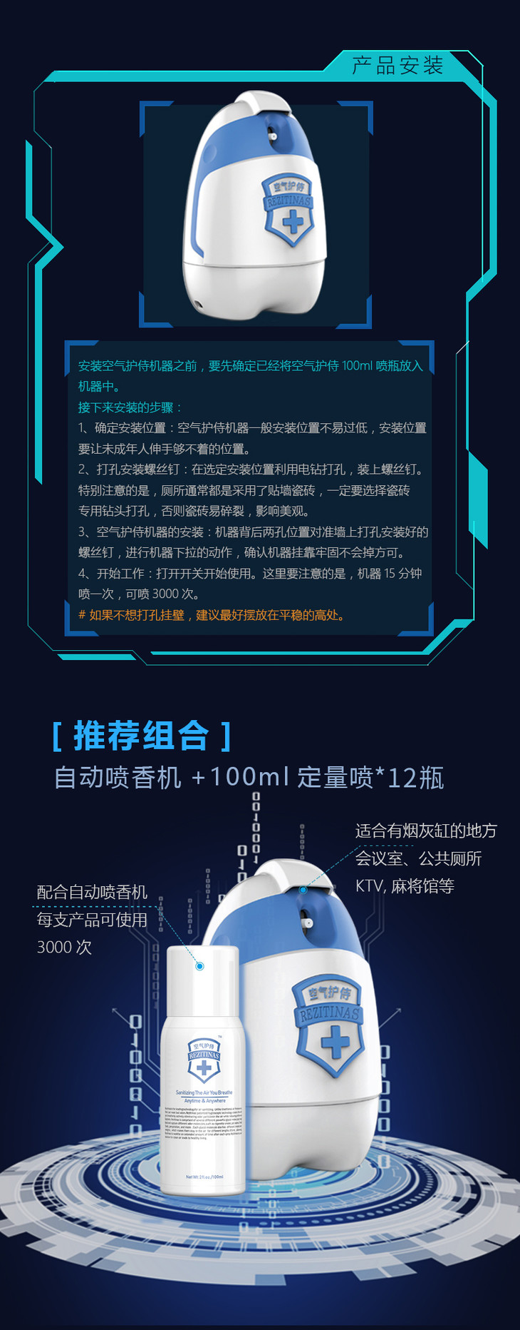 使用注意:机器只能安装100ml全自动喷射,每15分钟喷一次,可喷3000次自动喷的有效范围为30平米到50平米整体空间。