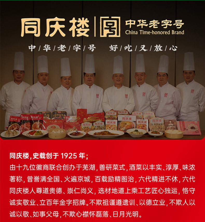 - 同庆楼品牌始创于1925年,是中华老字号,安徽和江苏两省餐饮龙头企业;是中国餐饮上市企业,百强企业,荣获多项荣誉,深受各方关注和好评,赢得海内外宾客广泛赞誉。