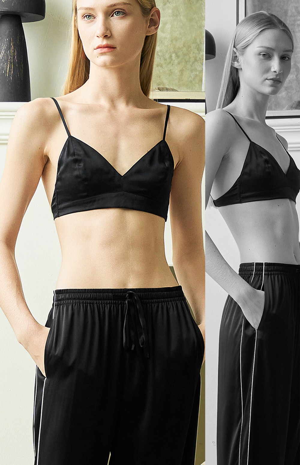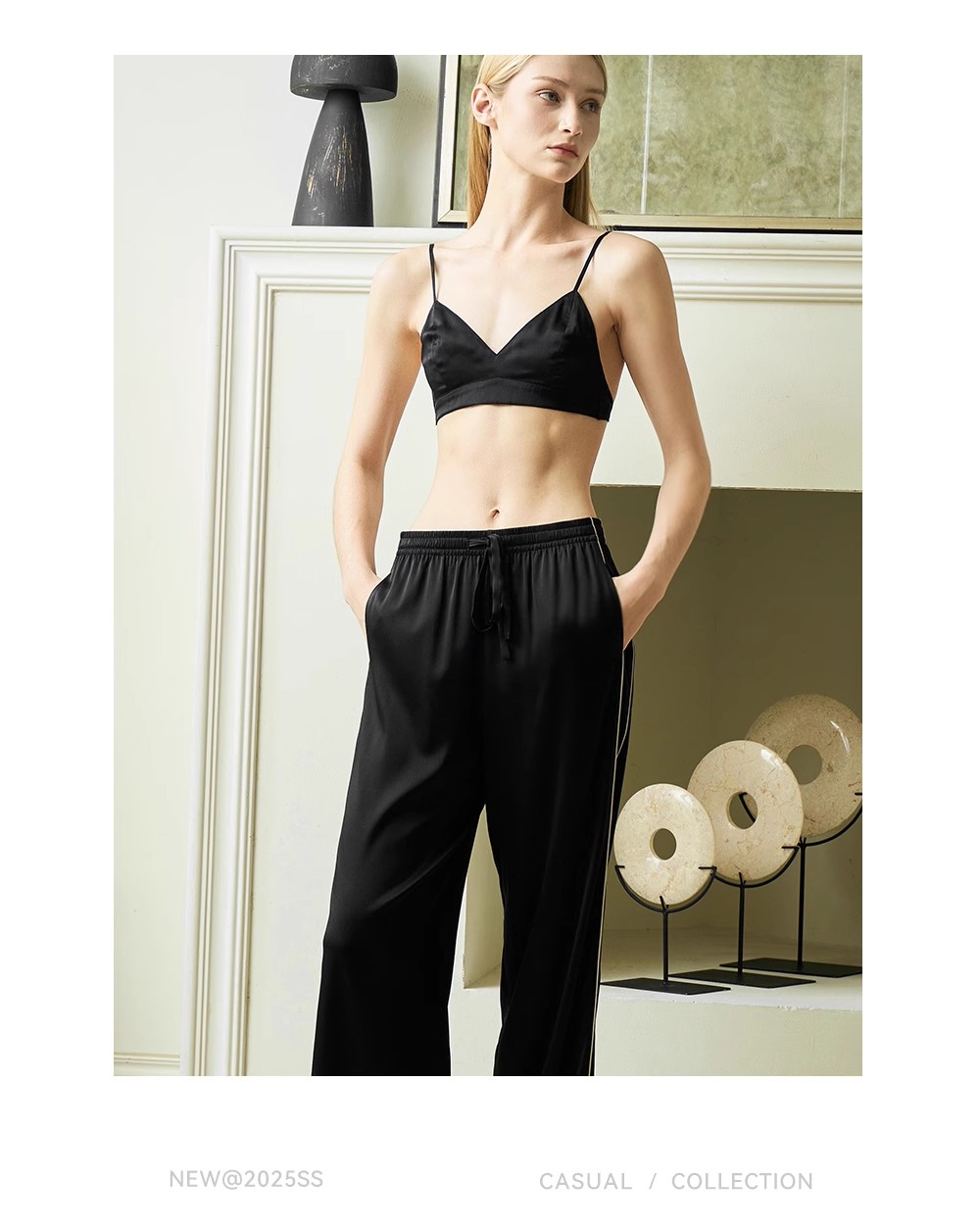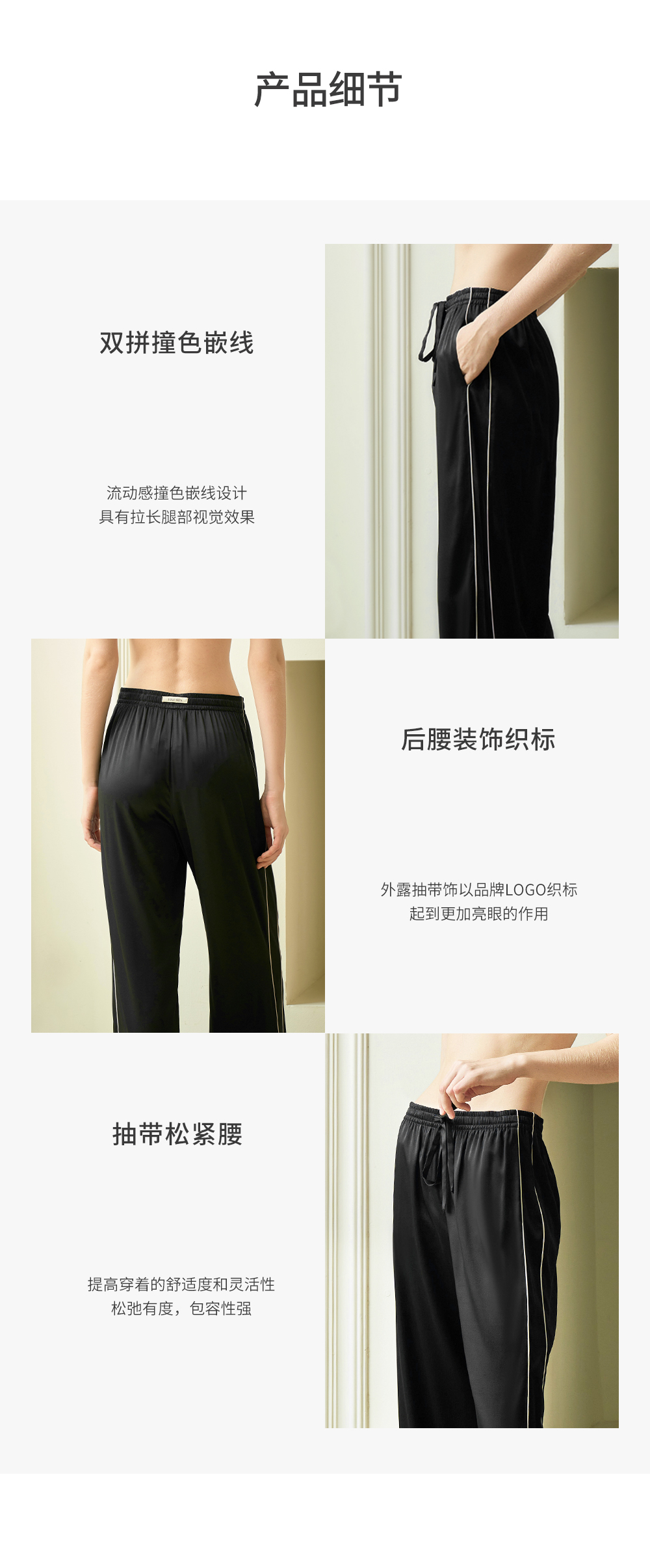 Solo seta女士桑蚕丝长款家居服纯色丝绸中高腰黑色直筒裤可外穿