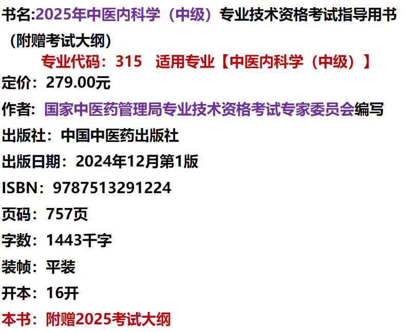 2025年中医内科学(中级)专业技术资格考试指导用书 专业代码315 国家中医药管理局专业技术资格考试专家委员会 中国中医药出版社