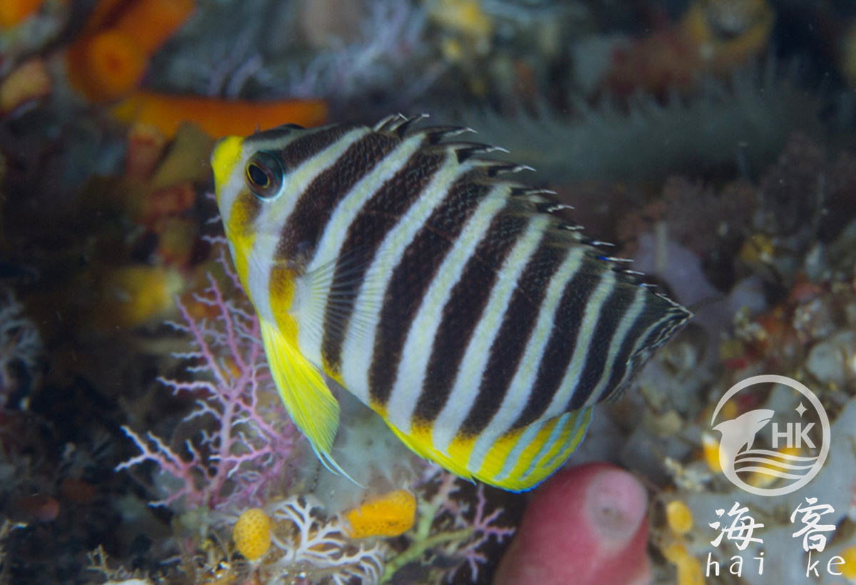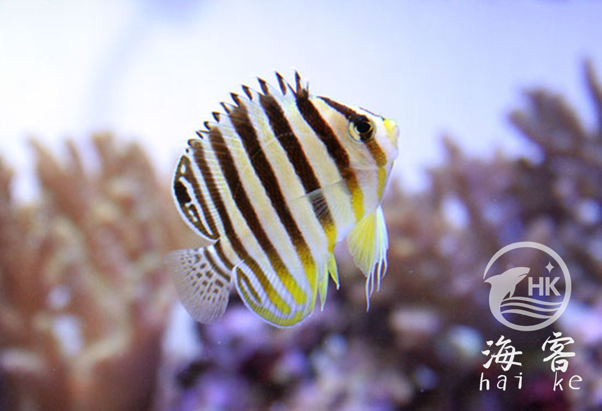 也叫八线新娘神仙。黑条纹与黄条纹独立的排列在身体上,像现在流行的T恤。在每条黑条纹外边包裹着白色。尾巴是白色到黄色过渡带细黑条纹。幼鱼与成鱼的区别在于其背鳍上有一蓝色的眼点。