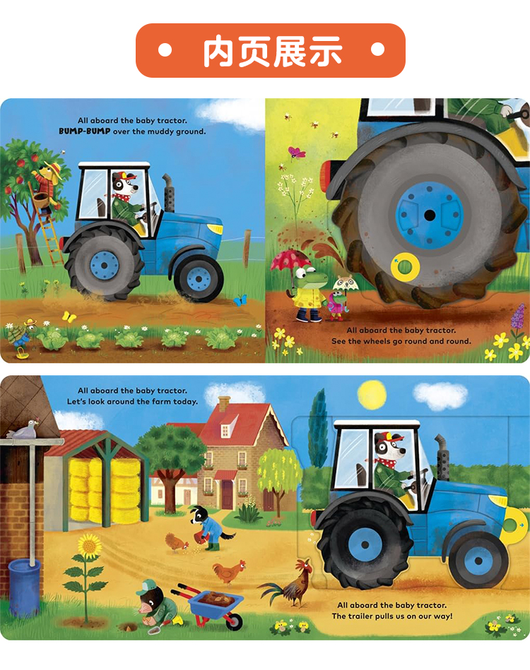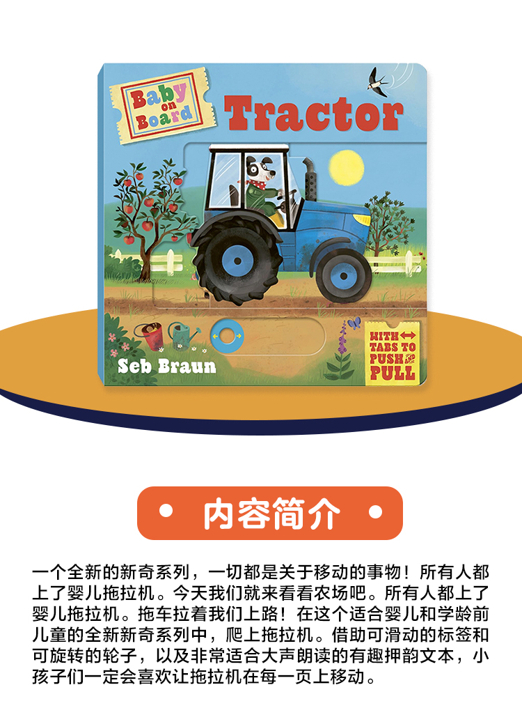 一个全新的新奇系列,一切都是关于移动的事物!所有人都上了婴儿拖拉机。今天我们就来看看农场吧。所有人都上了婴儿拖拉机。拖车拉着我们上路!在这个适合婴儿和学龄前儿童的全新新奇系列中,爬上拖拉机。借助可滑动的标签和可旋转的轮子,以及非常适合大声朗读的有趣押韵文本,小孩子们一定会喜欢让拖拉机在每一页上移动。