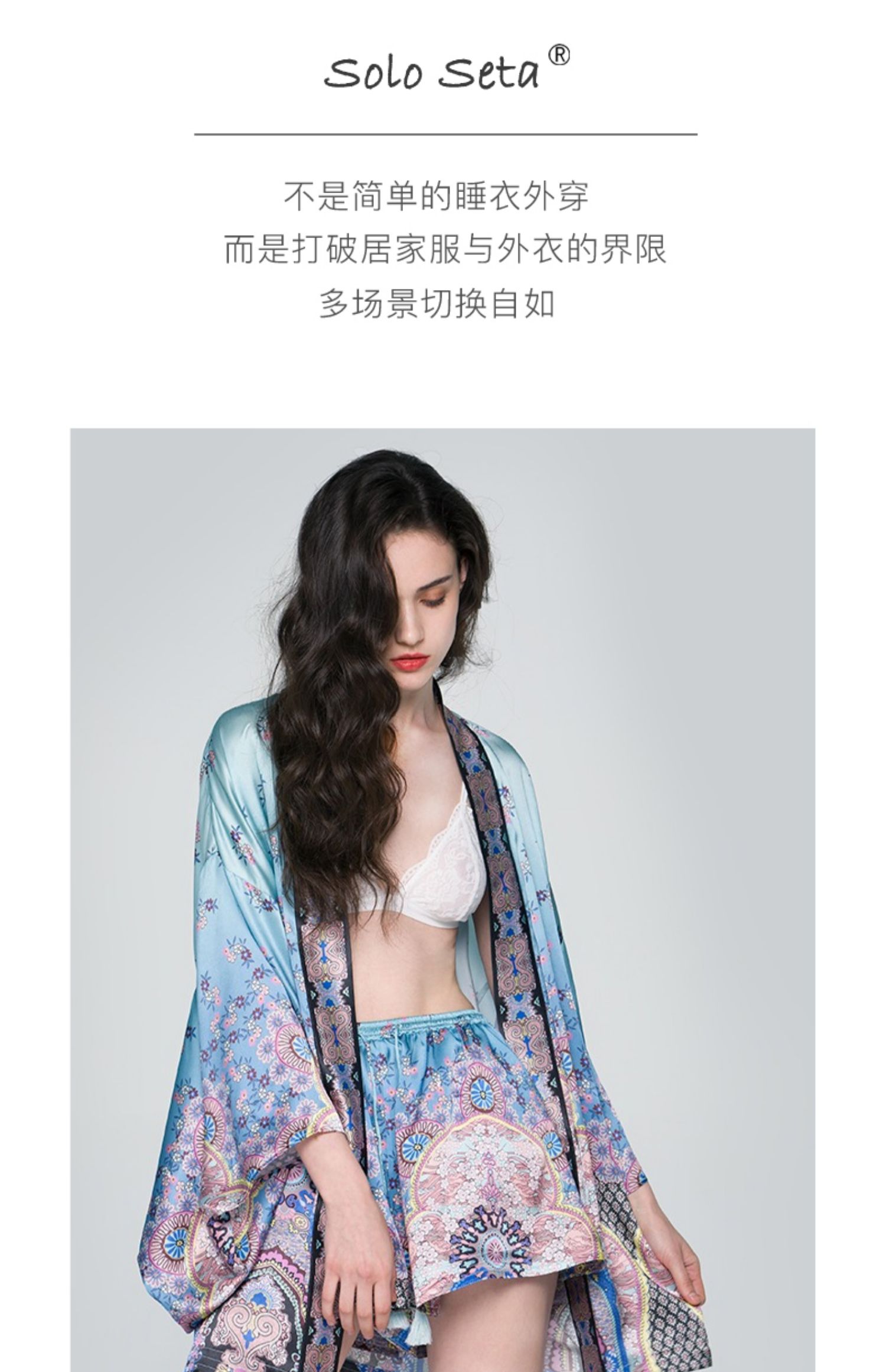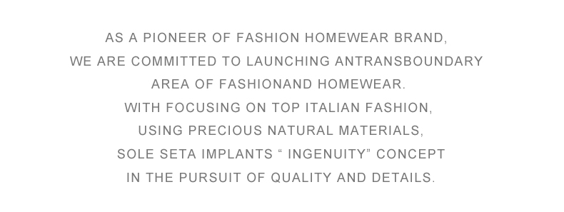 - soloseta专注于真丝织物,灵感源自意大利语,中文含义为“只做真丝”的意思。让睡衣变时尚,居家和外出瞬间切换,使其更具有出街,度假,参加宴会等功能。