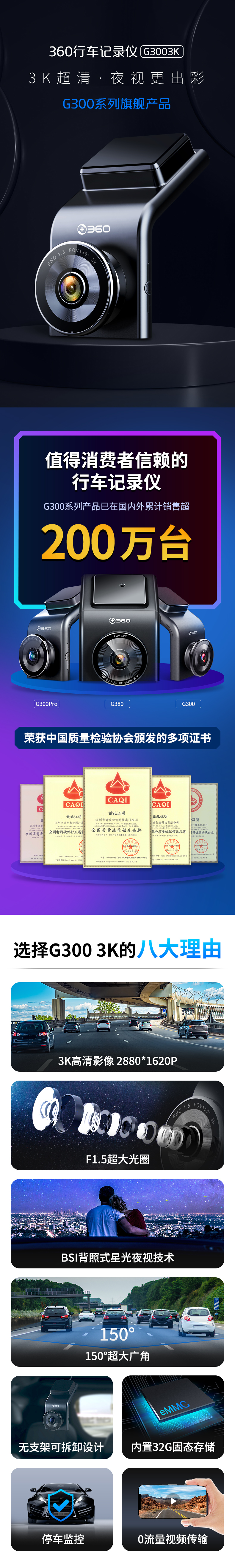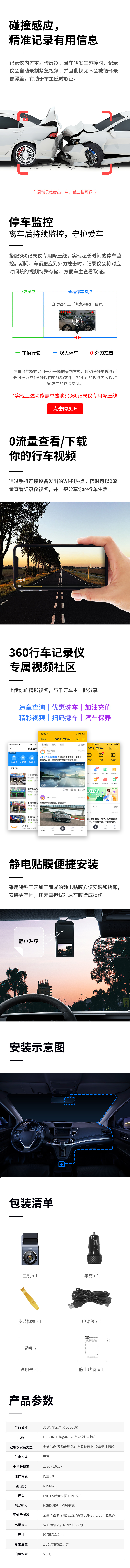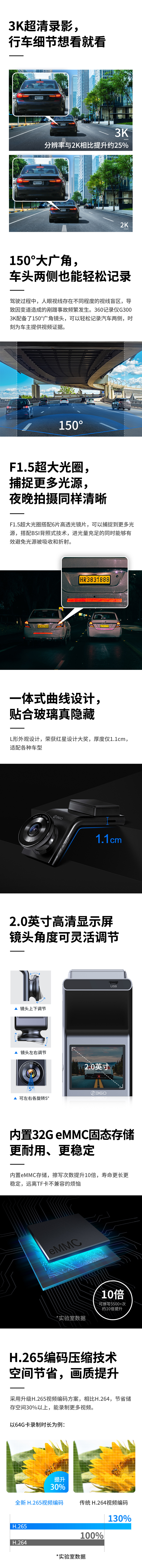 360行车记录仪 G300 3K版 迷你隐藏 3K高清拍摄 星光夜视 一体式设计(内置32G存储)
