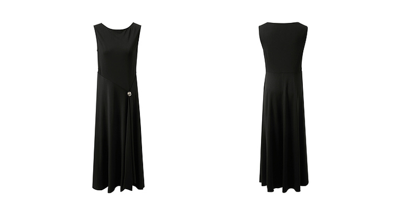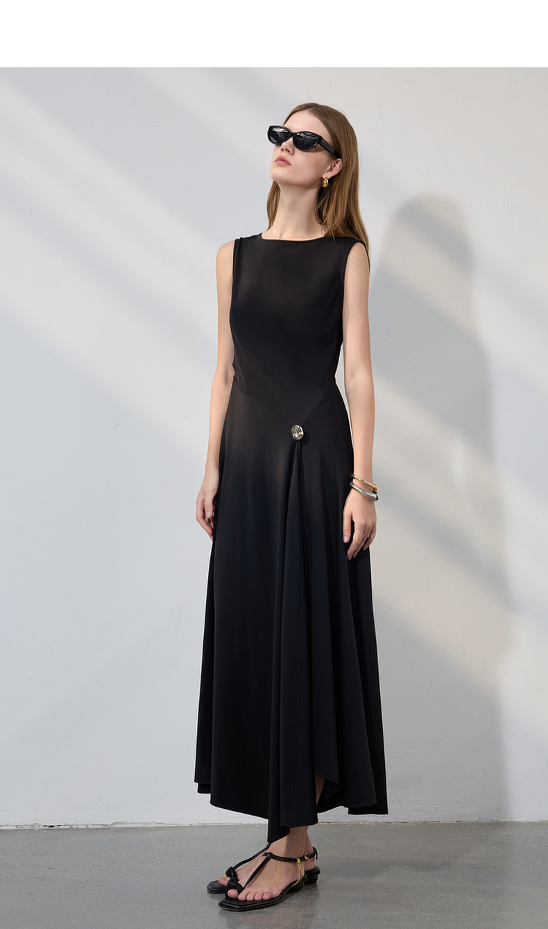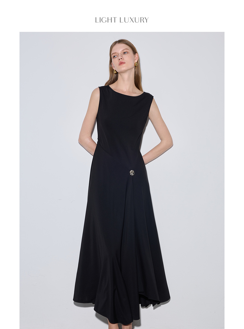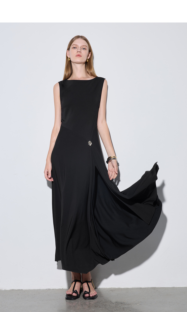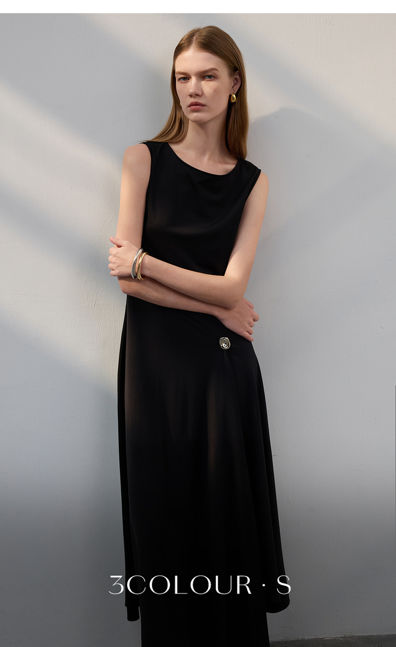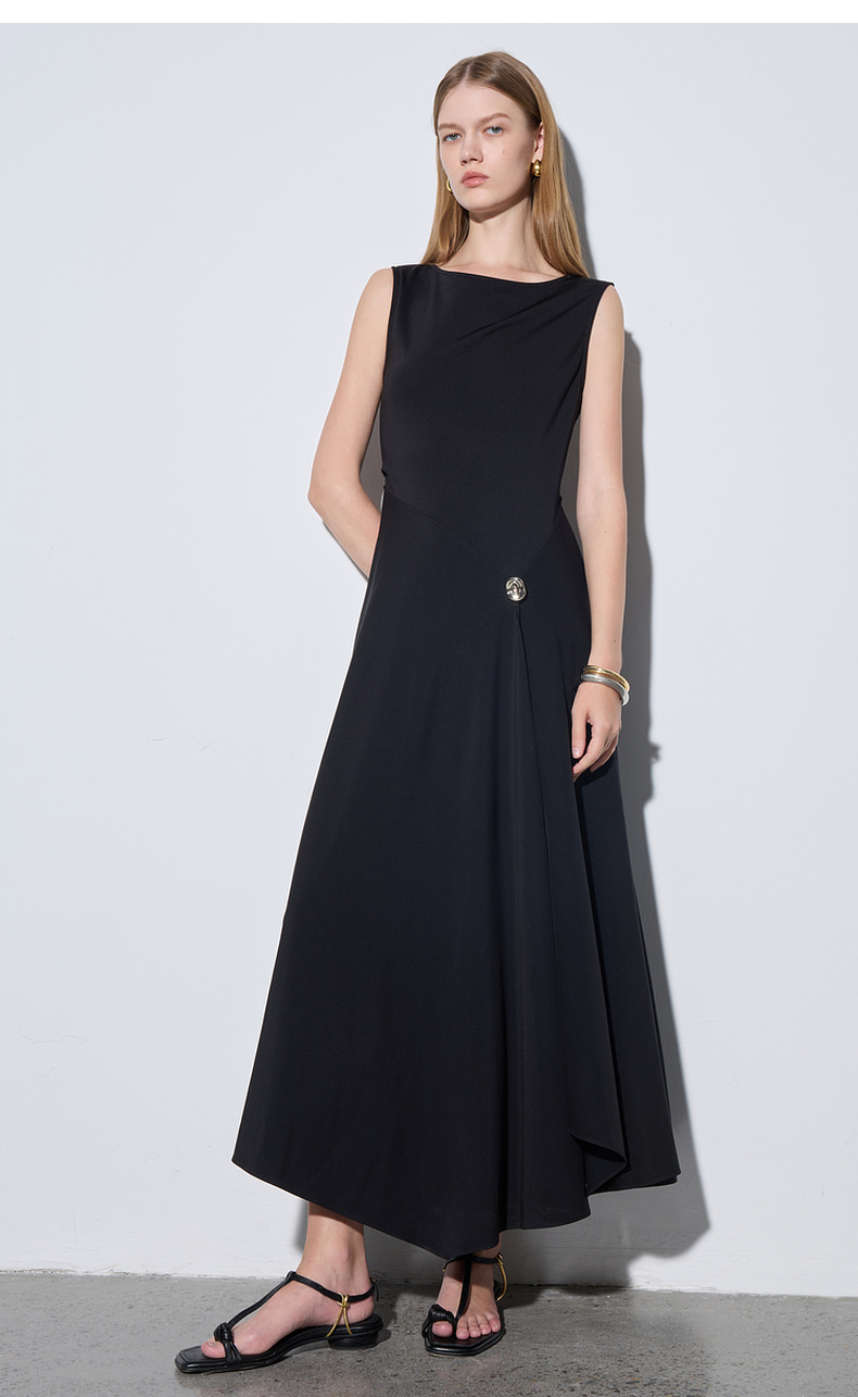三彩2025夏季新款醋酸连衣裙一字领无袖A字裙收腰长裙优雅S