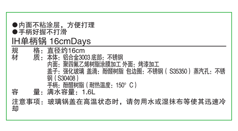 电磁炉用单柄锅 Days 16cm/18cm/20cm